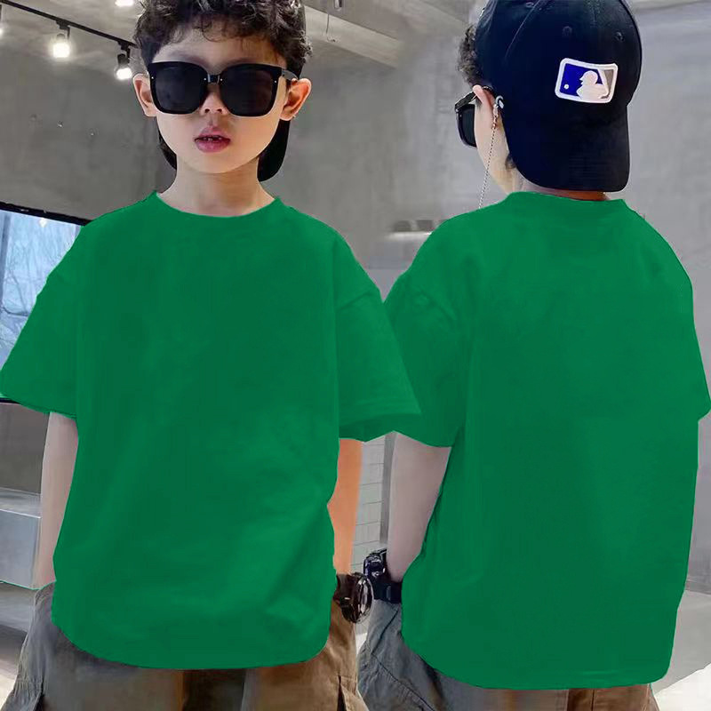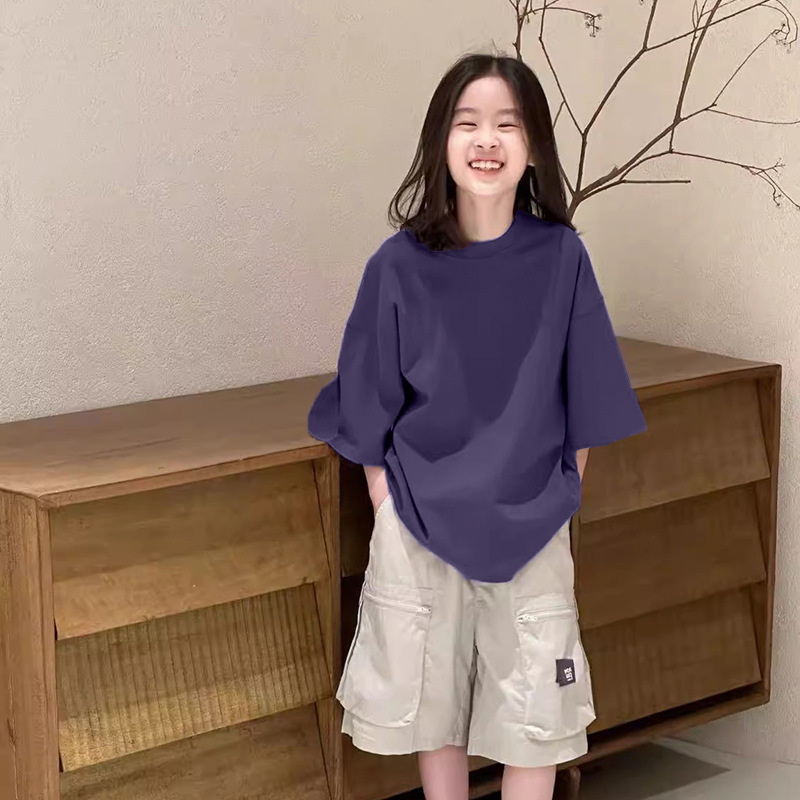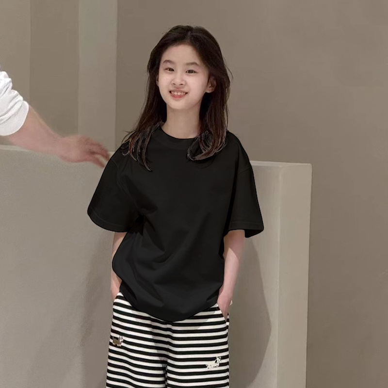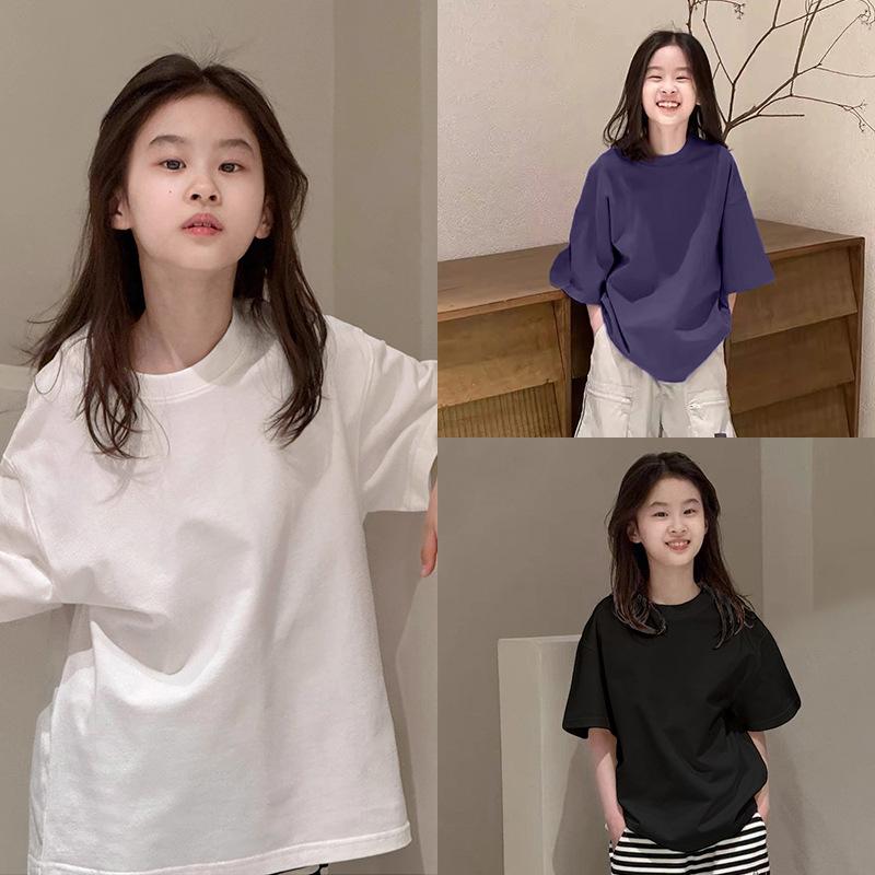 여자 퓨어 코튼 반팔 티셔츠 솔리드 컬러베이스 셔츠 대형 어린이 여름복 한국 라운드 넥 반소매 올매치 트렌디 탑