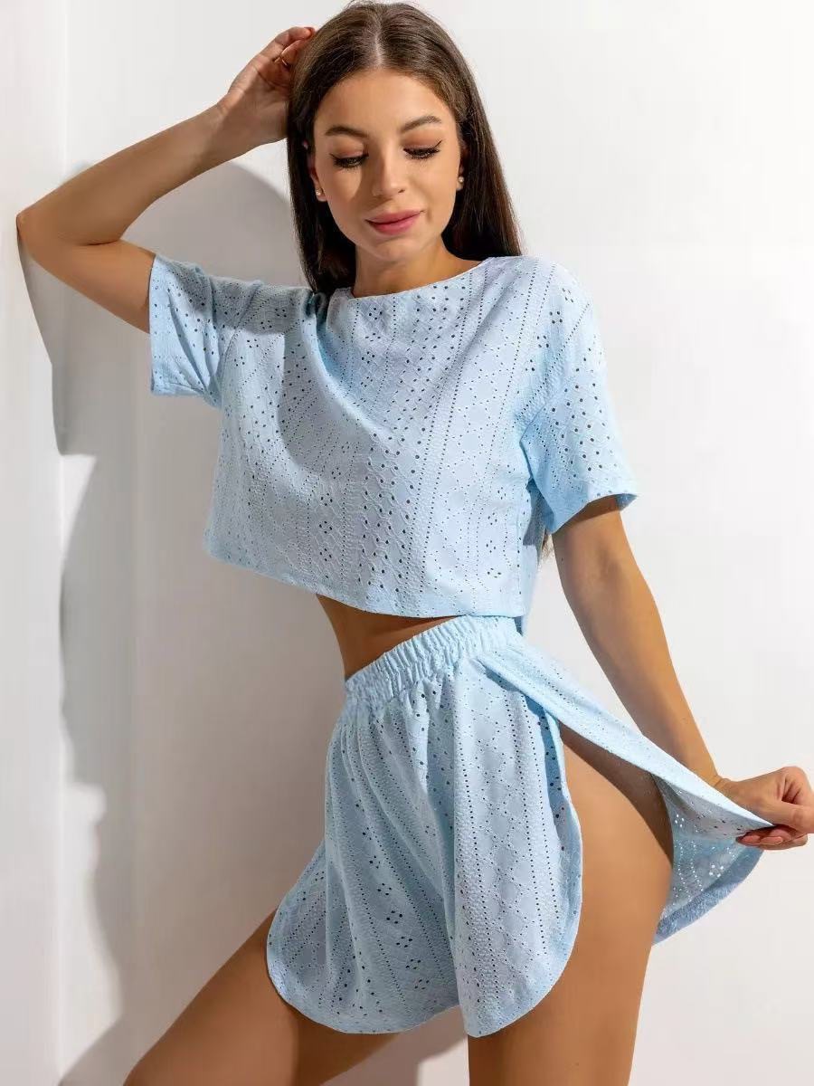 2025 국경 유럽 및 미국 여성 반팔 반바지 자카드 인쇄 여름 패션 투피스 파자마 홈 의류 세트