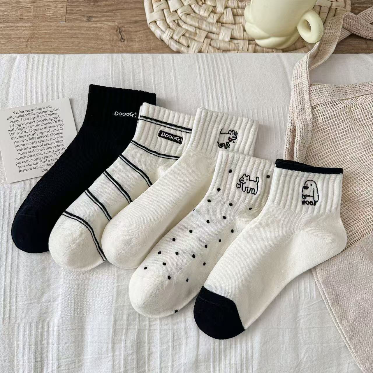 여성용 자수 강아지 양말 한국 스타일면 양말 봄 여름 만화 귀여운 흑백 여성 양말 트렌디 짧은 양말