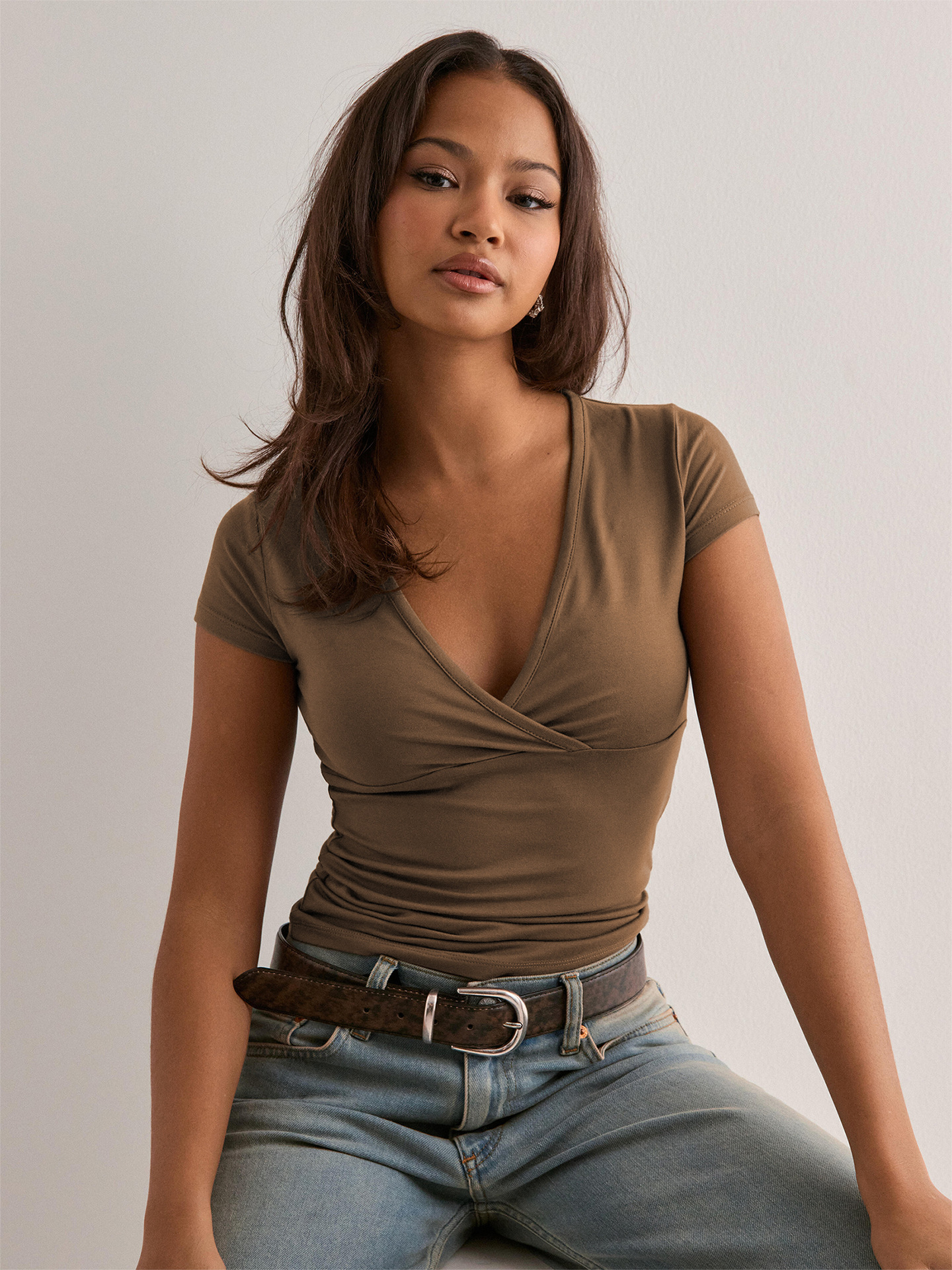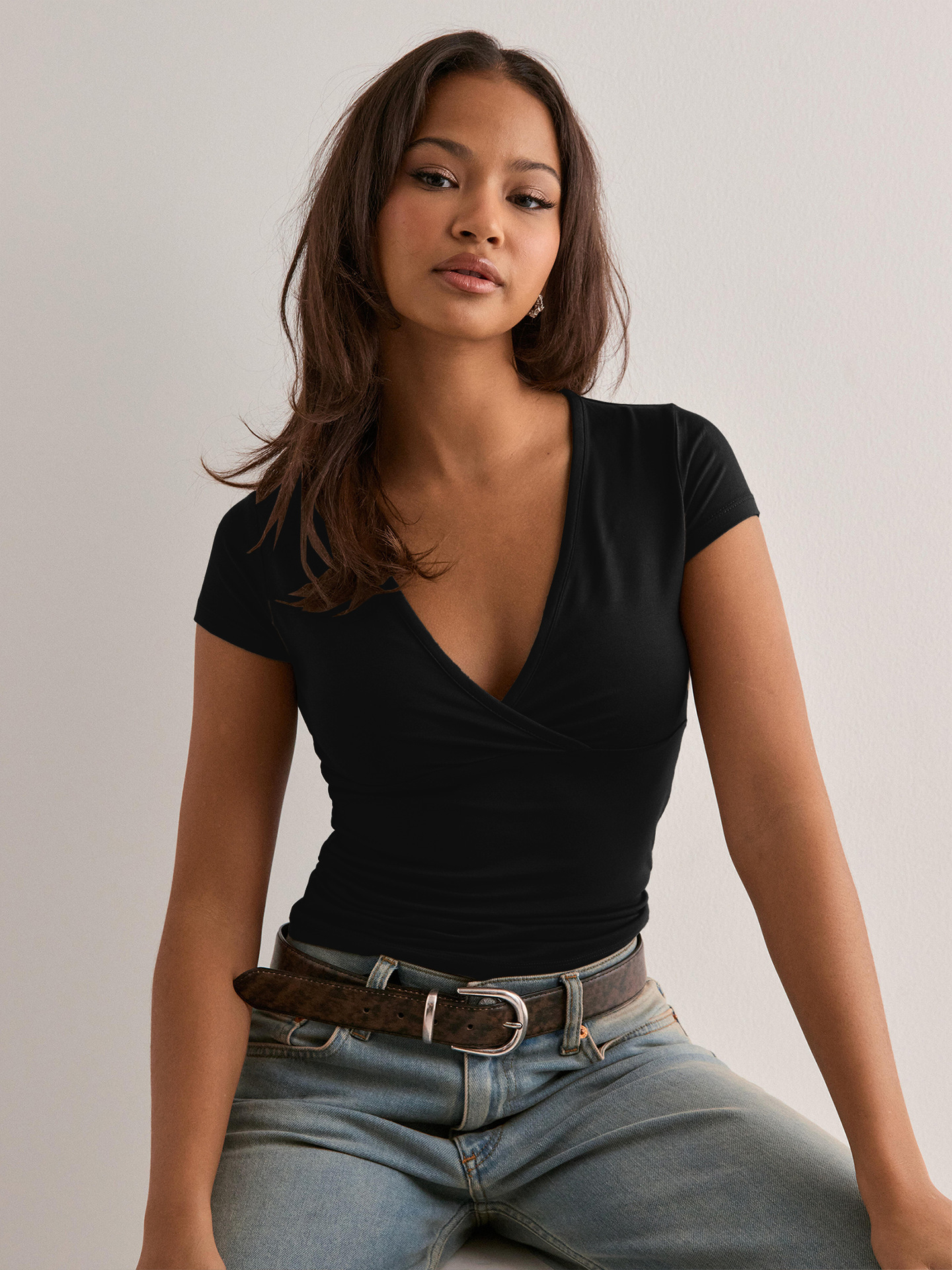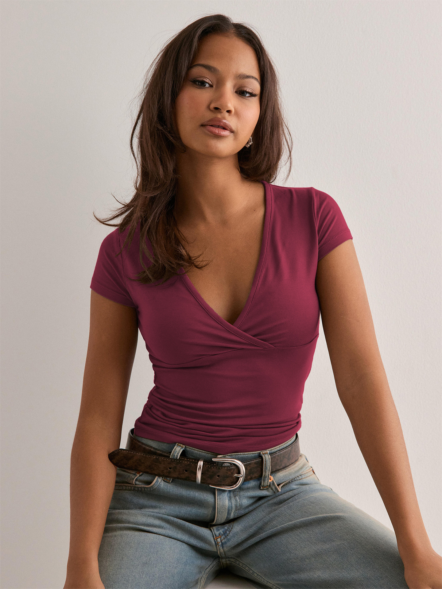 아마존 크로스보더 2026 봄/여름 Y2K 솔리드 컬러 슬림핏 V넥 반팔 티셔츠, 해외 무역 유럽/미국 여성 상의