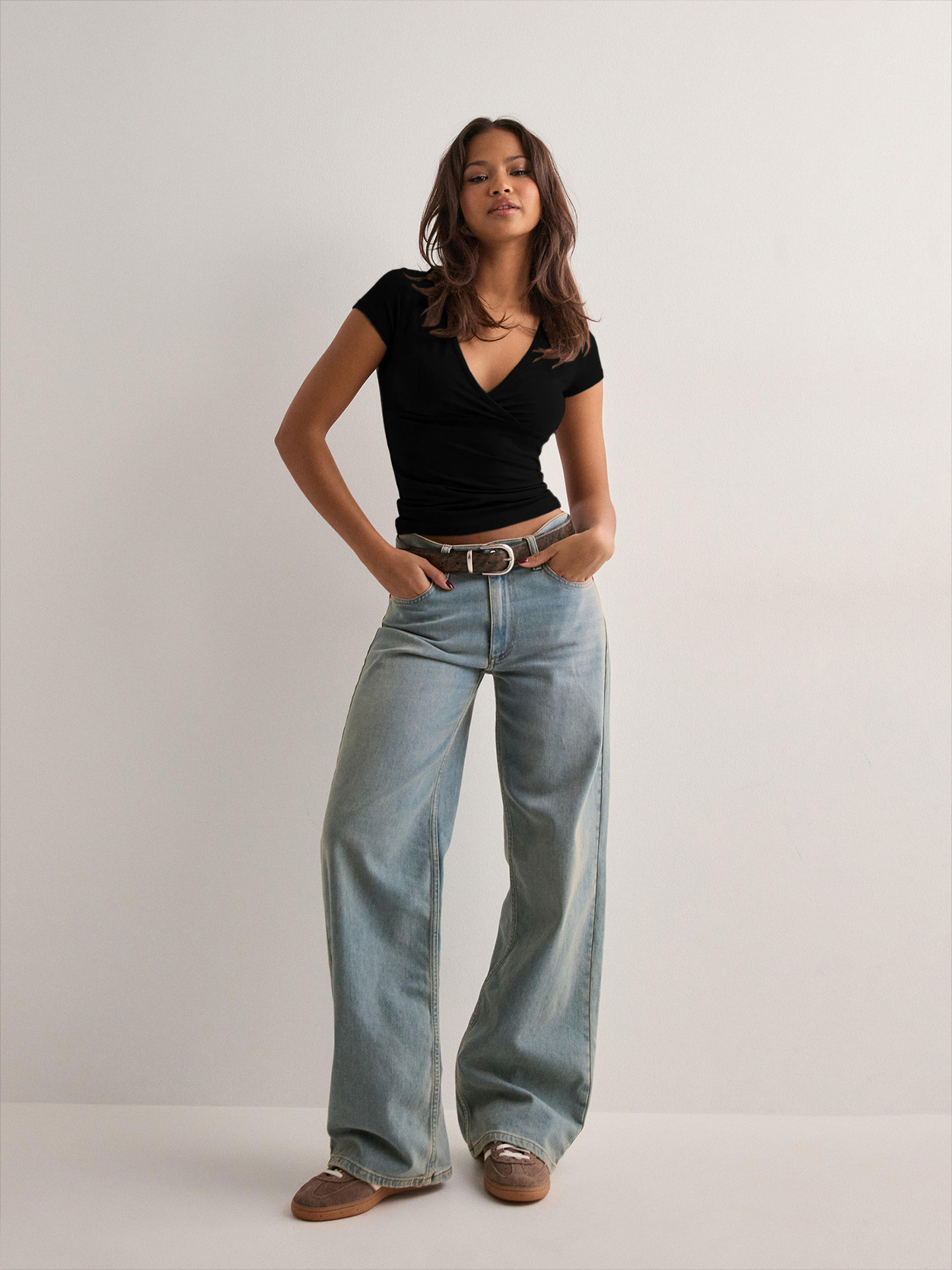 아마존 크로스보더 2026 봄/여름 Y2K 솔리드 컬러 슬림핏 V넥 반팔 티셔츠, 해외 무역 유럽/미국 여성 상의스토어 가기