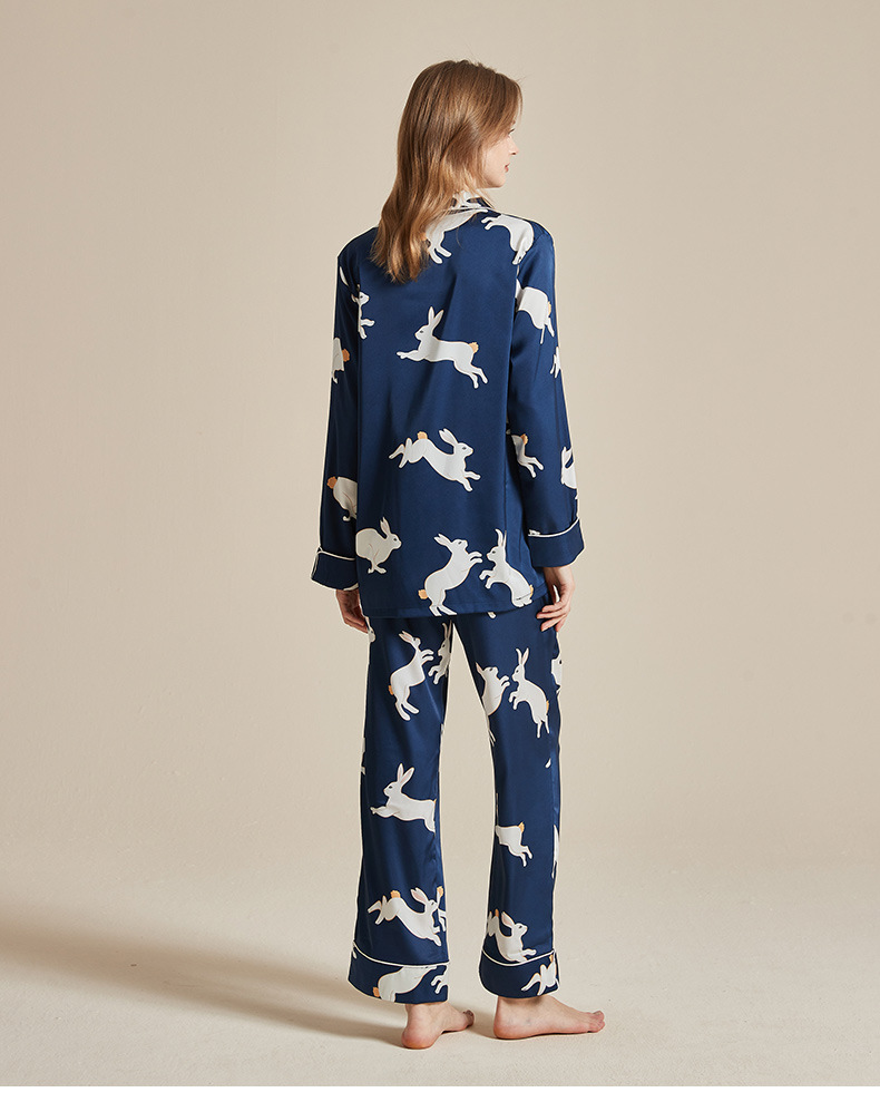【블루 바닥 달토끼】여성용 잠옷 봄 가을 신상 홈웨어 세트 달콤한 프린트 아이스 실크 잠옷 긴팔 세트