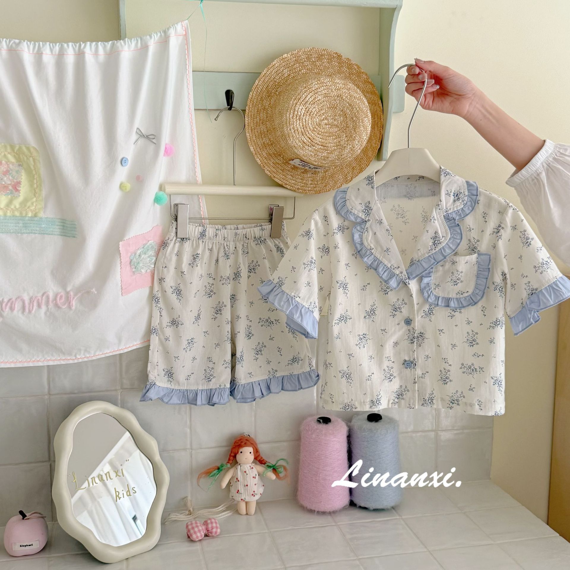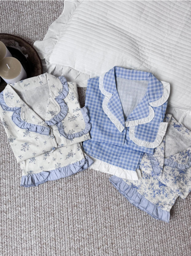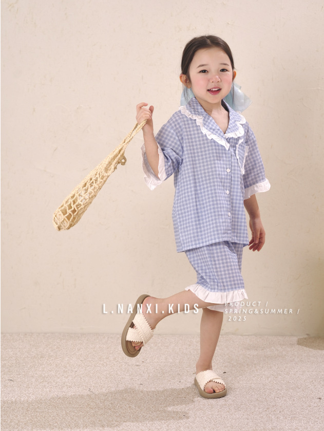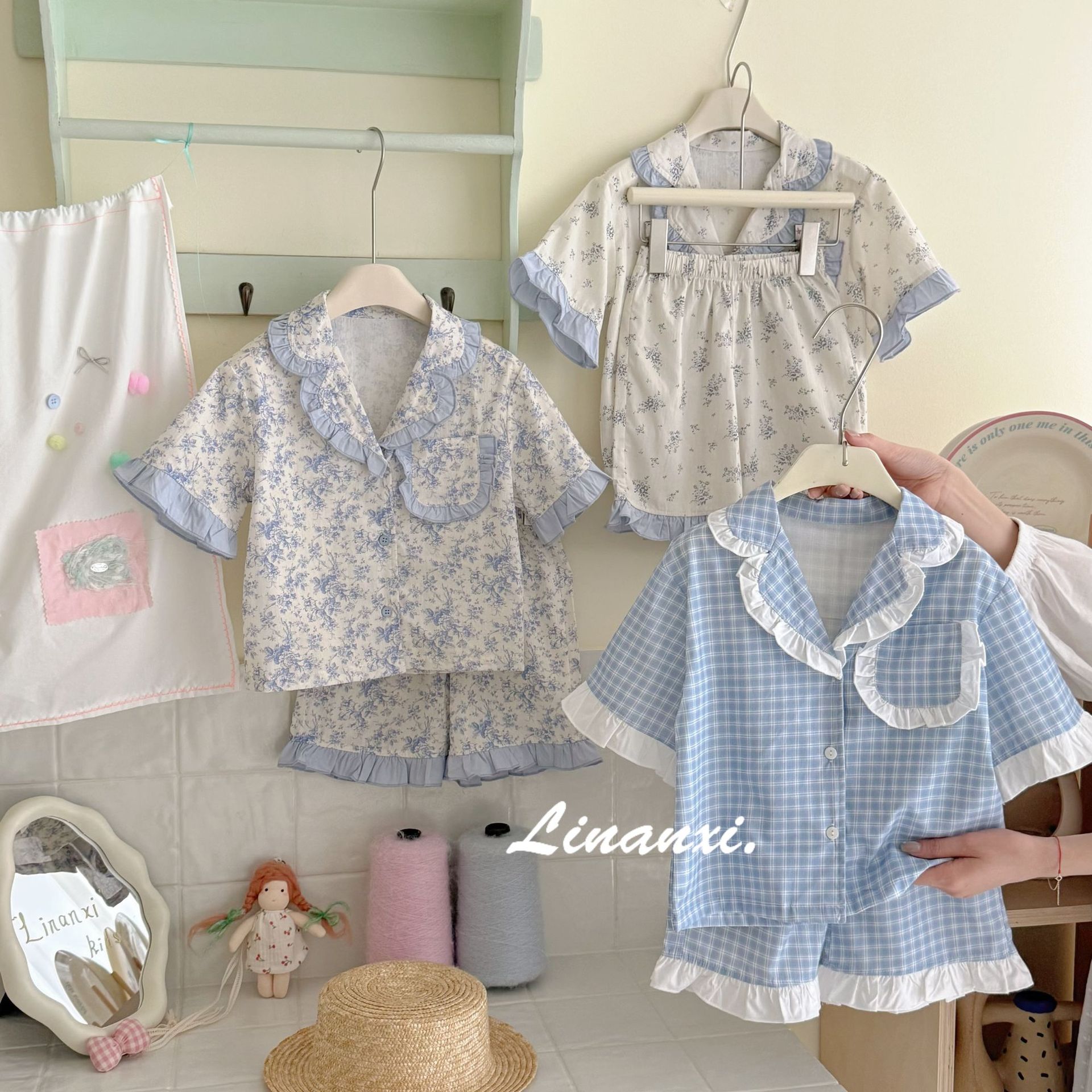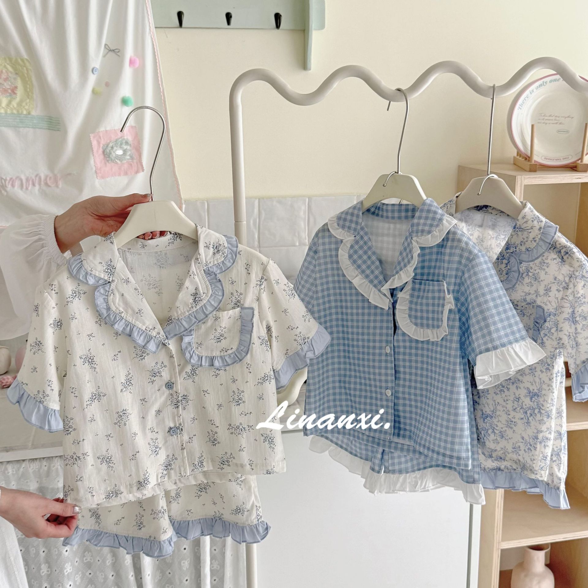 한국 스타일 러플 격자 무늬 세트 소녀의 여름 통기성 코튼 원사 반팔 Ins 달콤한 느슨한 투피스 홈 옷