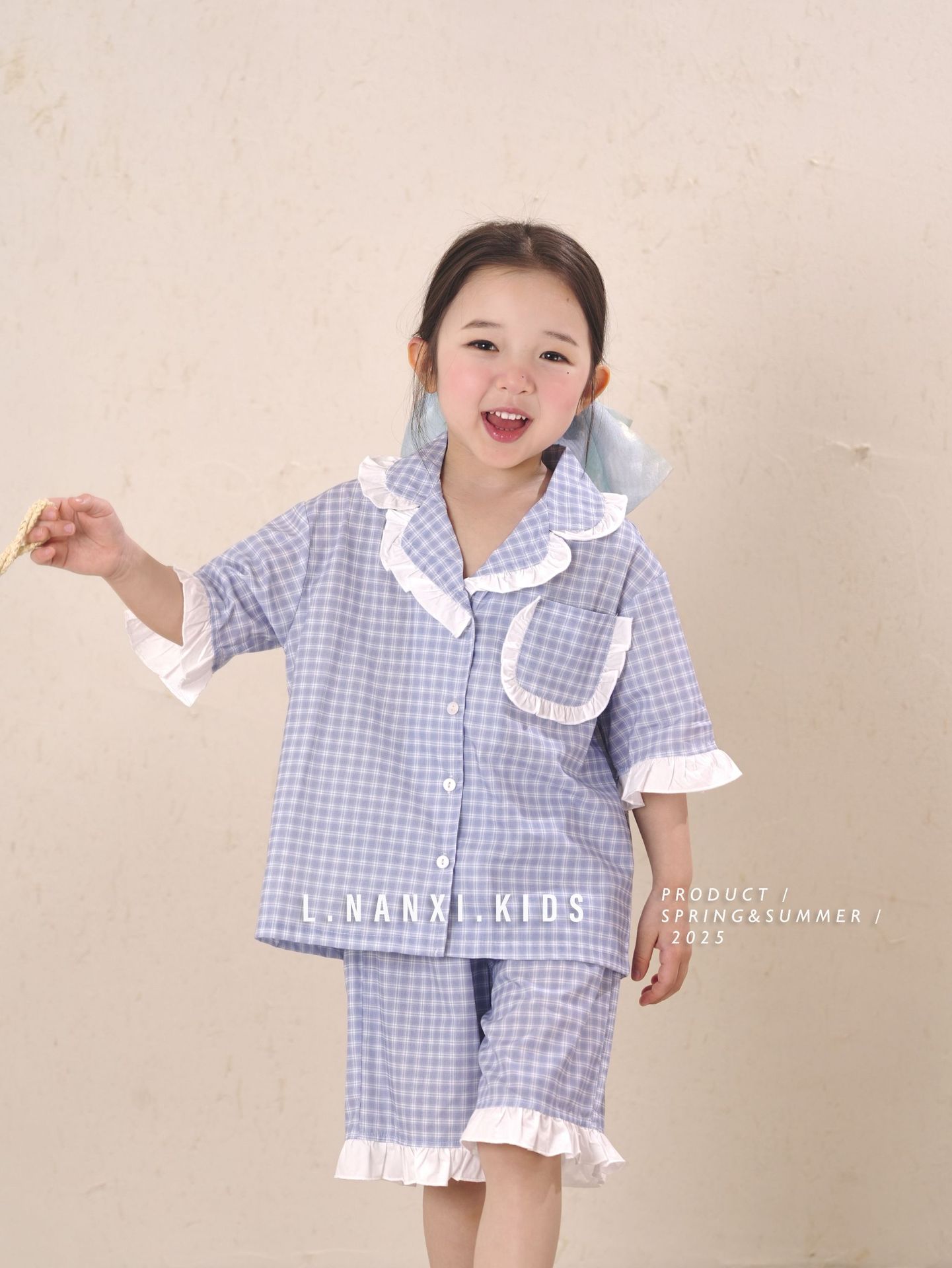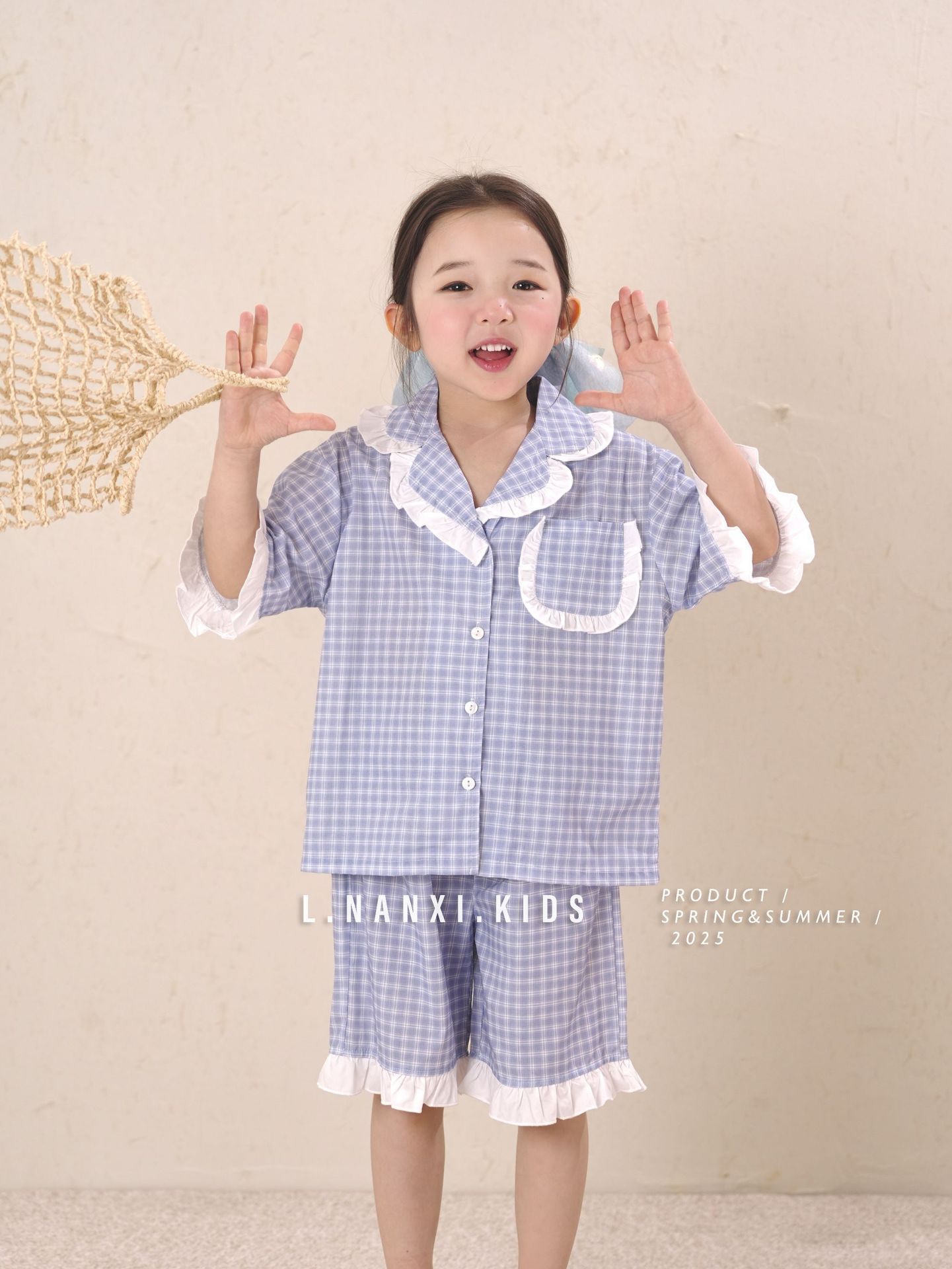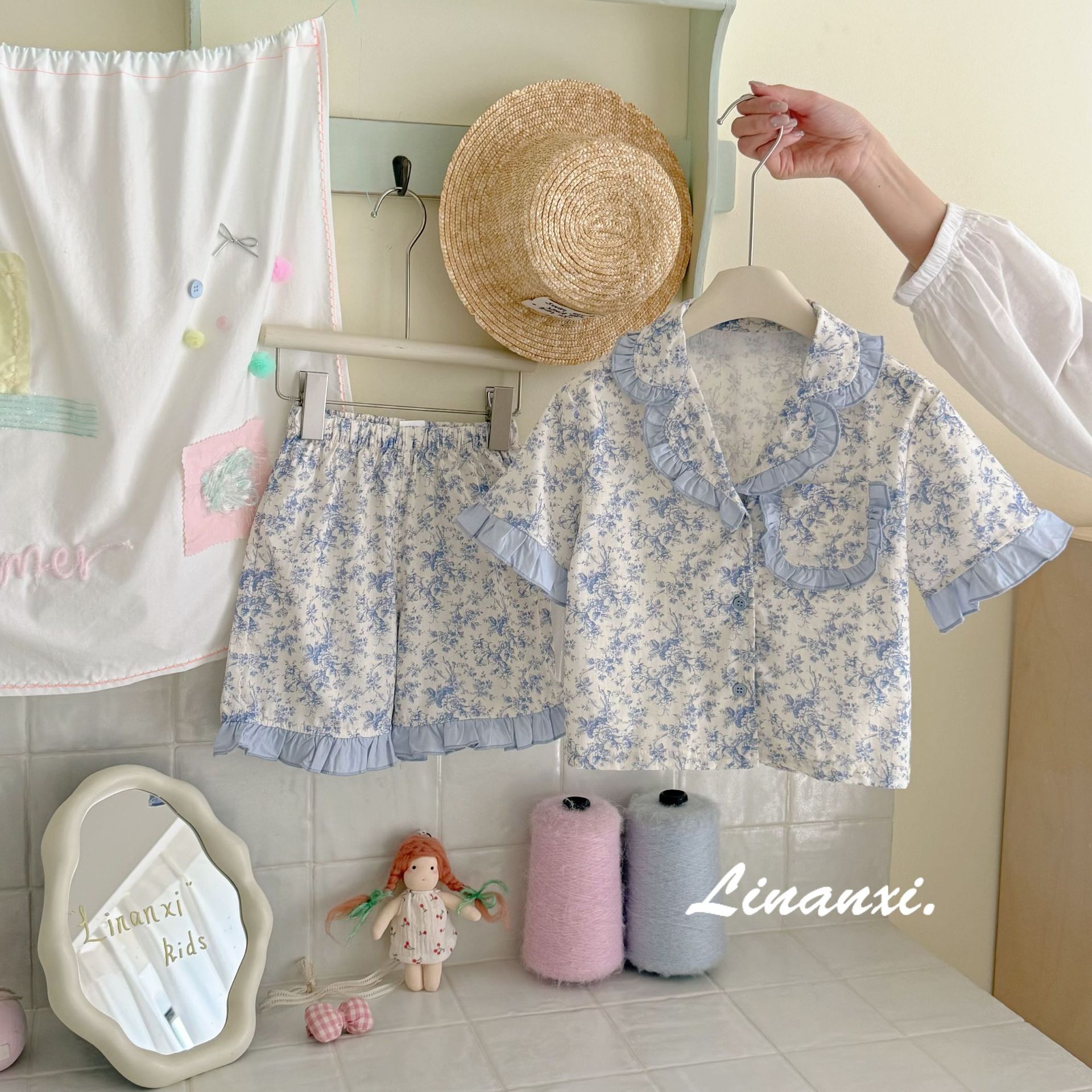 한국 스타일 러플 격자 무늬 세트 소녀의 여름 통기성 코튼 원사 반팔 Ins 달콤한 느슨한 투피스 홈 옷