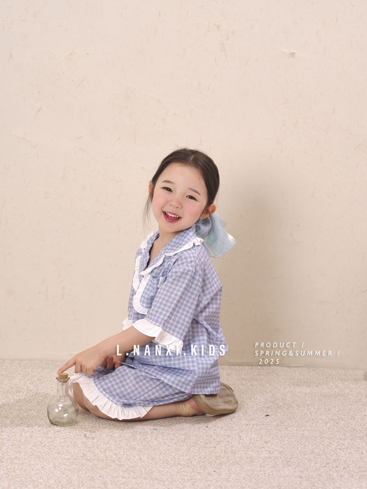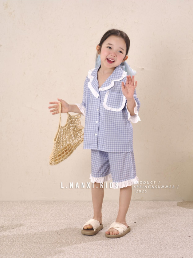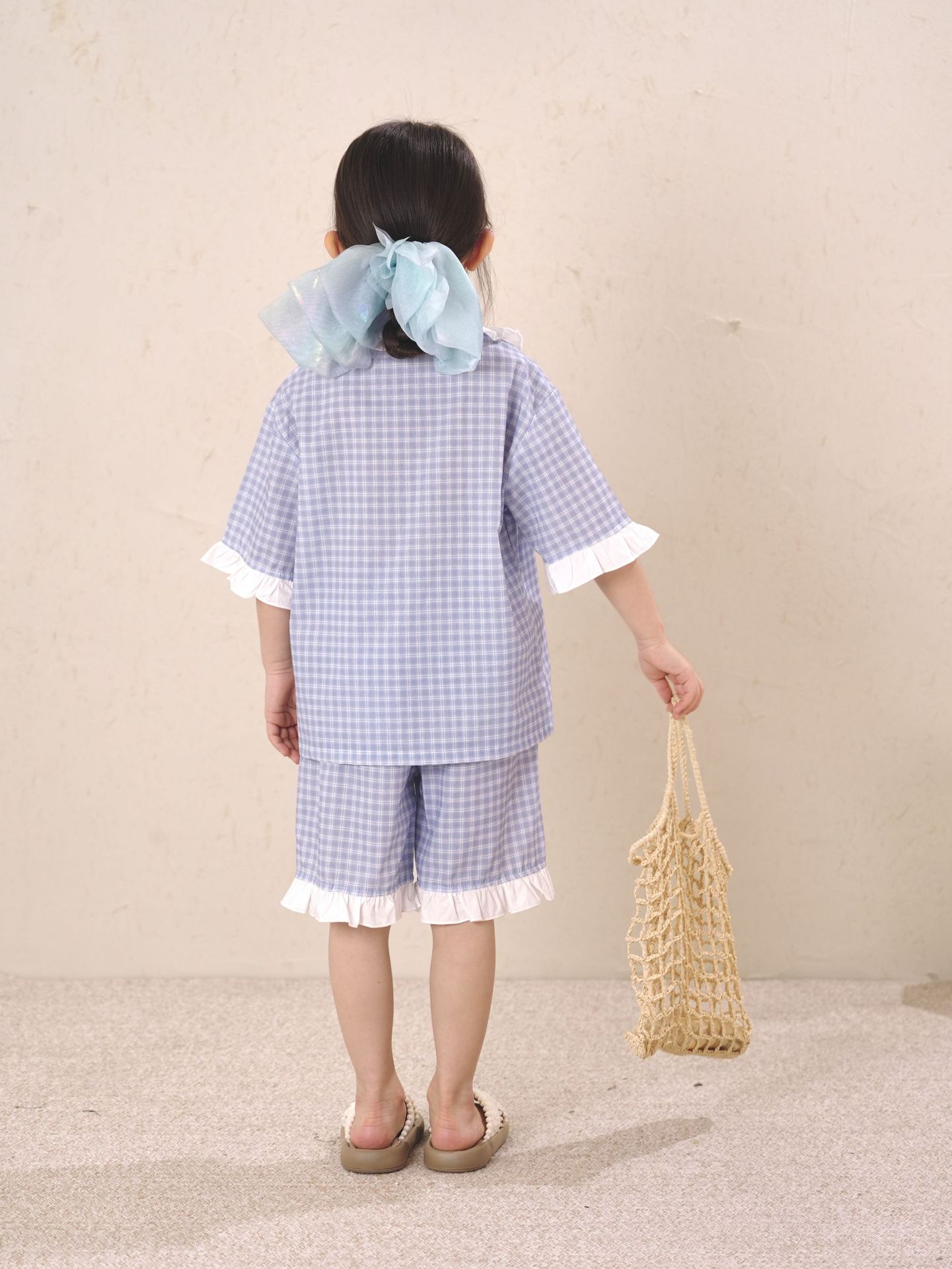 한국 스타일 러플 격자 무늬 세트 소녀의 여름 통기성 코튼 원사 반팔 Ins 달콤한 느슨한 투피스 홈 옷스토어 가기