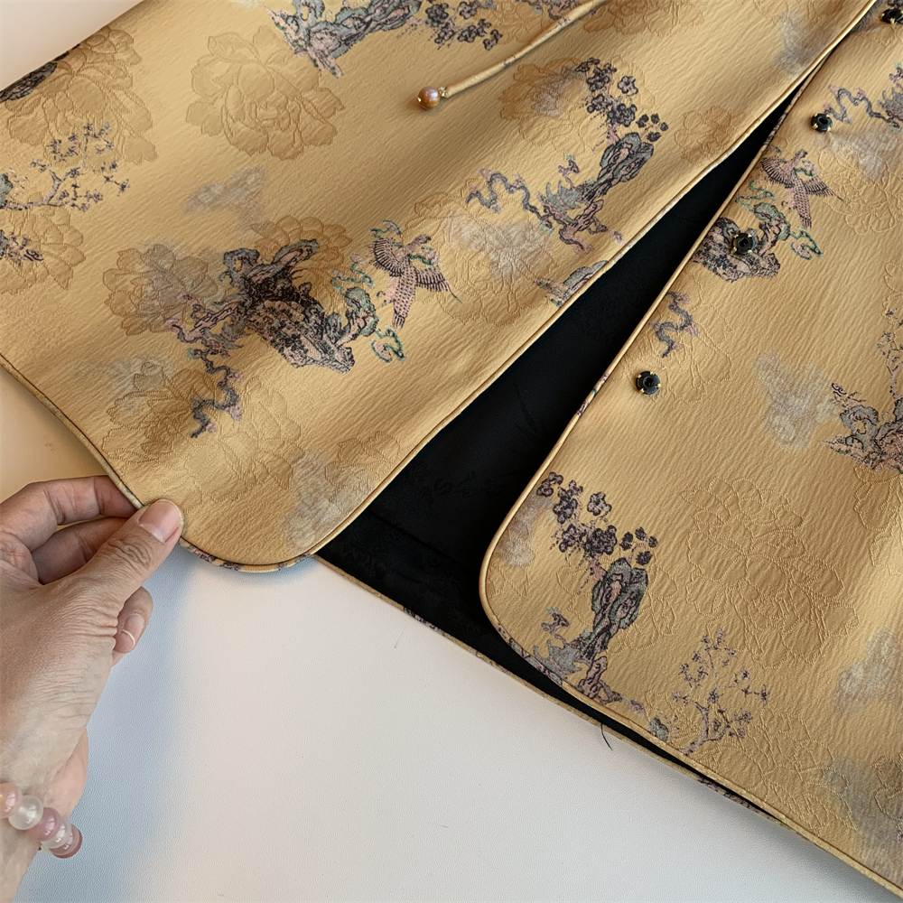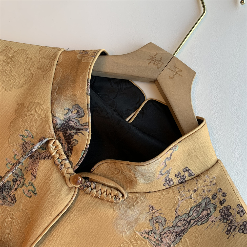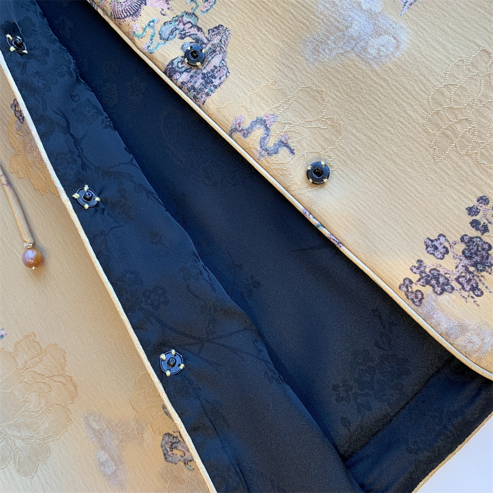 手工盘扣对襟一粒扣,以玉石菩提莲纽扣点缀'盘扣流苏垂落,