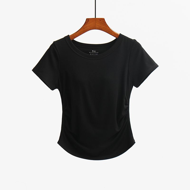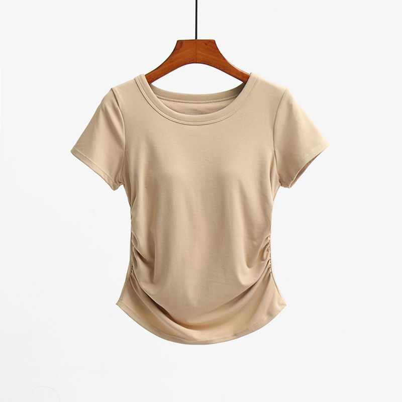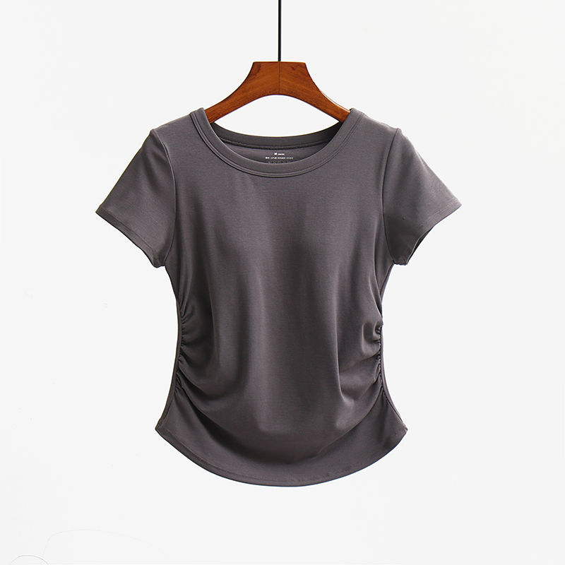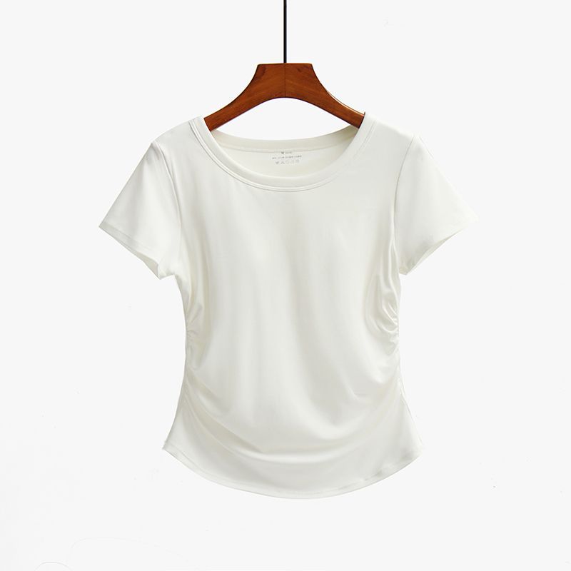 여성용 가슴 패드가 있는 새로운 스타일의 반팔 티셔츠, 브라 프리 플리츠 허리 슬리밍 탑, 속옷, 요가 스포츠 베이스 레이어 셔츠스토어 가기