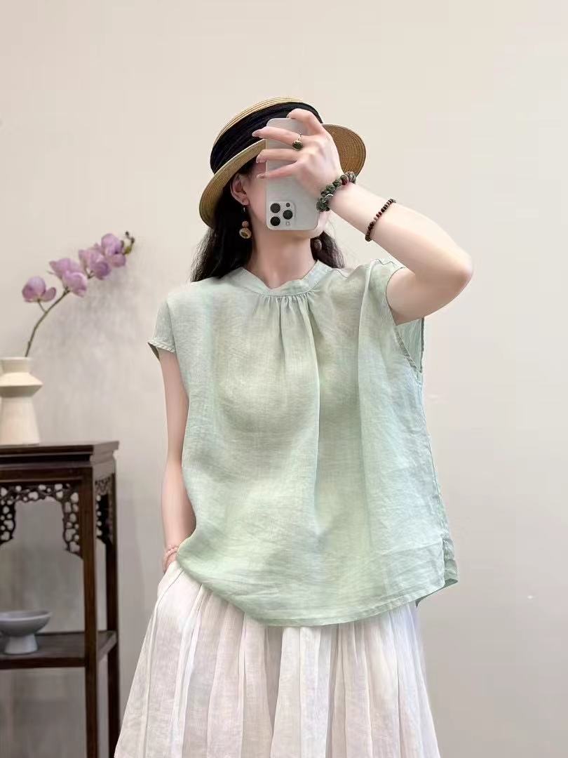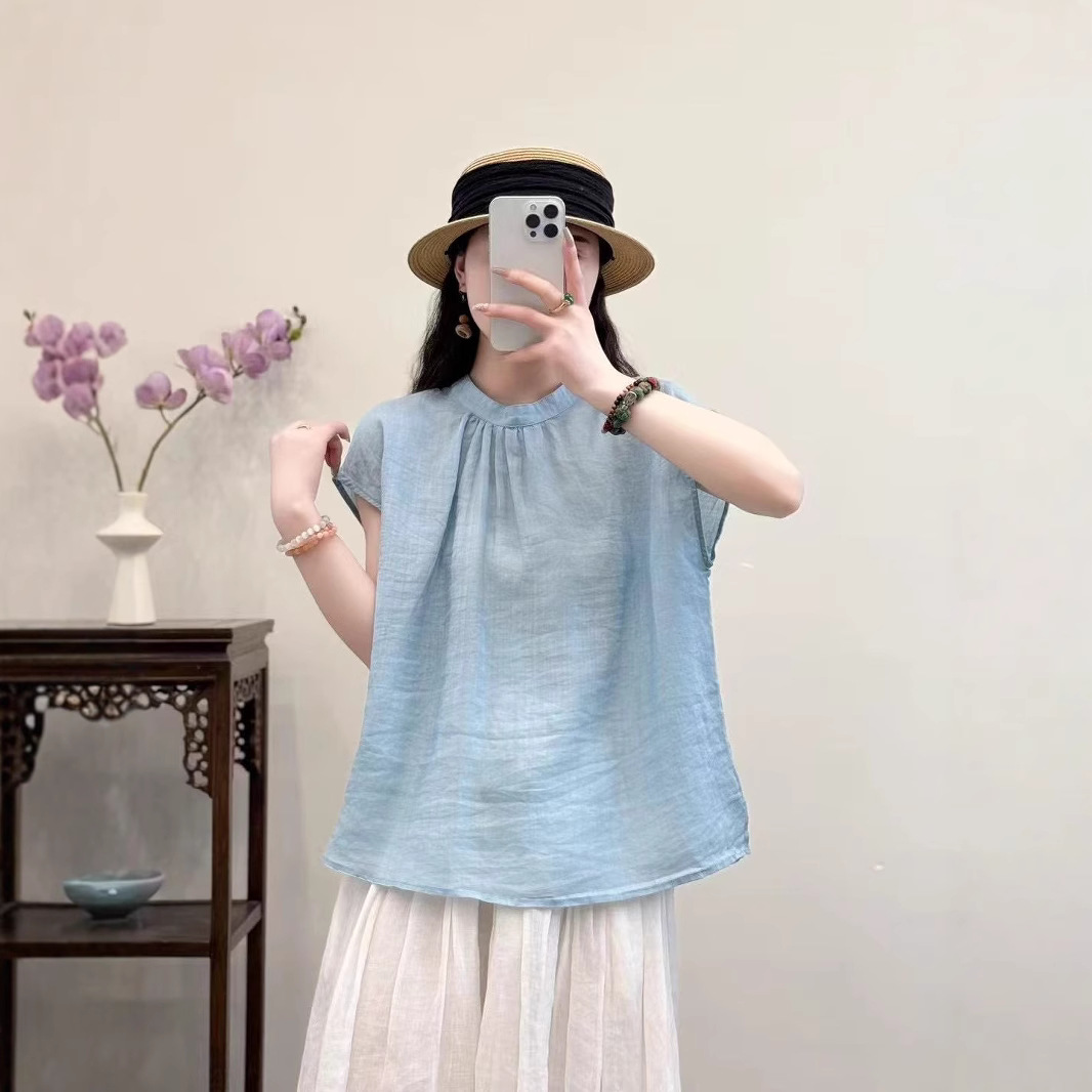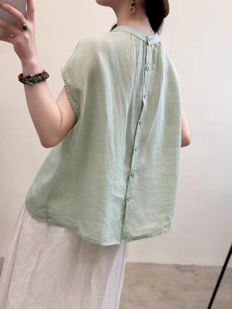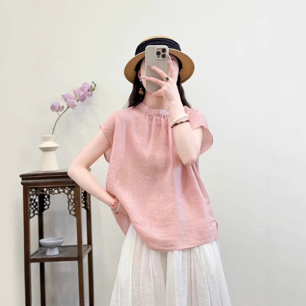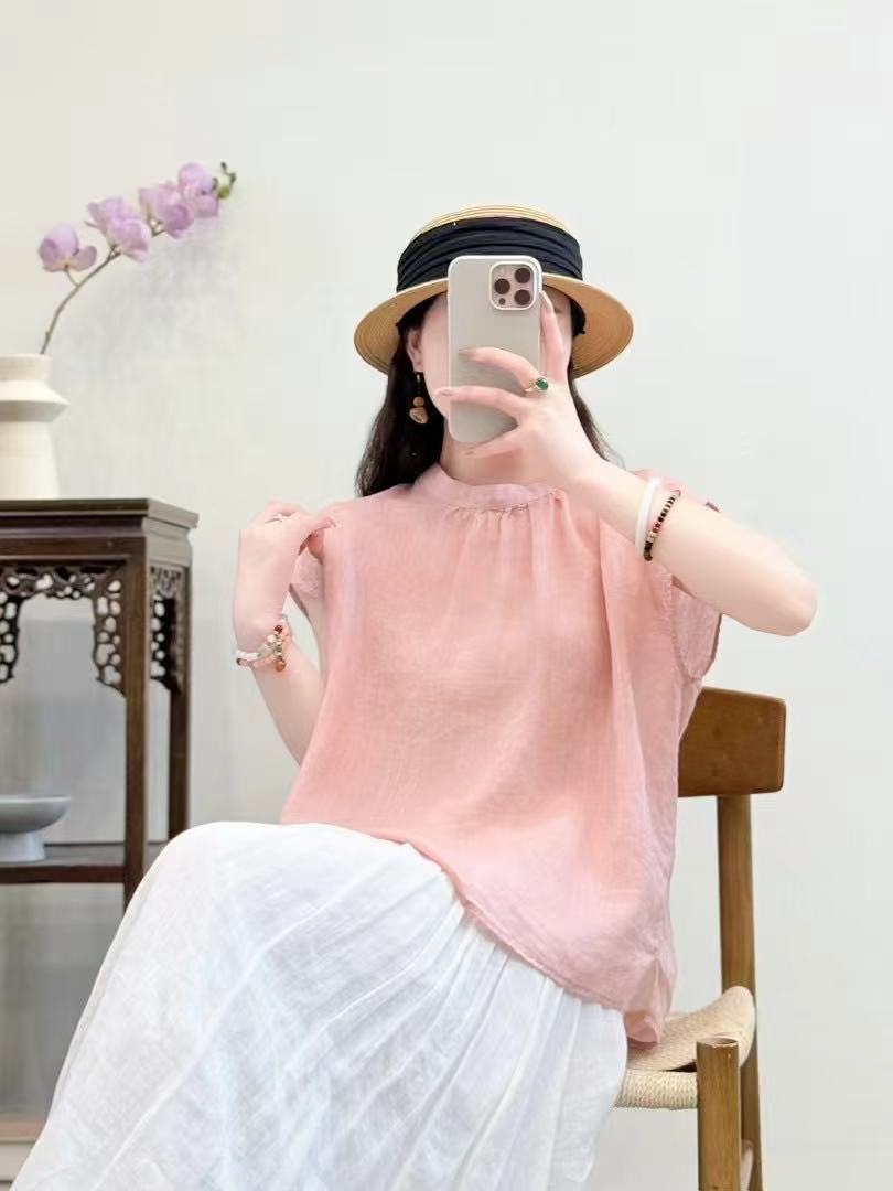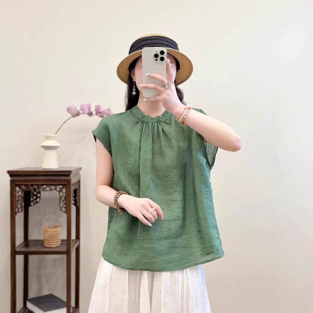 문학적이고 예술적인 얇은 100수 모시 스탠드 칼라 앞면과 뒷면이 반전되는 여성용 셔츠 2025 심플한 기질 솔리드 컬러 민소매 셔츠스토어 가기