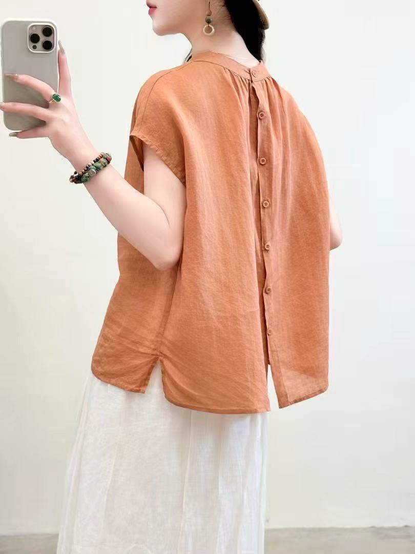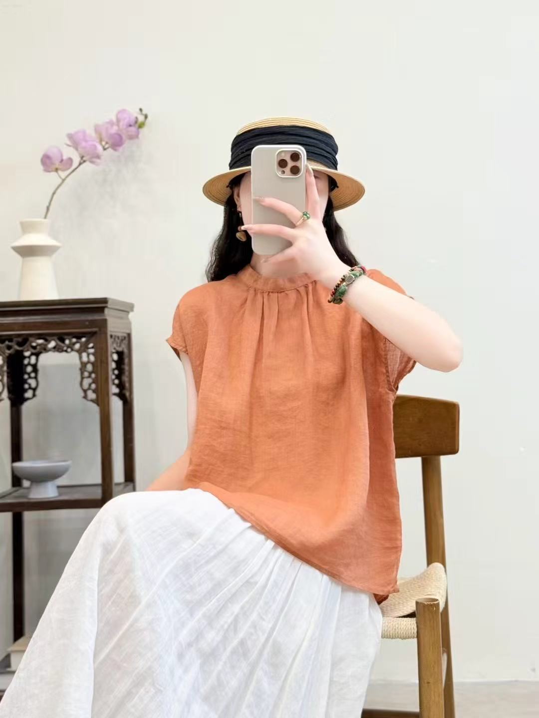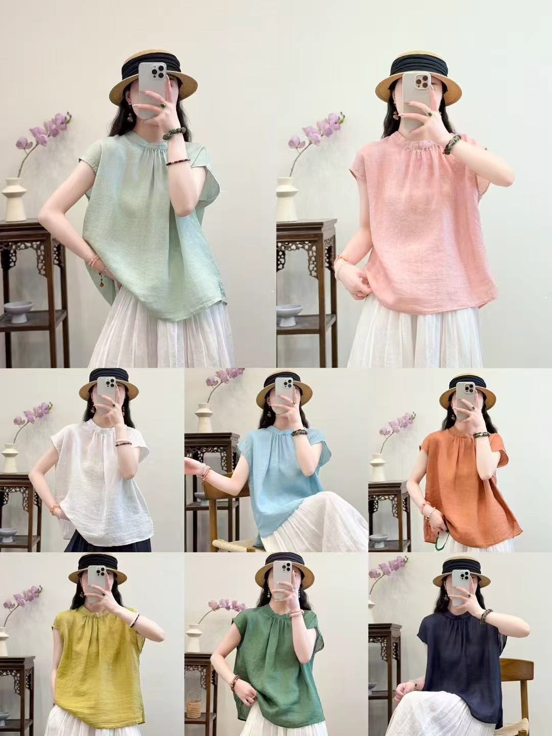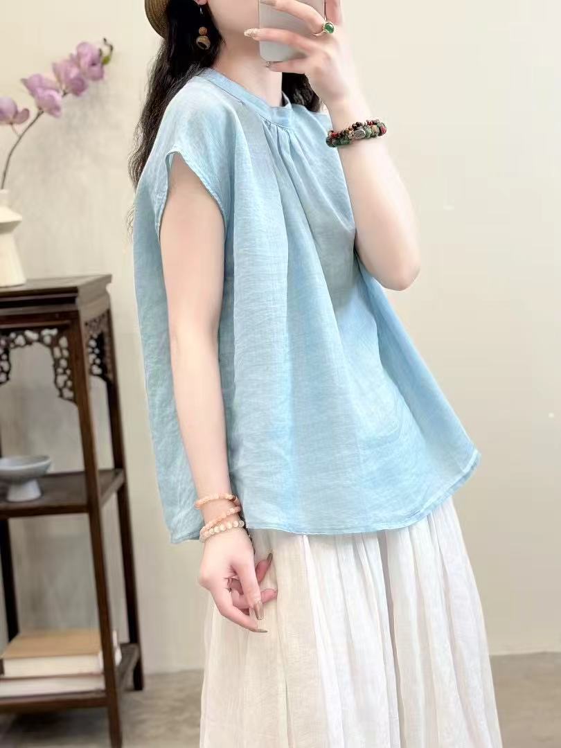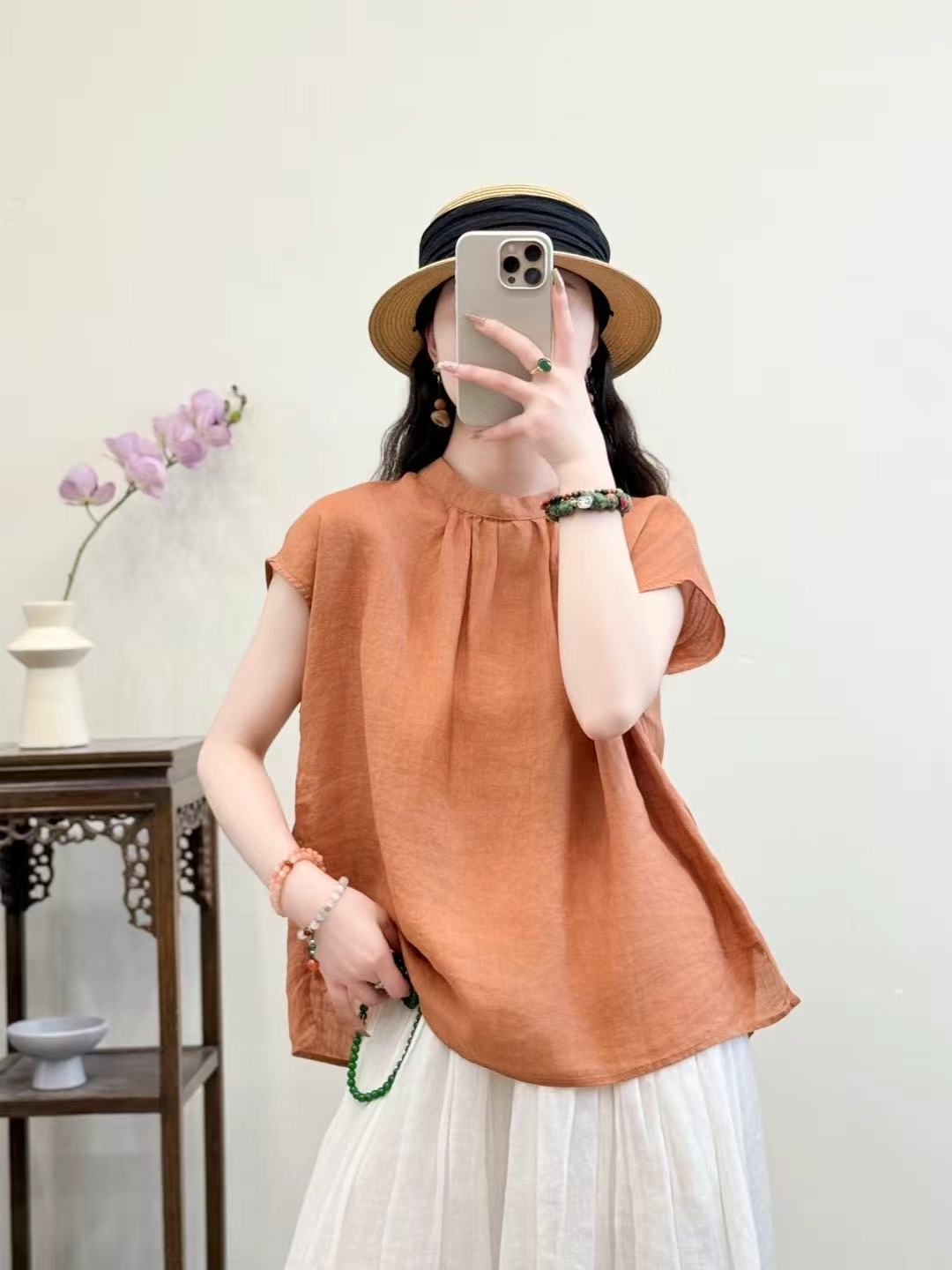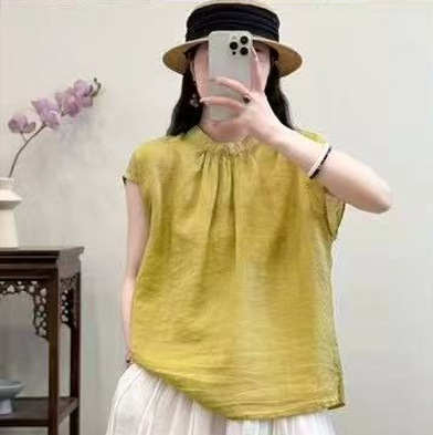 문학적이고 예술적인 얇은 100수 모시 스탠드 칼라 앞면과 뒷면이 반전되는 여성용 셔츠 2025 심플한 기질 솔리드 컬러 민소매 셔츠스토어 가기