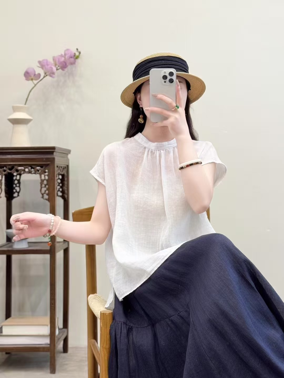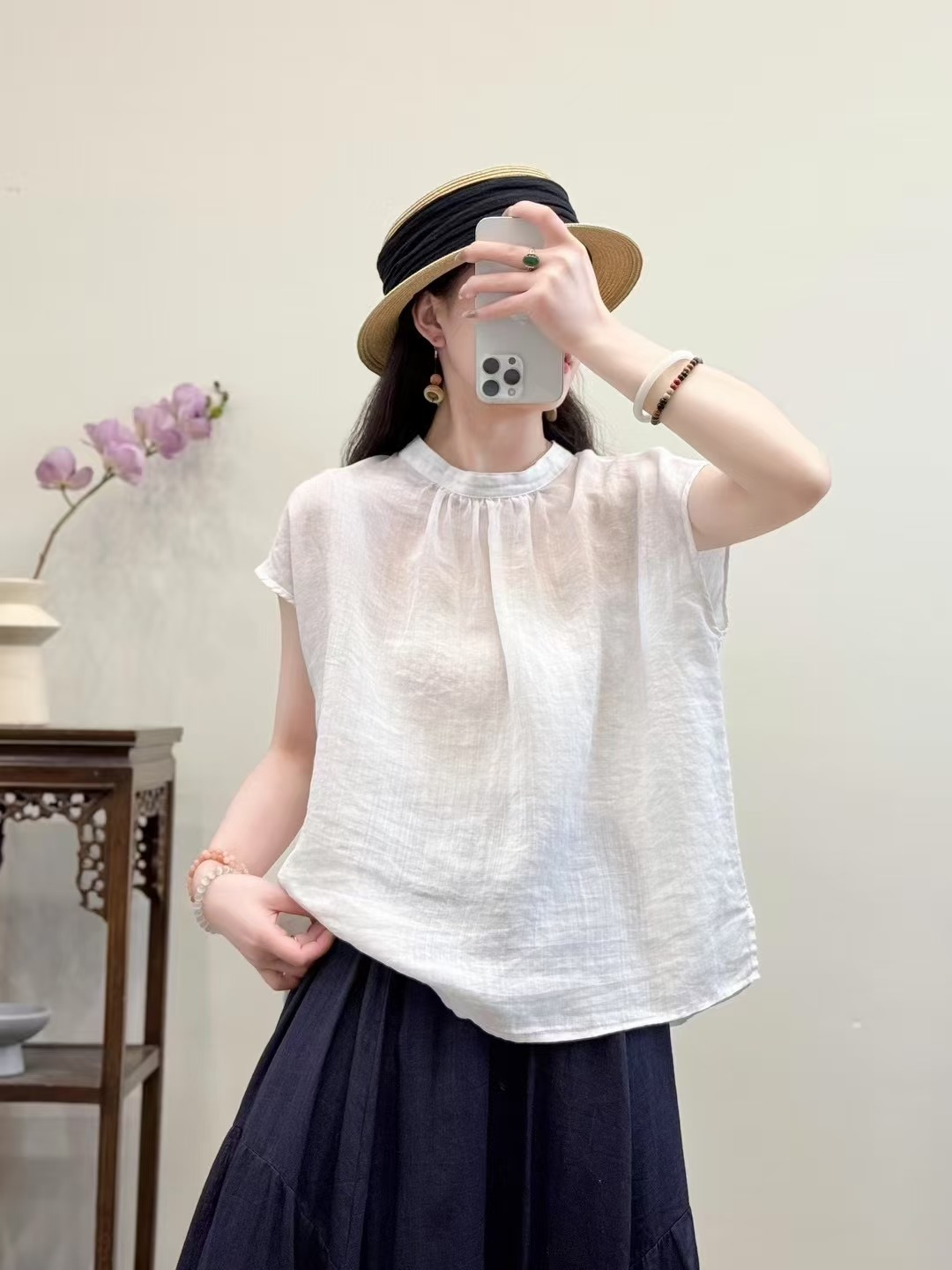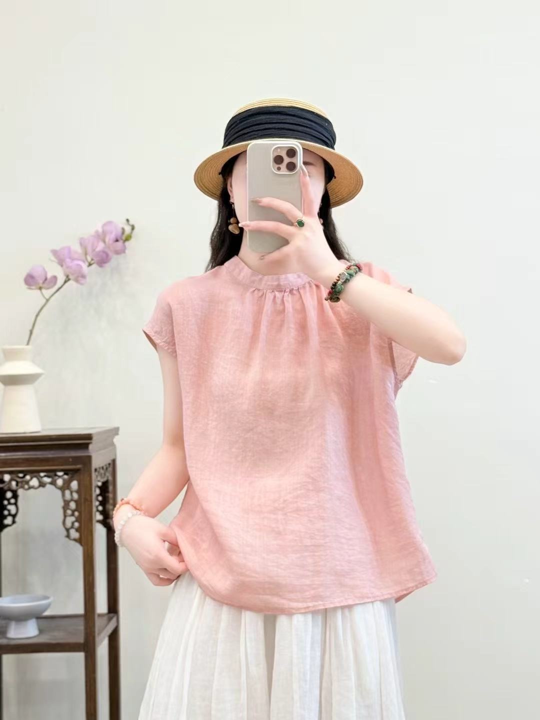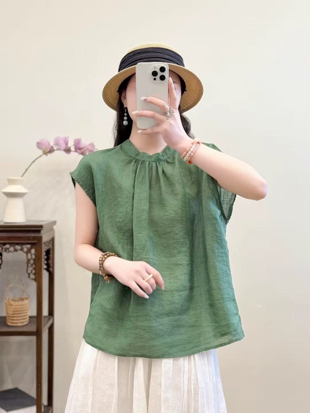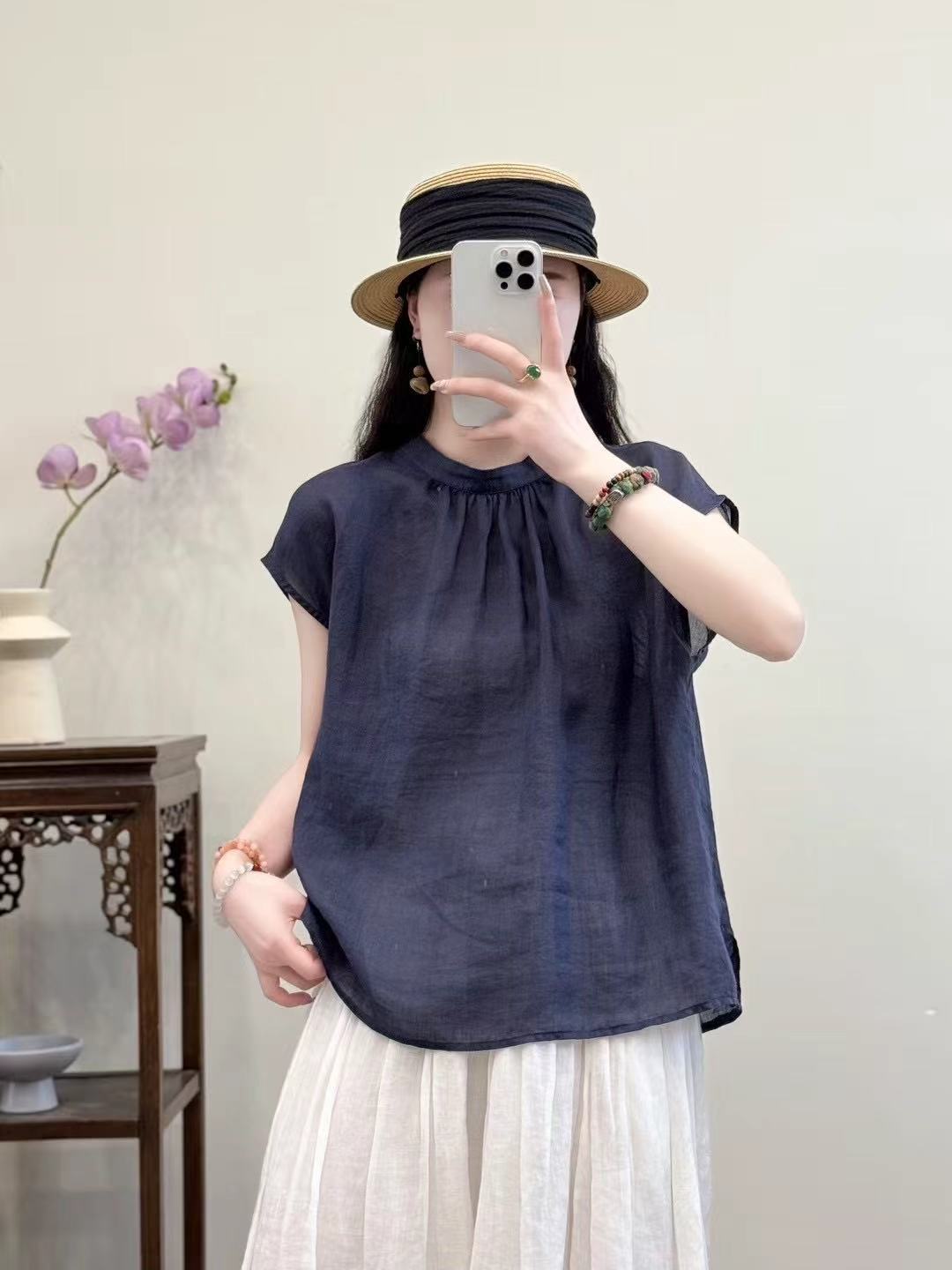 문학적이고 예술적인 얇은 100수 모시 스탠드 칼라 앞면과 뒷면이 반전되는 여성용 셔츠 2025 심플한 기질 솔리드 컬러 민소매 셔츠스토어 가기