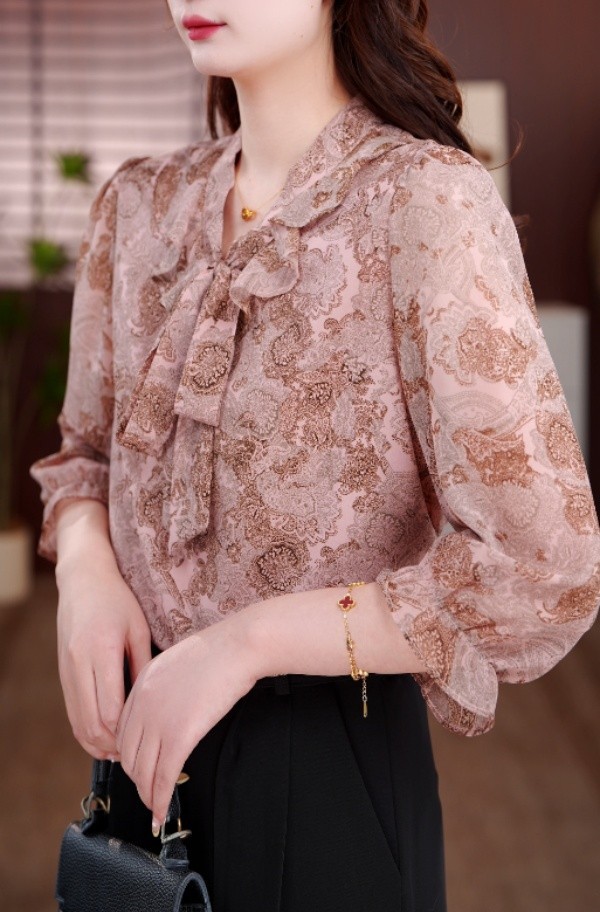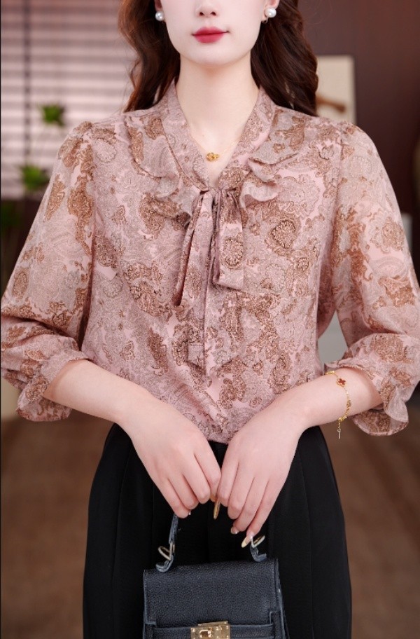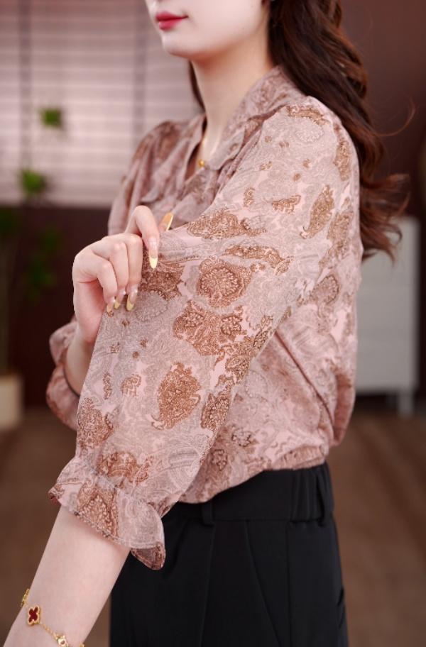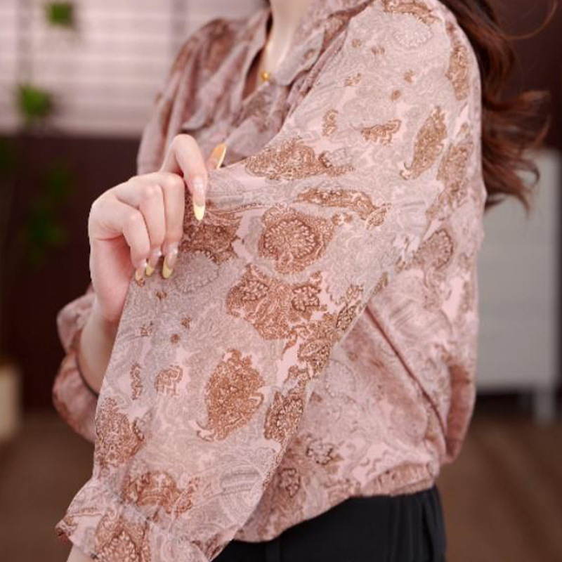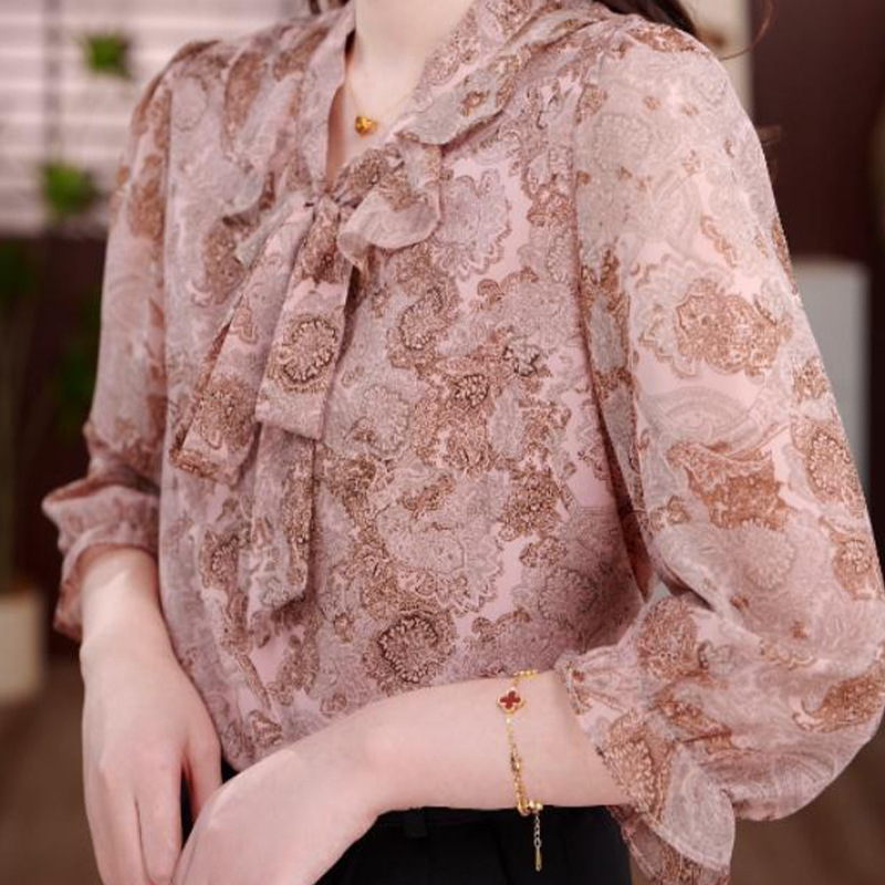 한국 스타일 프린트 활 얇은 쉬폰 셔츠 2025 새로운 서양 스타일 작은 셔츠 달콤한 우아한 세븐 슬리브 탑스토어 가기