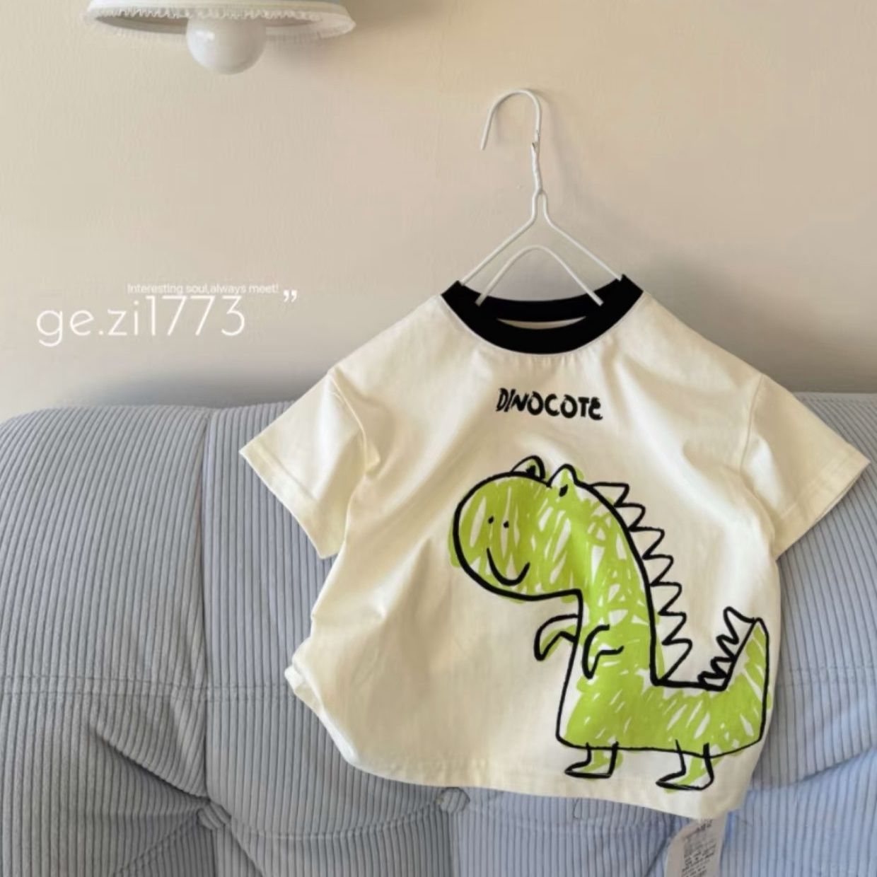 소년 여름 반팔 티셔츠 2025 새로운 어린이 만화 공룡 인쇄 귀여운 어린이 면 탑 T스토어 가기