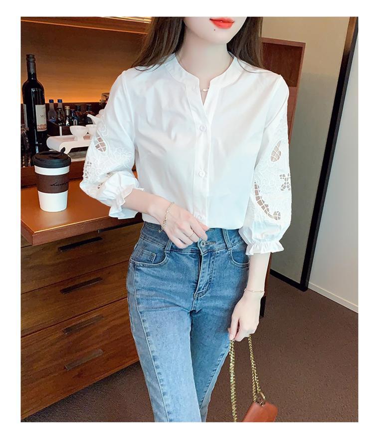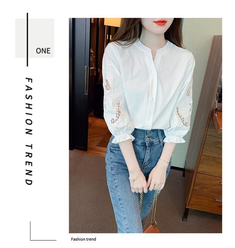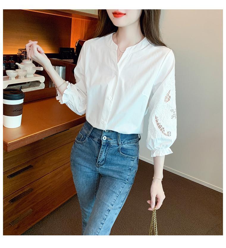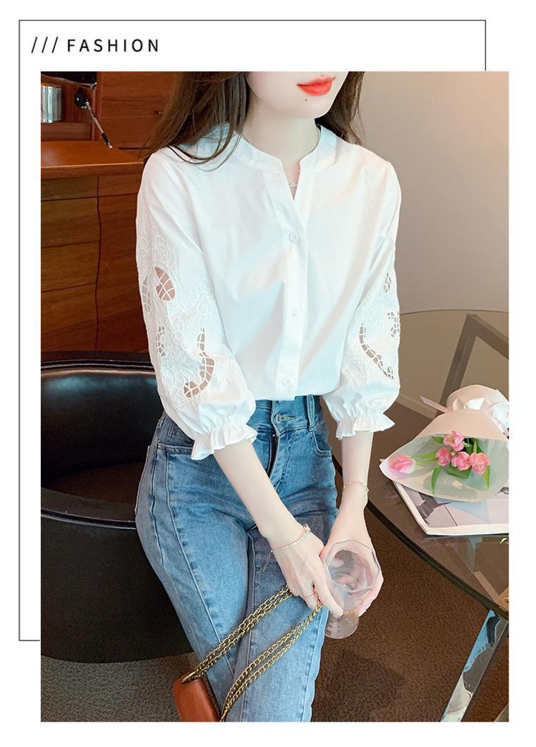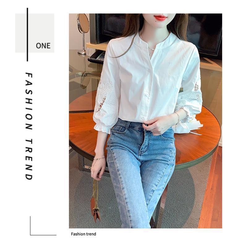 무거운 자수 버블 랜턴 반팔 셔츠 여성 초가을 2025 여름 셔츠 7 소매 화이트 쉬폰 탑