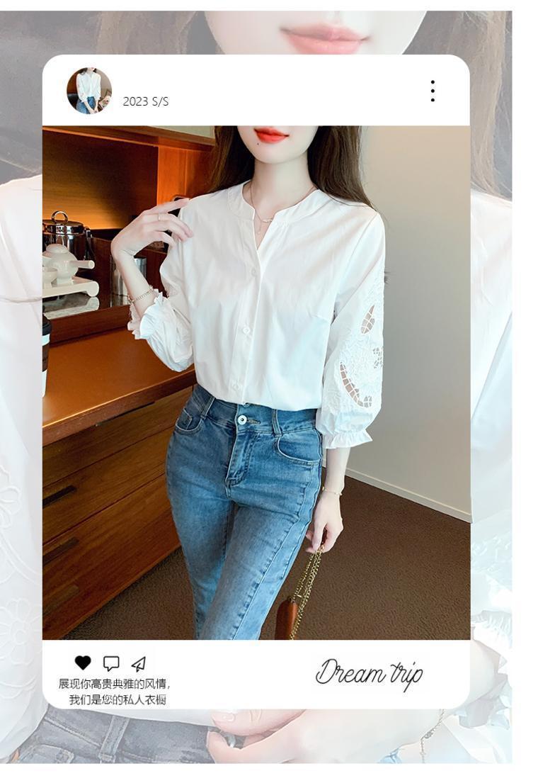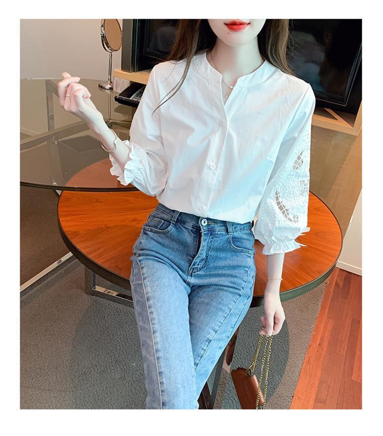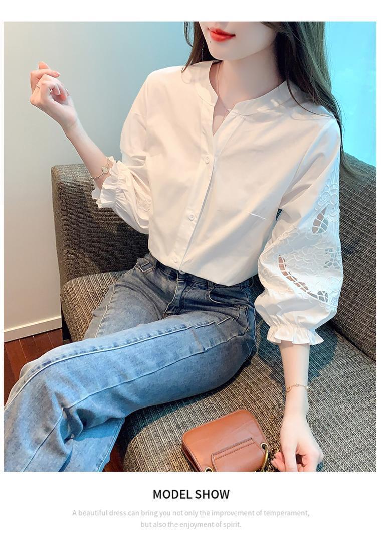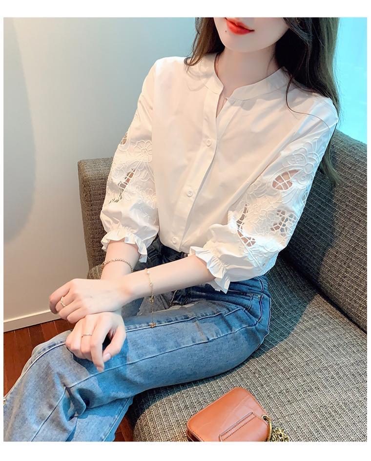 무거운 자수 버블 랜턴 반팔 셔츠 여성 초가을 2025 여름 셔츠 7 소매 화이트 쉬폰 탑