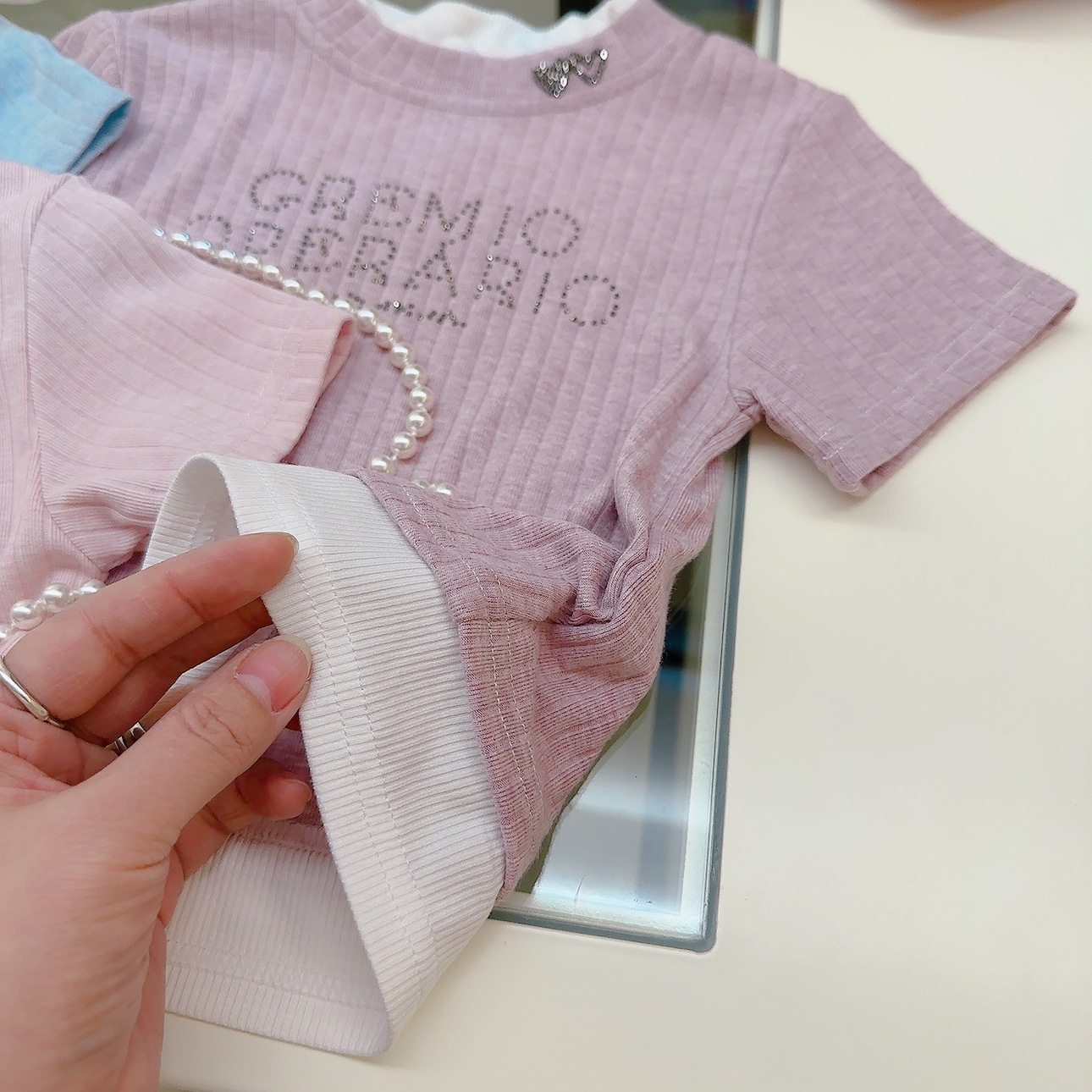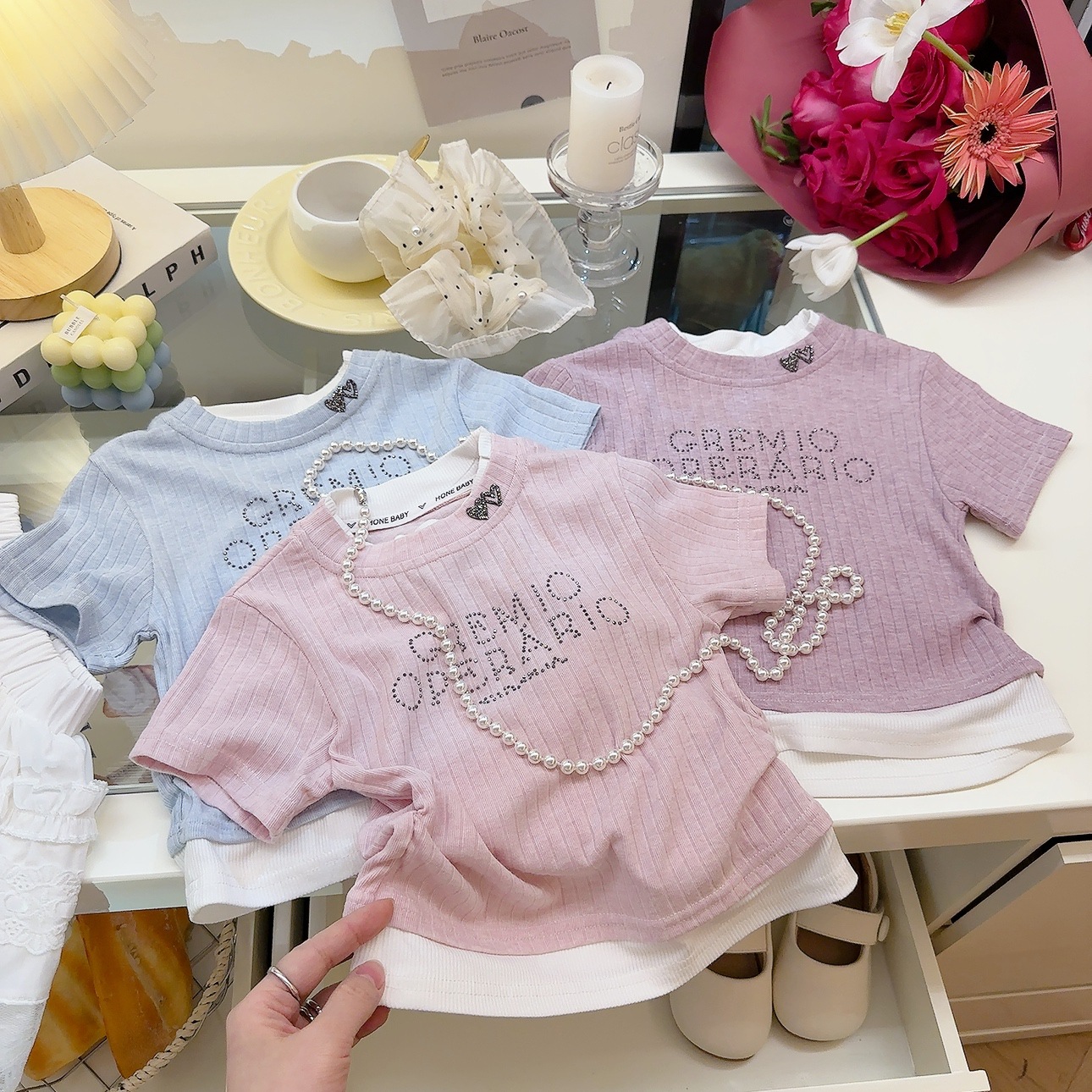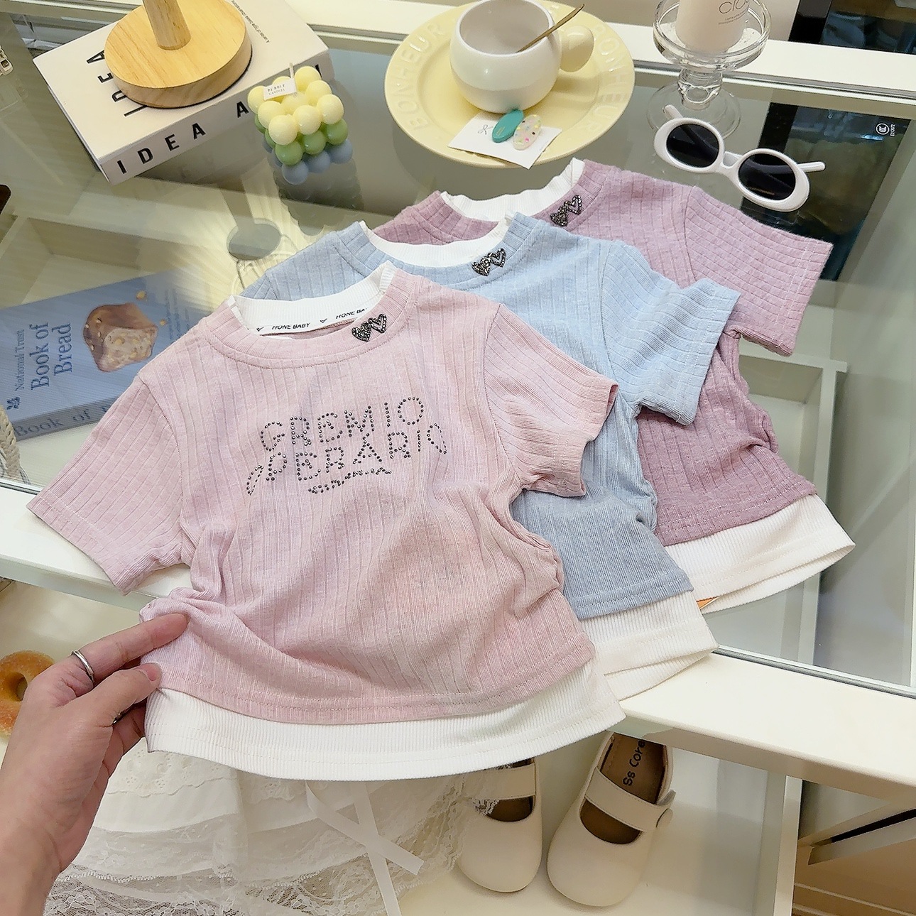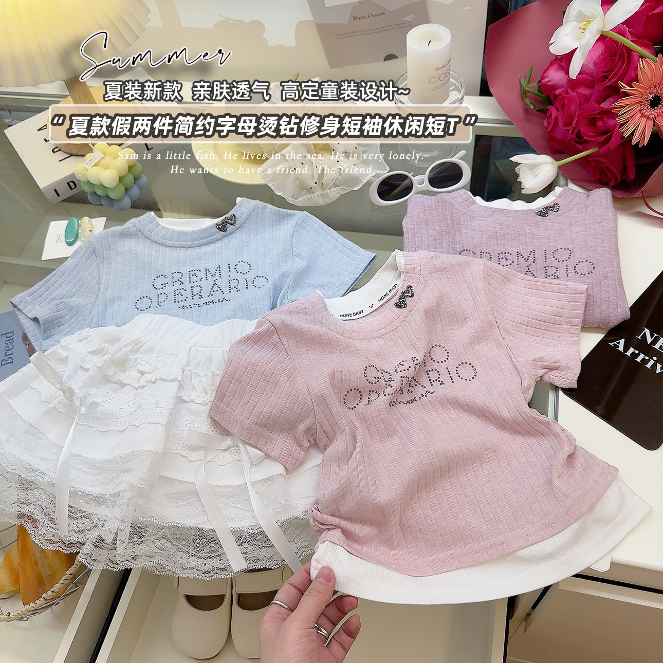 여성 보물 여름 핫 라인스톤이 박힌 가짜 투피스 아기 소녀 올 매치 뉴 도파민 스킨 친화적 인 소프트 크리스피 티셔츠스토어 가기