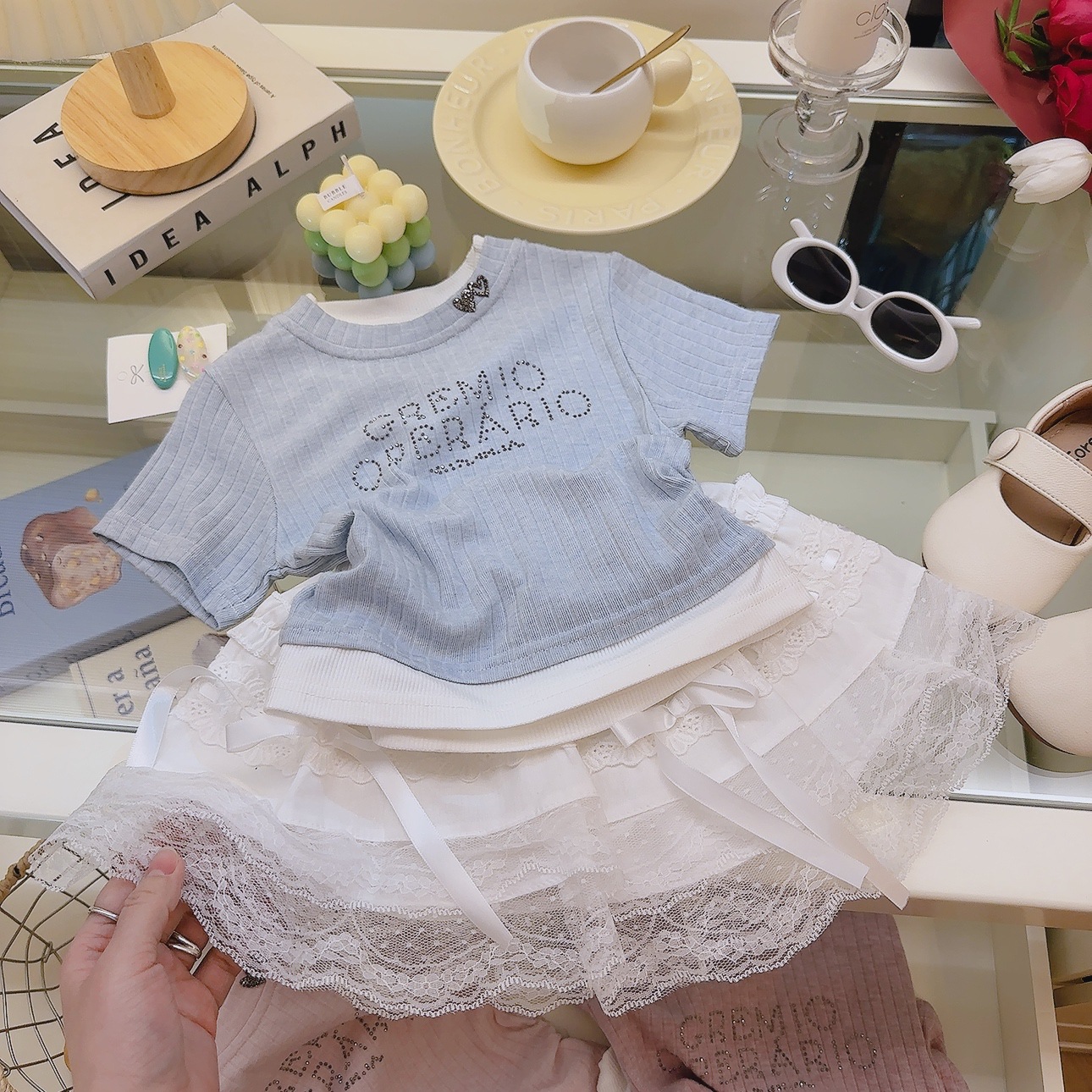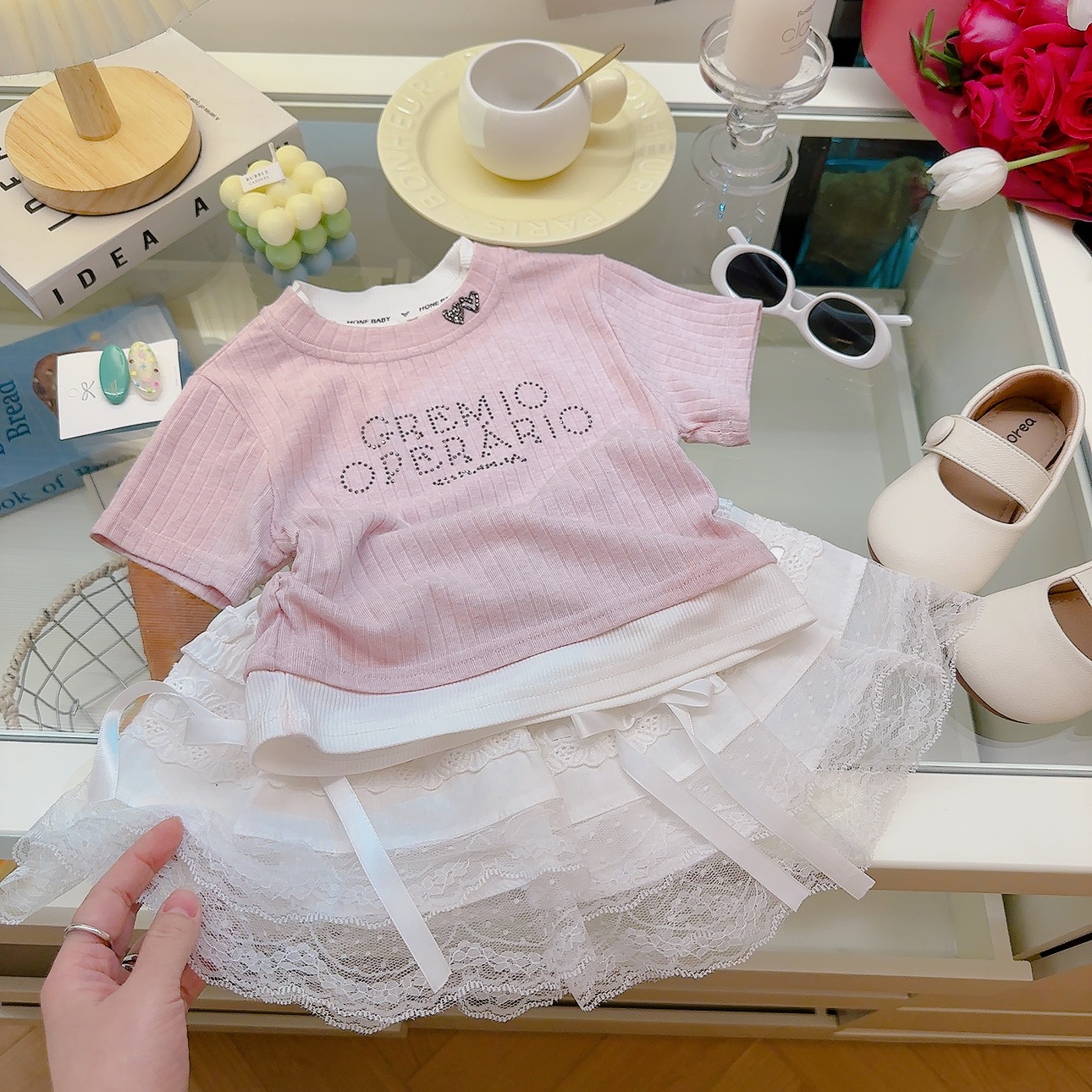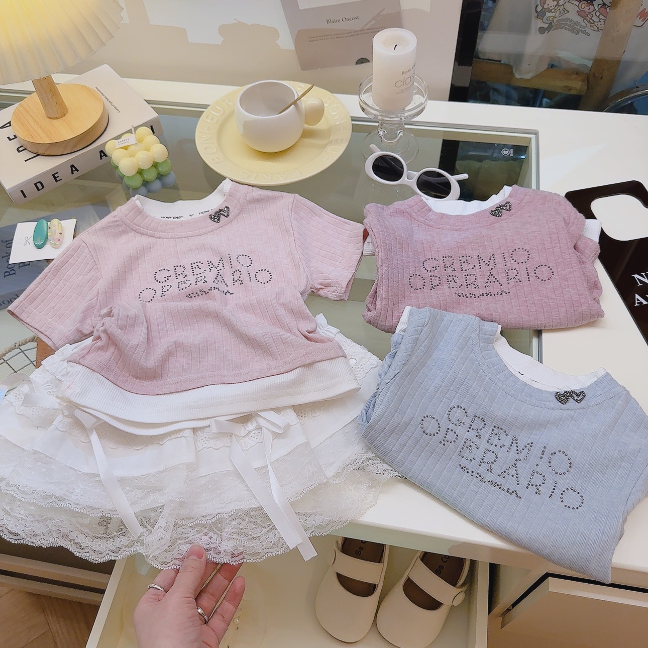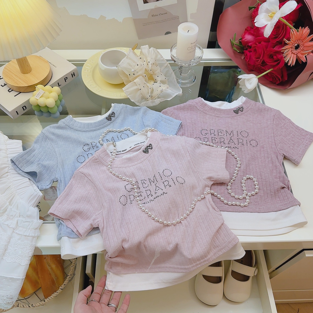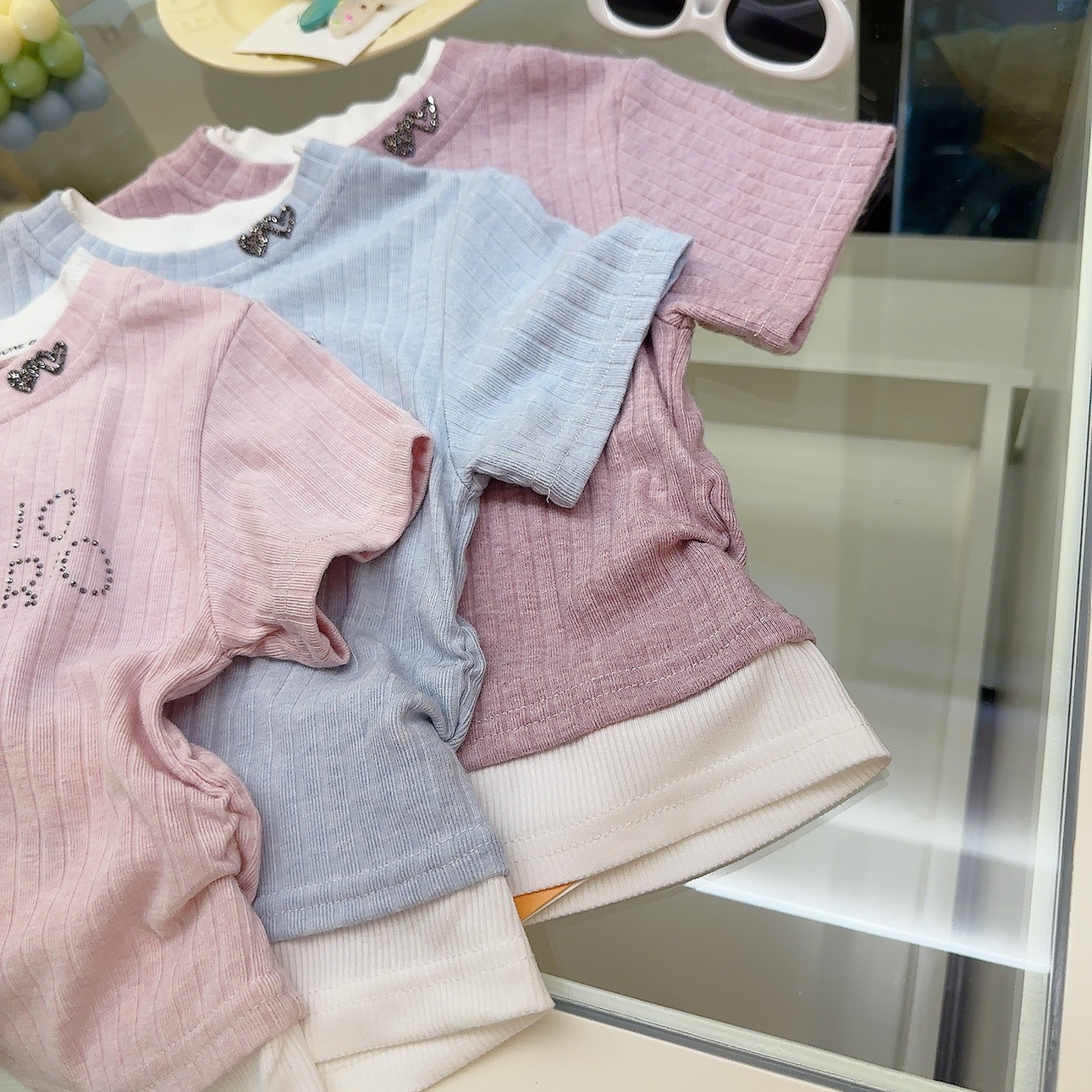 여성 보물 여름 핫 라인스톤이 박힌 가짜 투피스 아기 소녀 올 매치 뉴 도파민 스킨 친화적 인 소프트 크리스피 티셔츠스토어 가기
