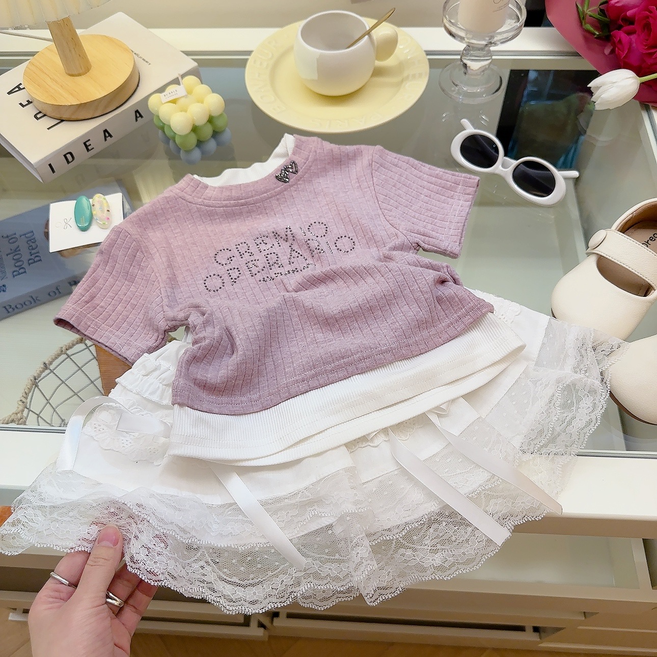 여성 보물 여름 핫 라인스톤이 박힌 가짜 투피스 아기 소녀 올 매치 뉴 도파민 스킨 친화적 인 소프트 크리스피 티셔츠