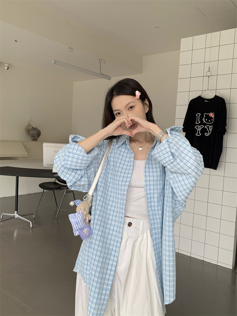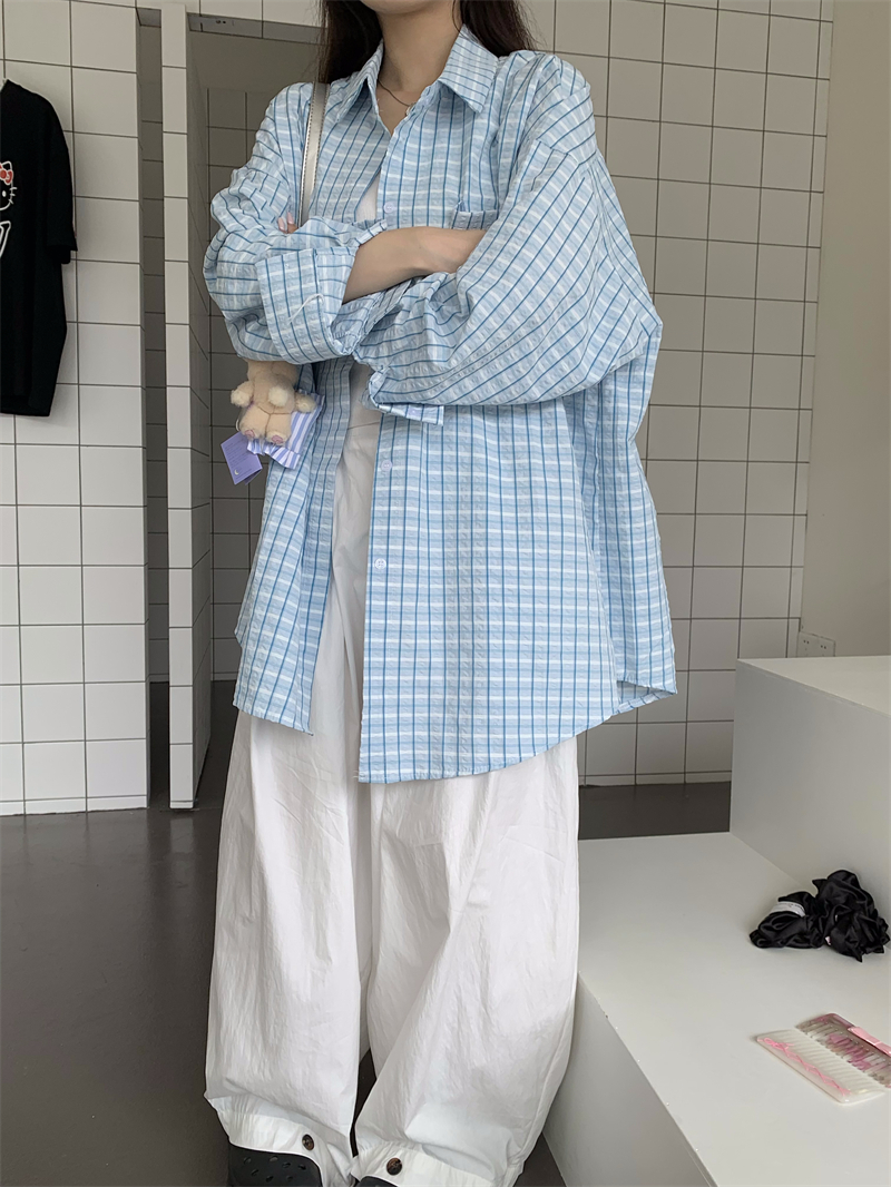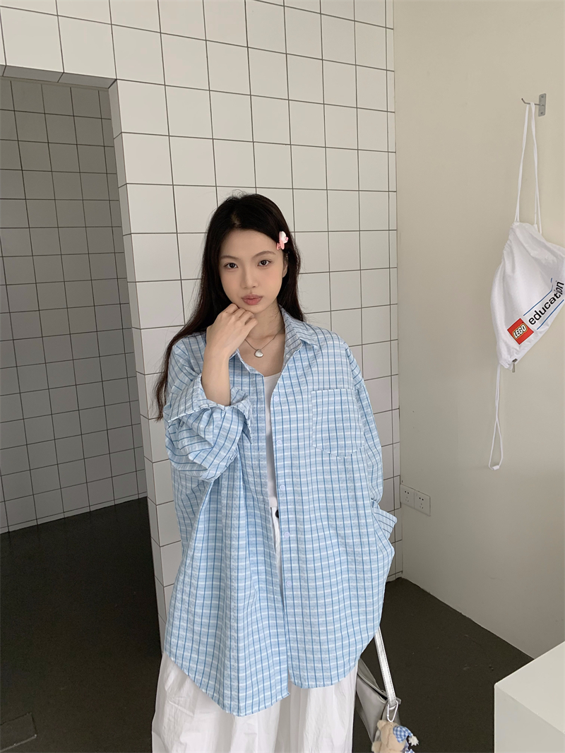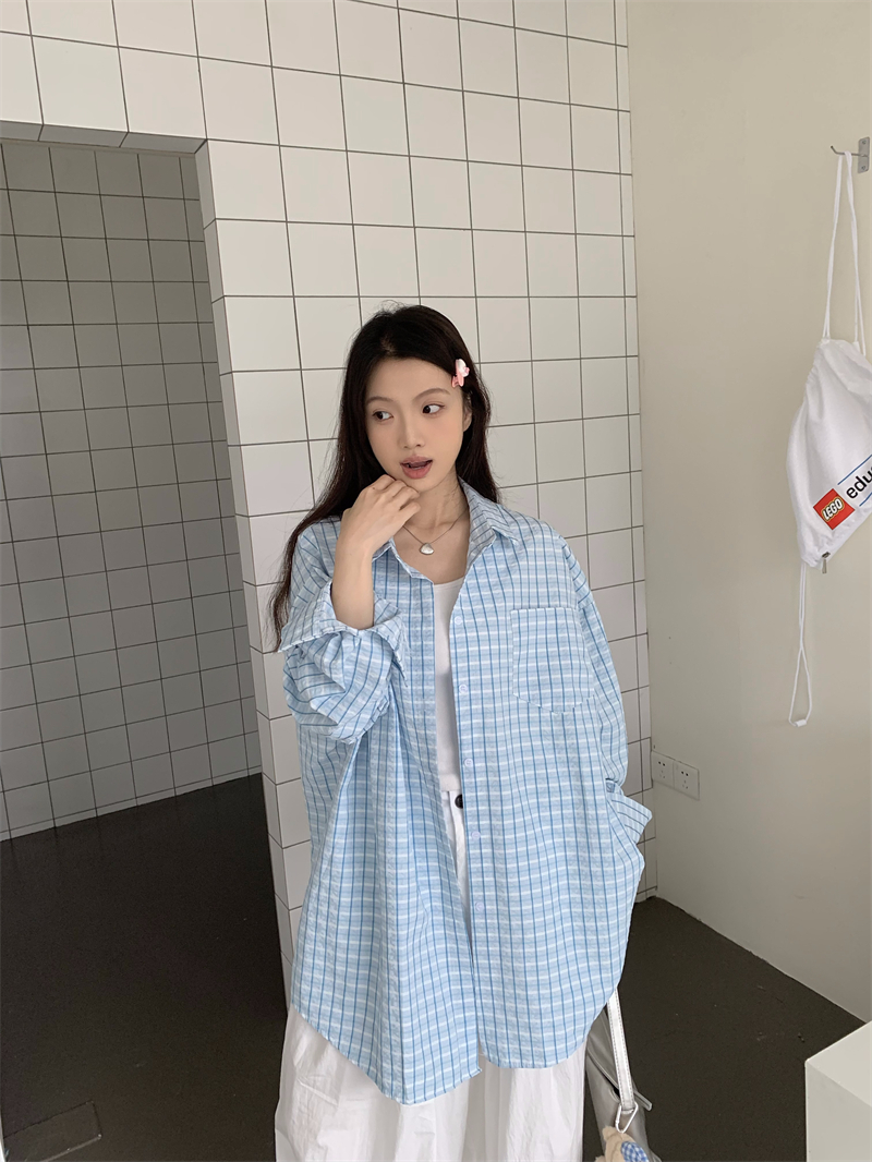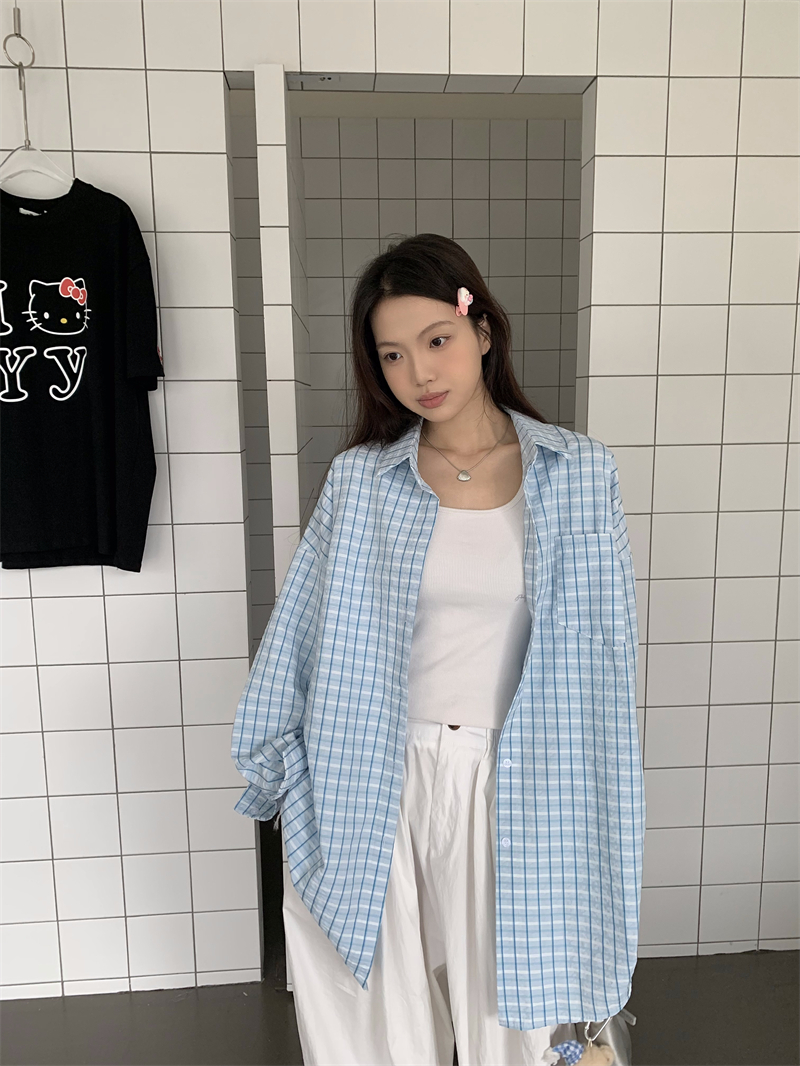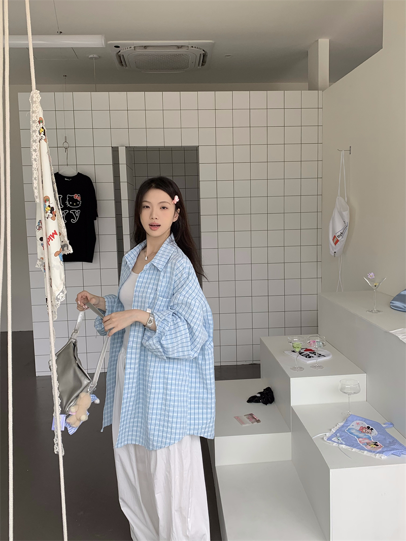 [재고] 파란 격자 무늬 셔츠 선스크린 셔츠 여성 여름 게으른 스타일 느슨한 캐주얼 카디건 재킷스토어 가기