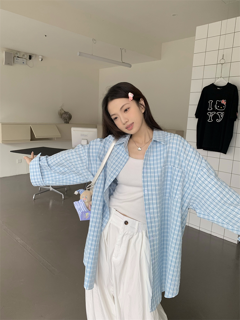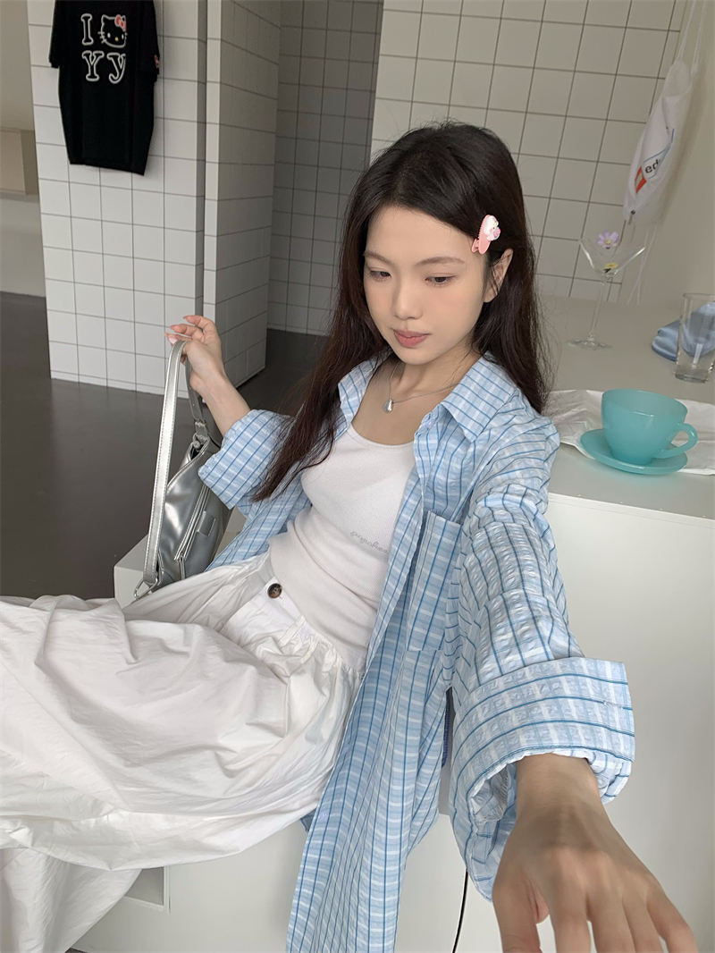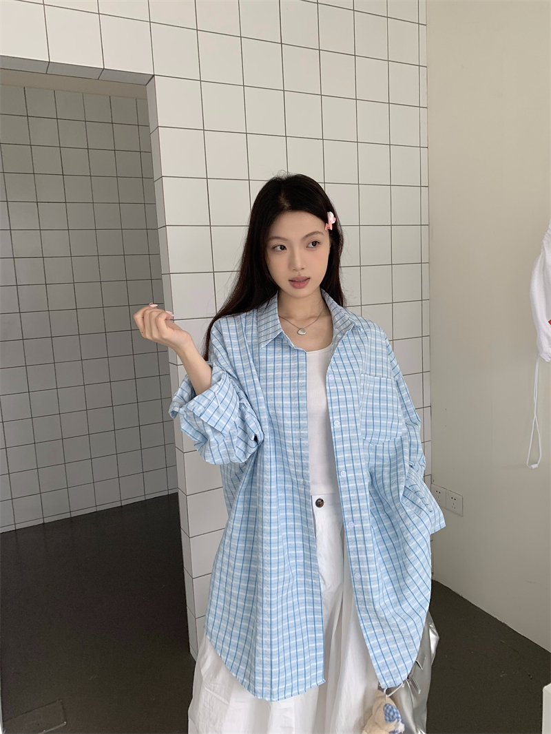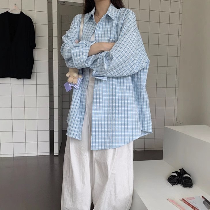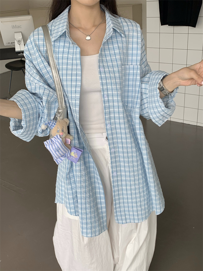 [재고] 파란 격자 무늬 셔츠 선스크린 셔츠 여성 여름 게으른 스타일 느슨한 캐주얼 카디건 재킷스토어 가기