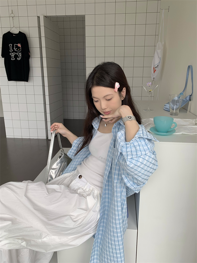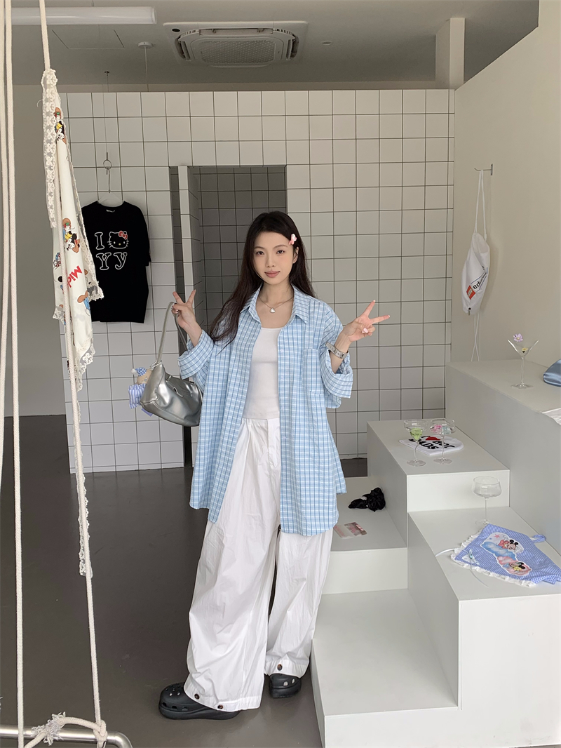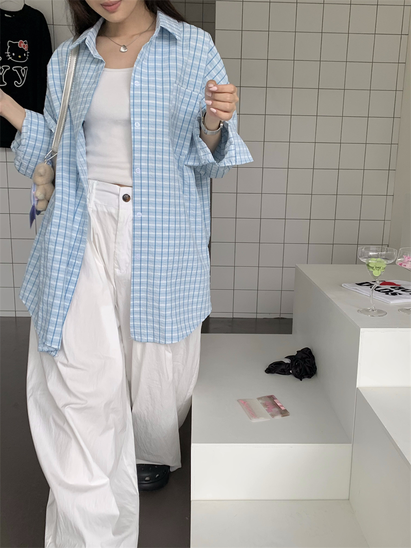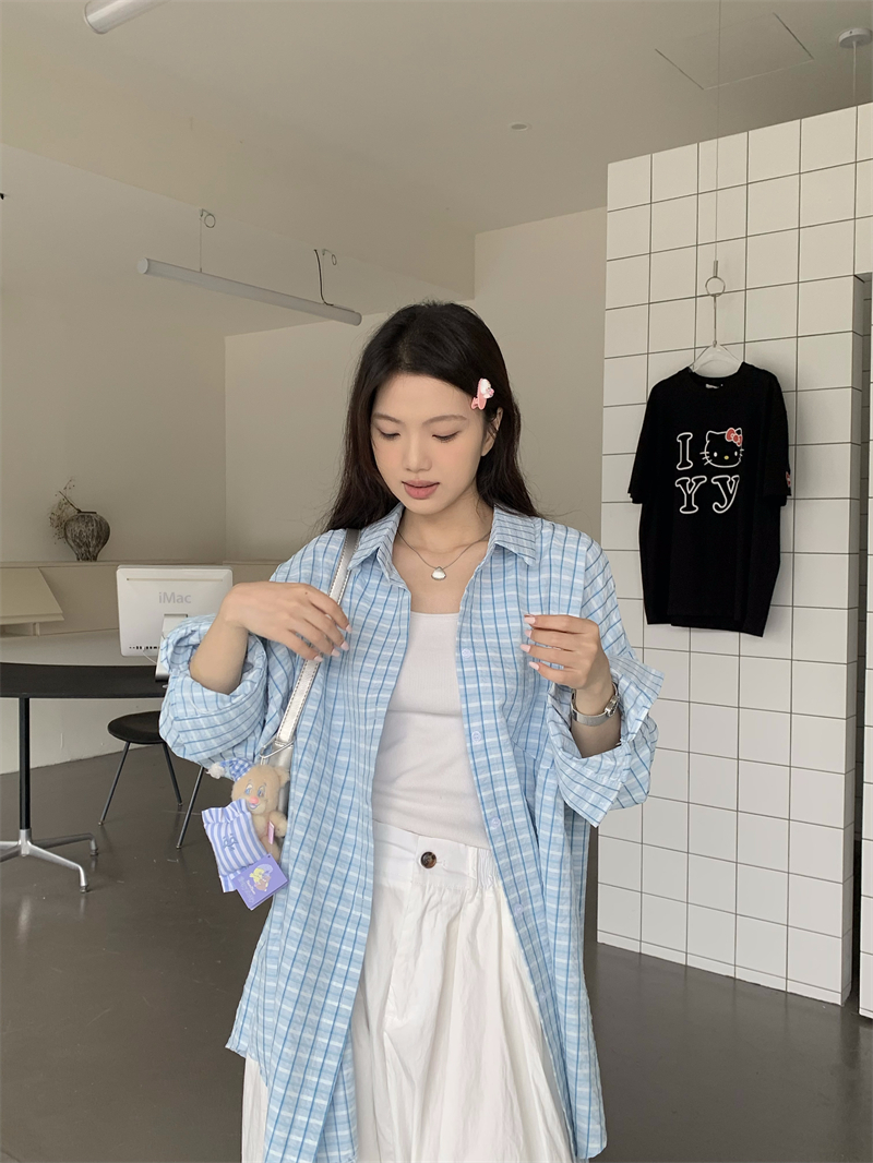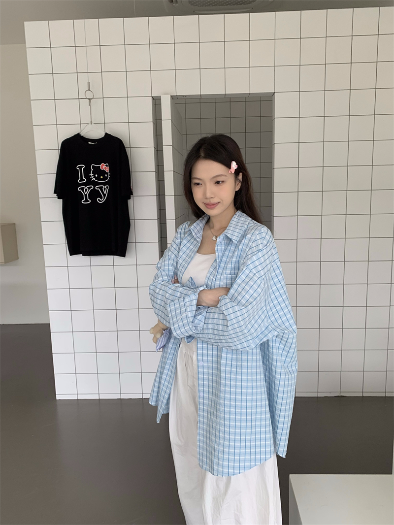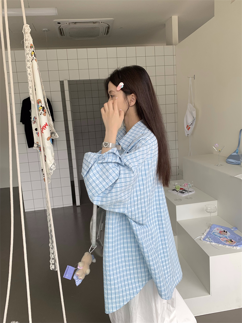 [재고] 파란 격자 무늬 셔츠 선스크린 셔츠 여성 여름 게으른 스타일 느슨한 캐주얼 카디건 재킷스토어 가기