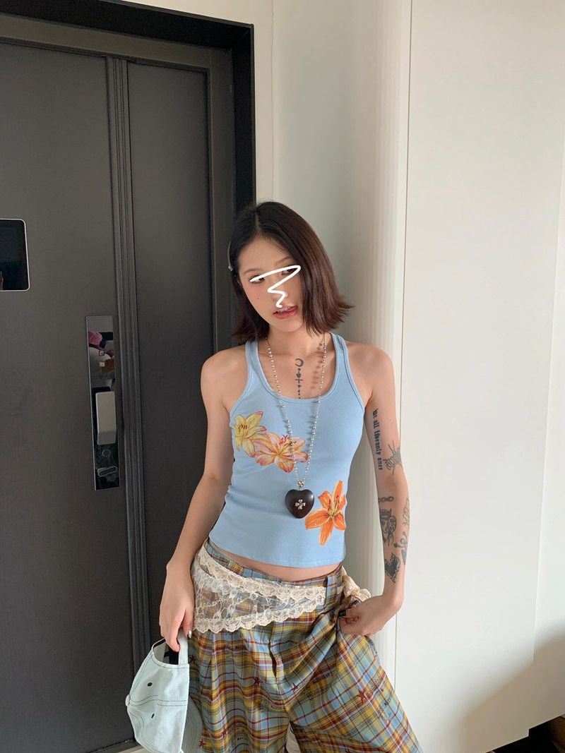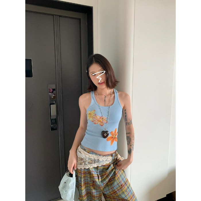 [40 카운트 모조 면] 프린트 조끼 여성 슬림핏 민소매 슬링 탑 블루 아메리칸 핫 걸스토어 가기