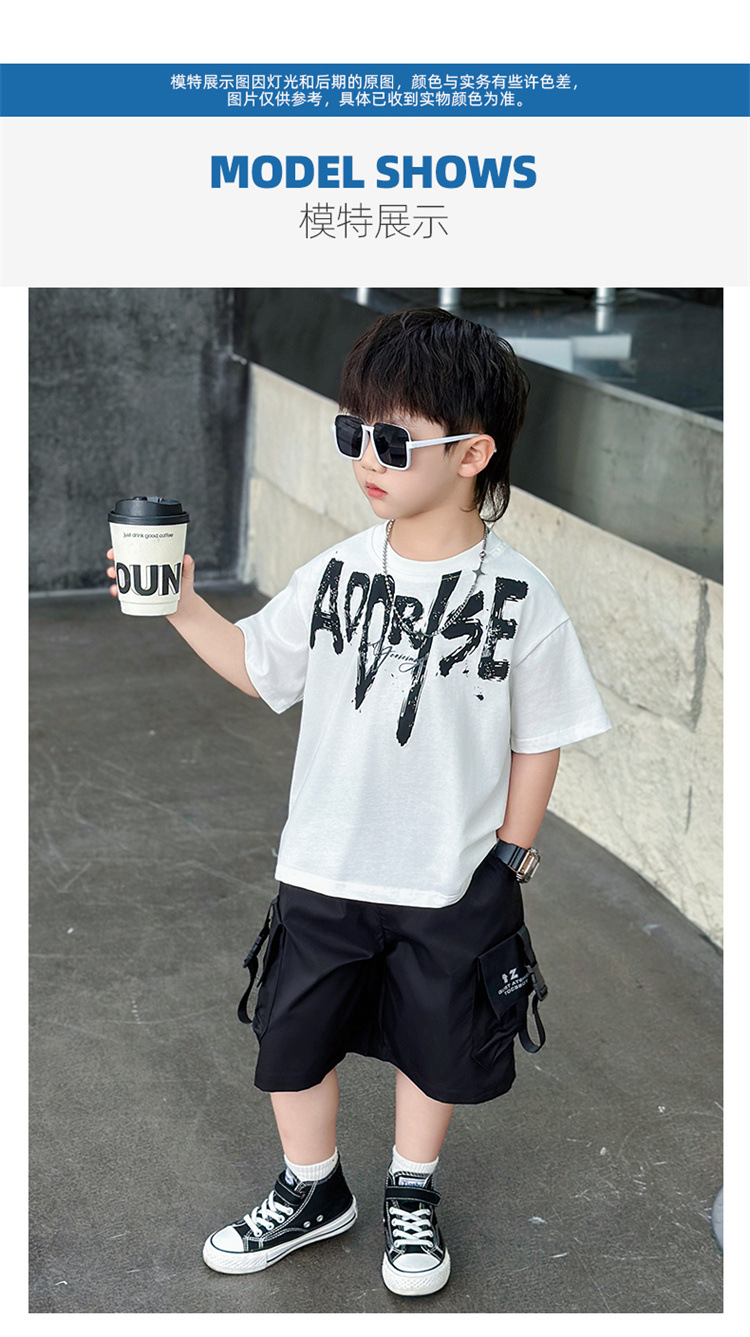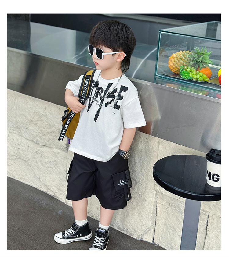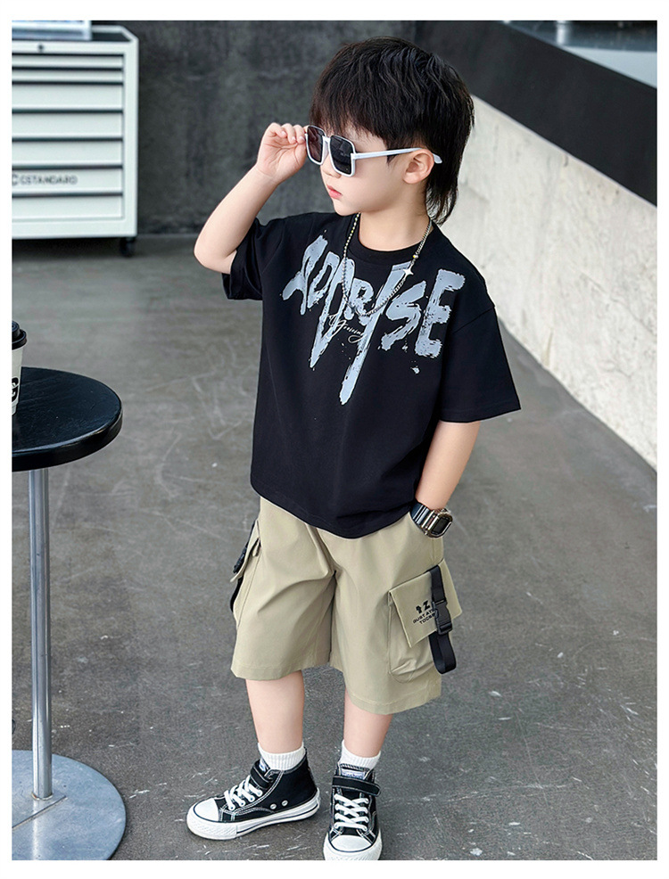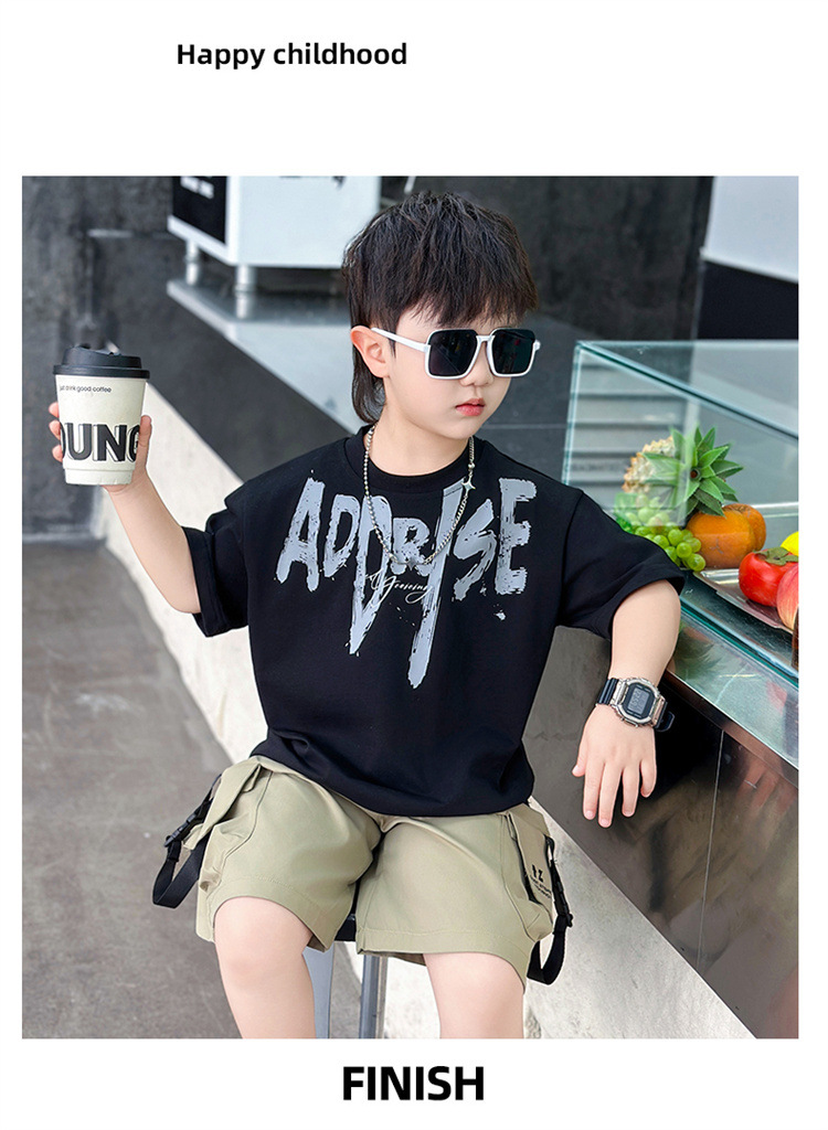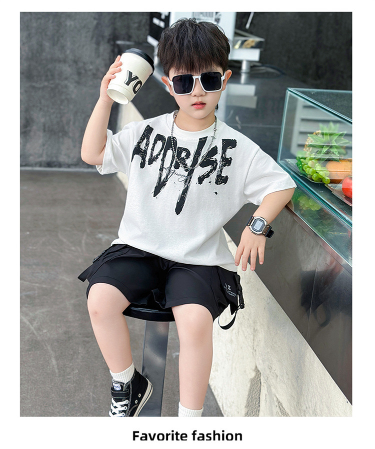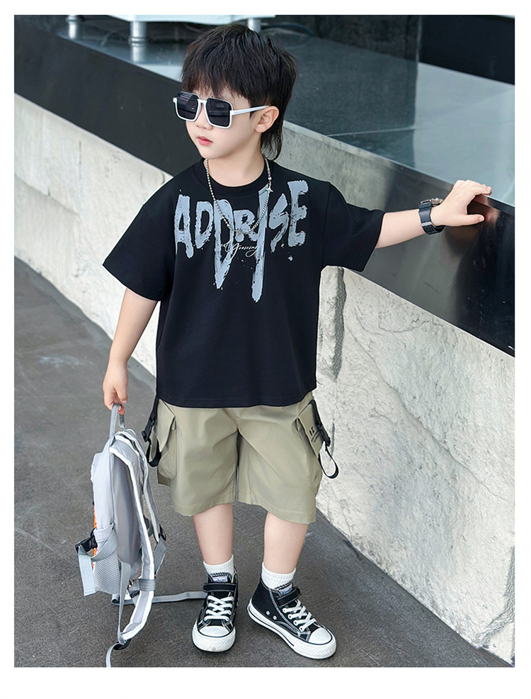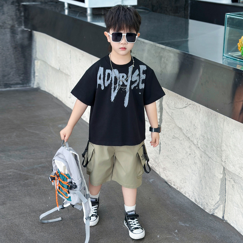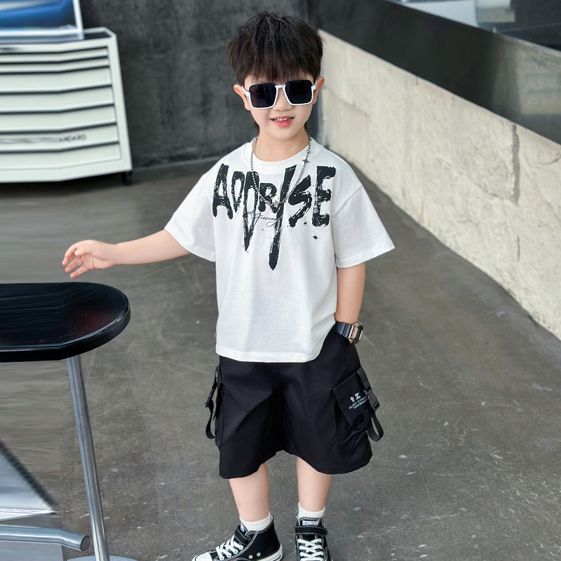 트렌디한 아동 여름 의류 네크라인 레터링 반팔 양복 2025 여름 새로운 스타일 잘 생긴 아기 소년 인터넷 연예인 유행 옷스토어 가기