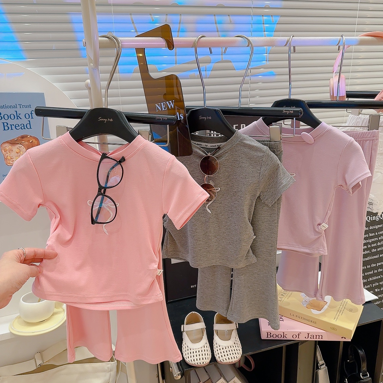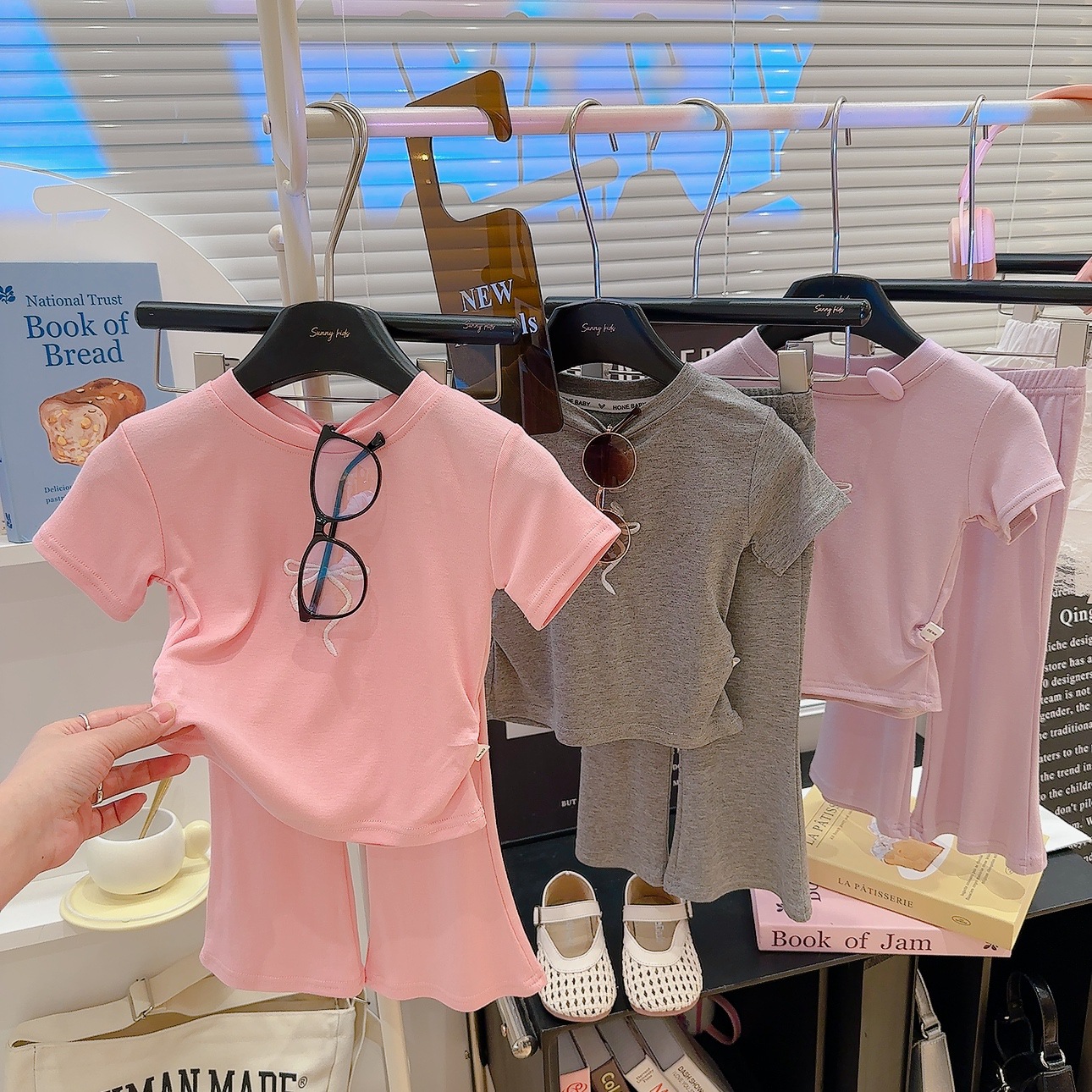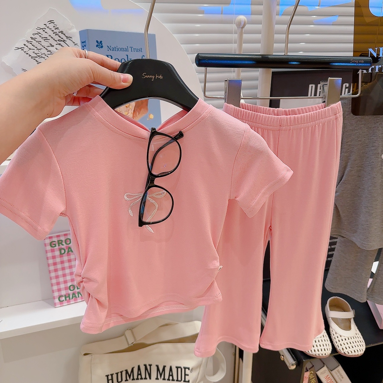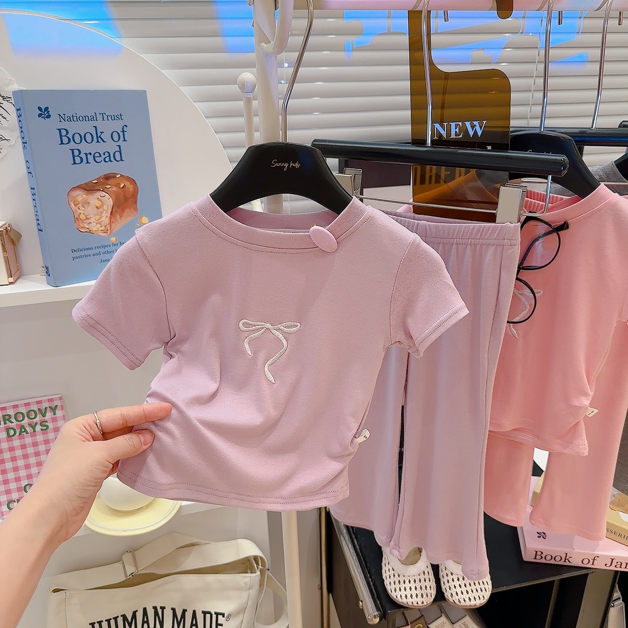 새로운 스타일의 편안한 2026 여아 자수 리본 아동복 세트, 허리 조절 가능한 반팔 얇은 플레어 팬츠 투피스 세트스토어 가기