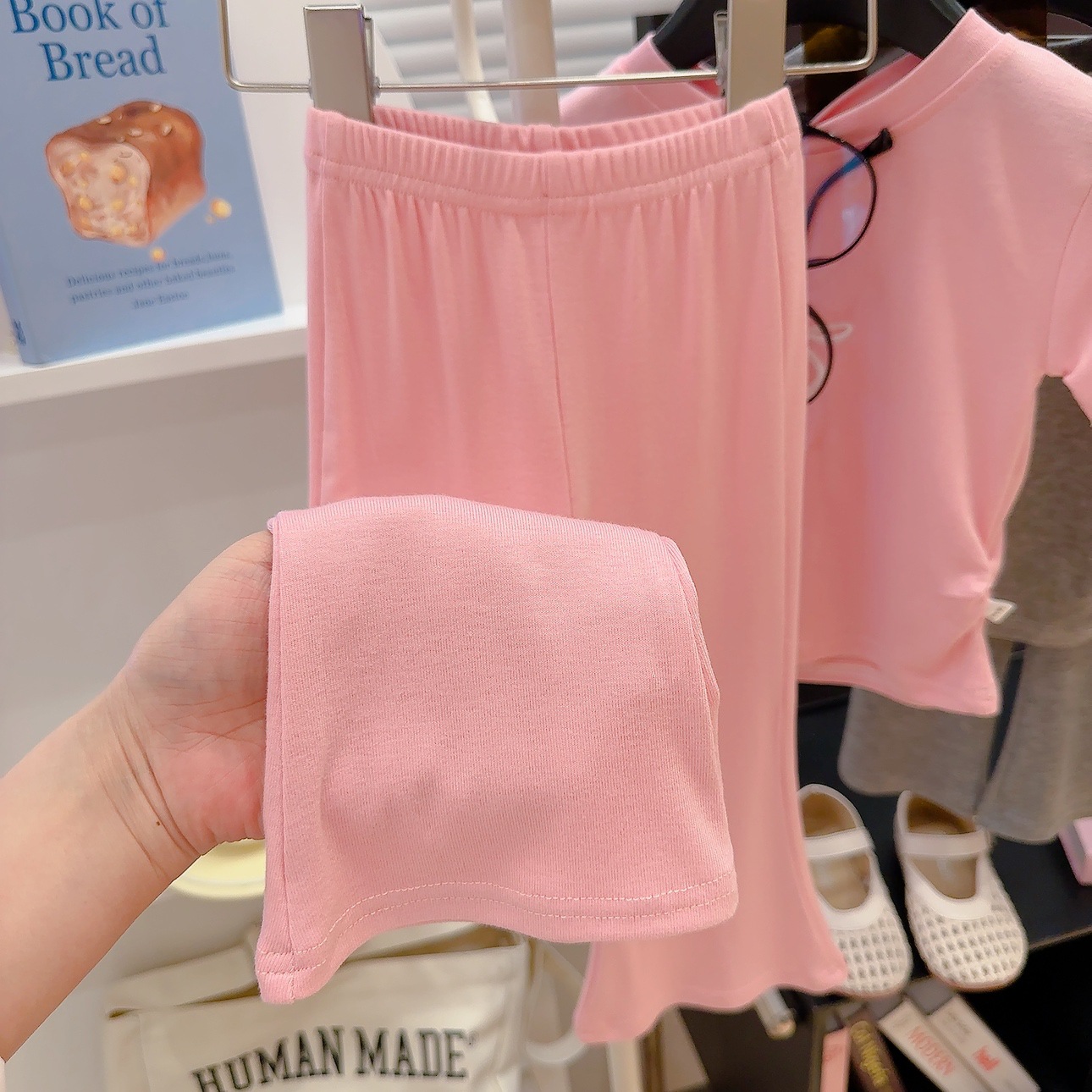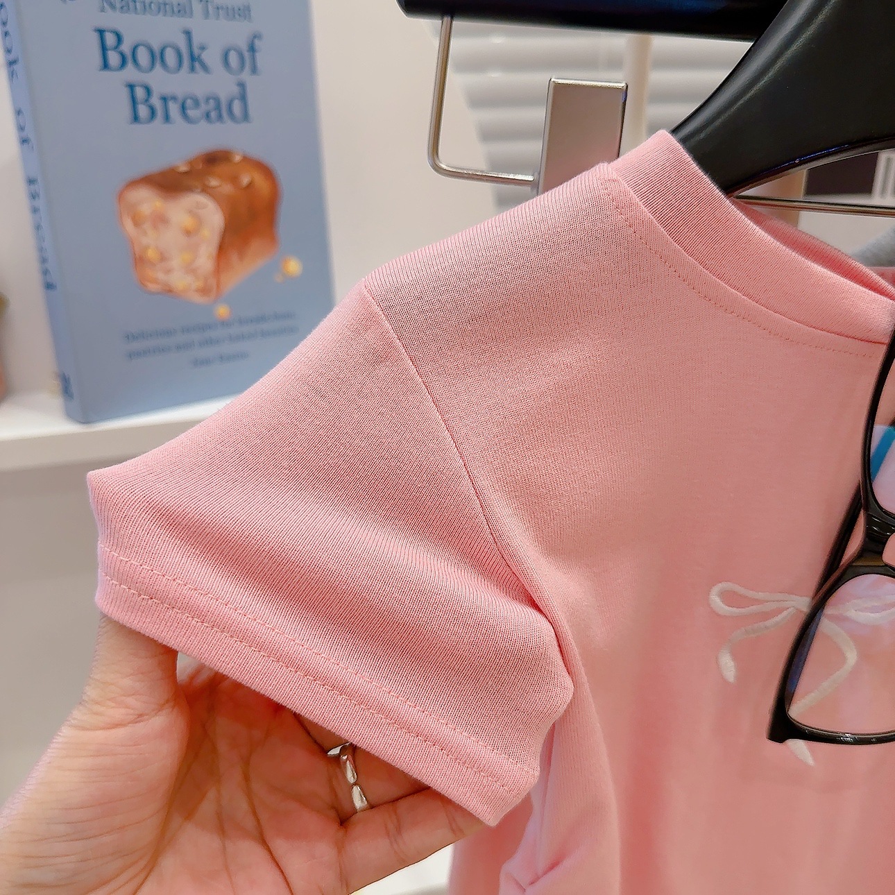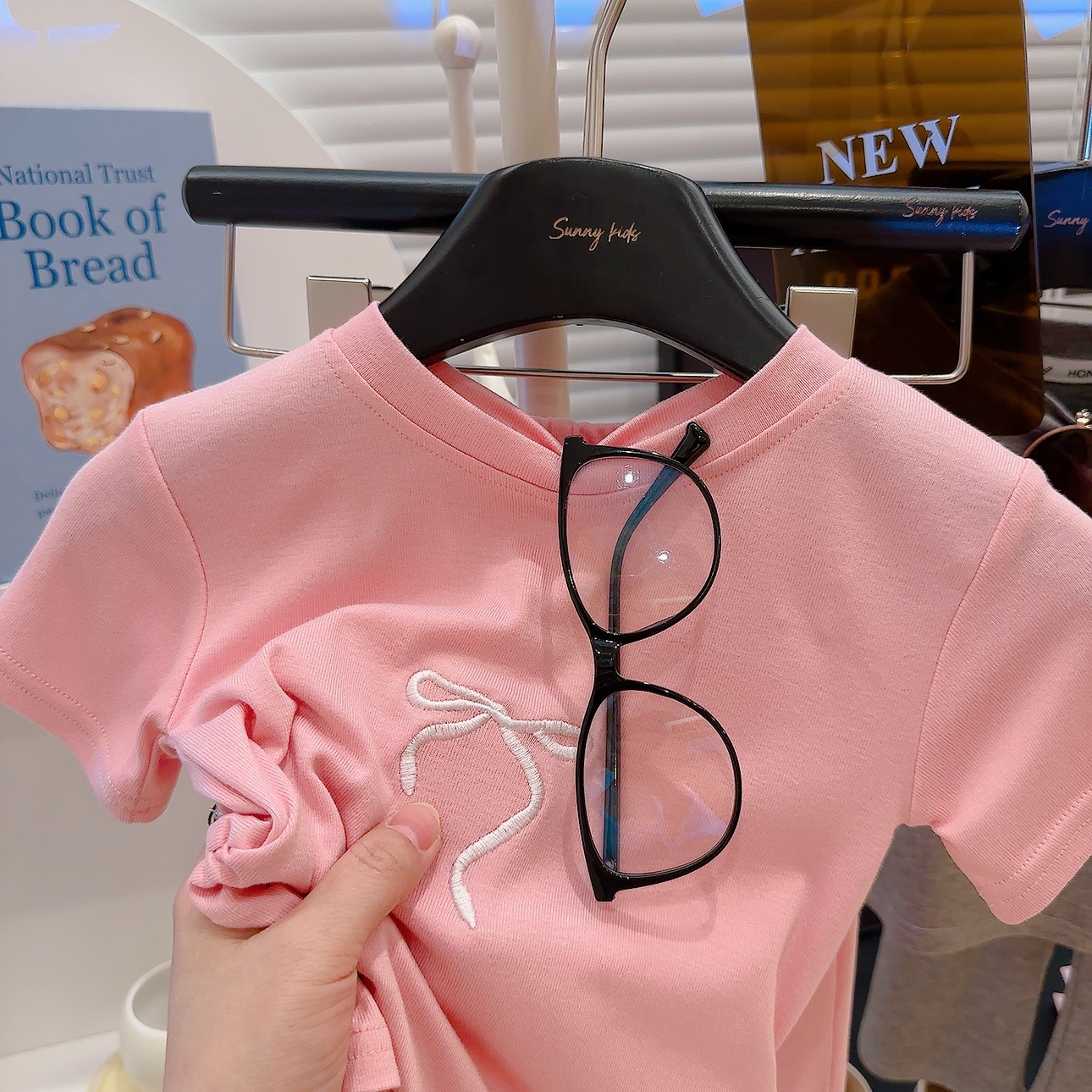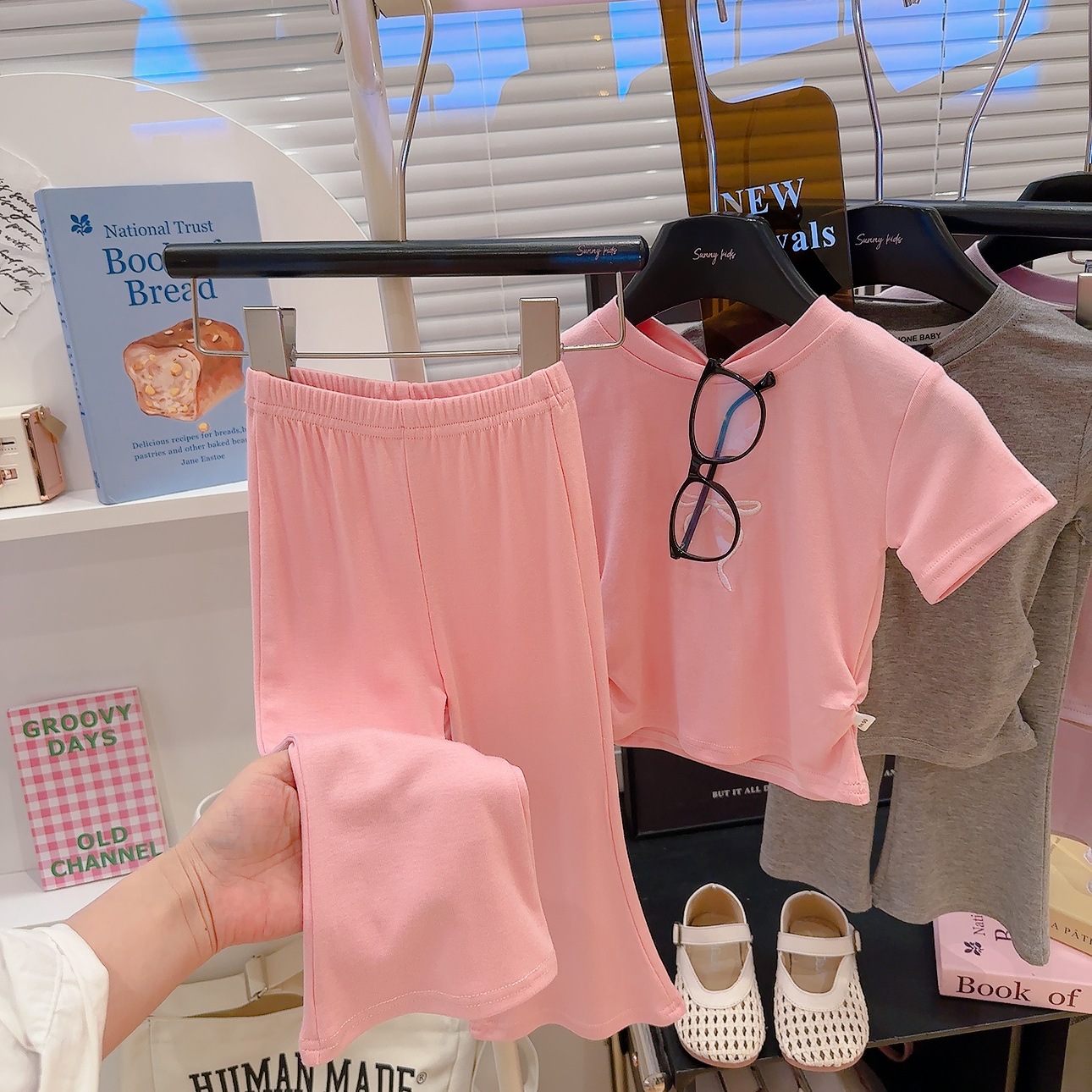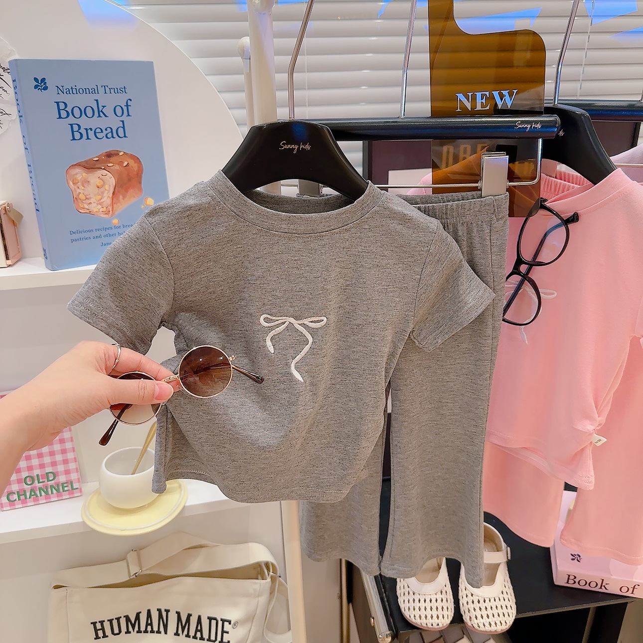 새로운 스타일의 편안한 2026 여아 자수 리본 아동복 세트, 허리 조절 가능한 반팔 얇은 플레어 팬츠 투피스 세트스토어 가기