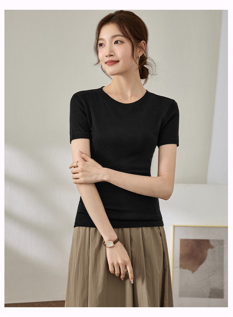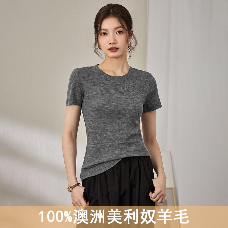 100 퓨어 울 라이트 럭셔리 라운드 넥 짧은 소매 여성용 티셔츠 2025 여름 새로운 하이 엔드 솔리드 컬러 의류 탑