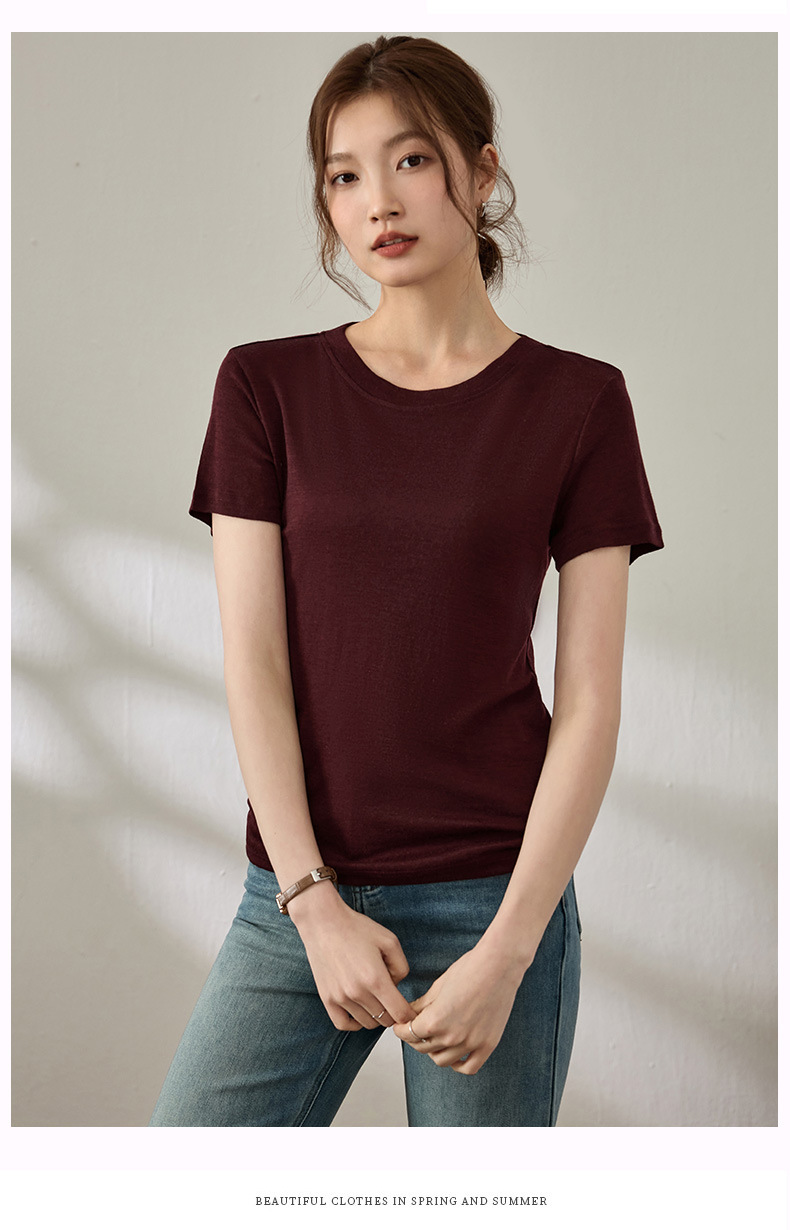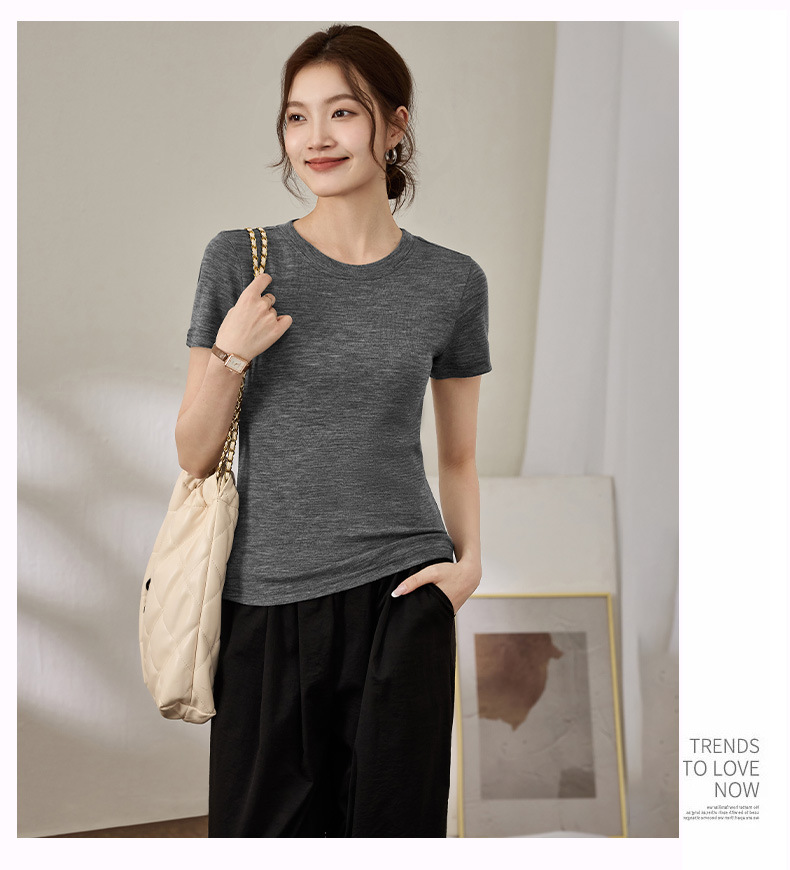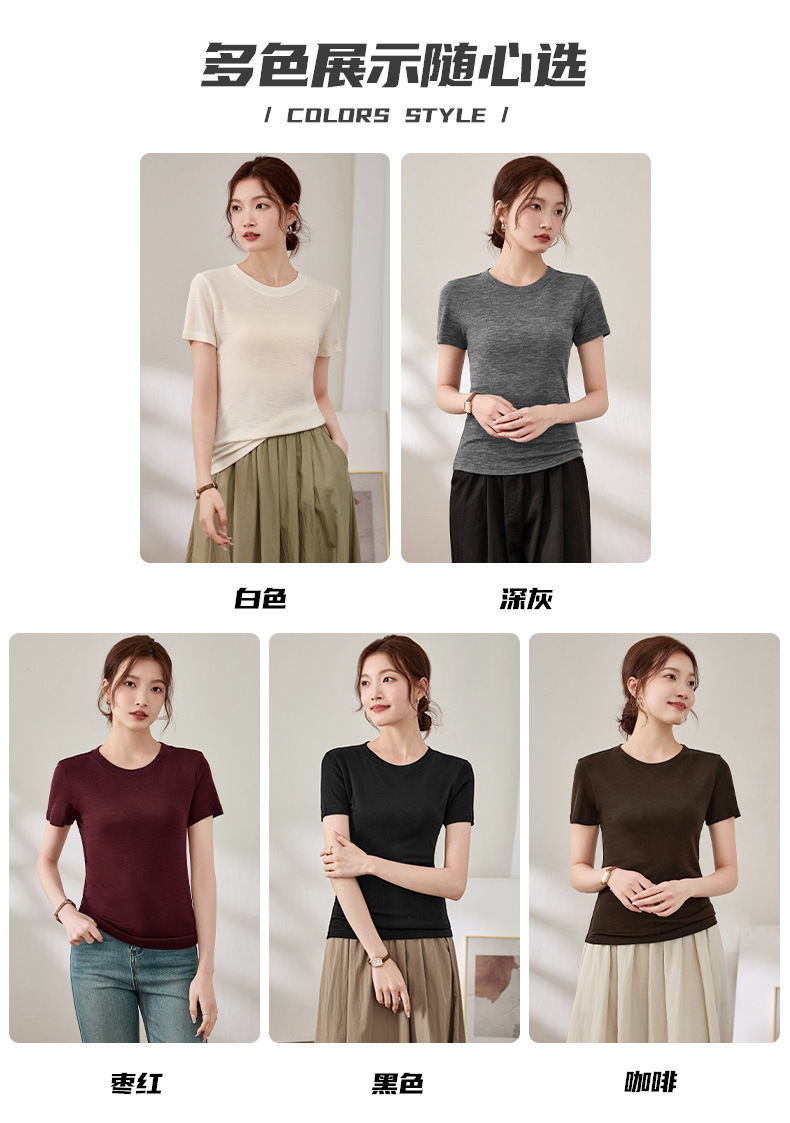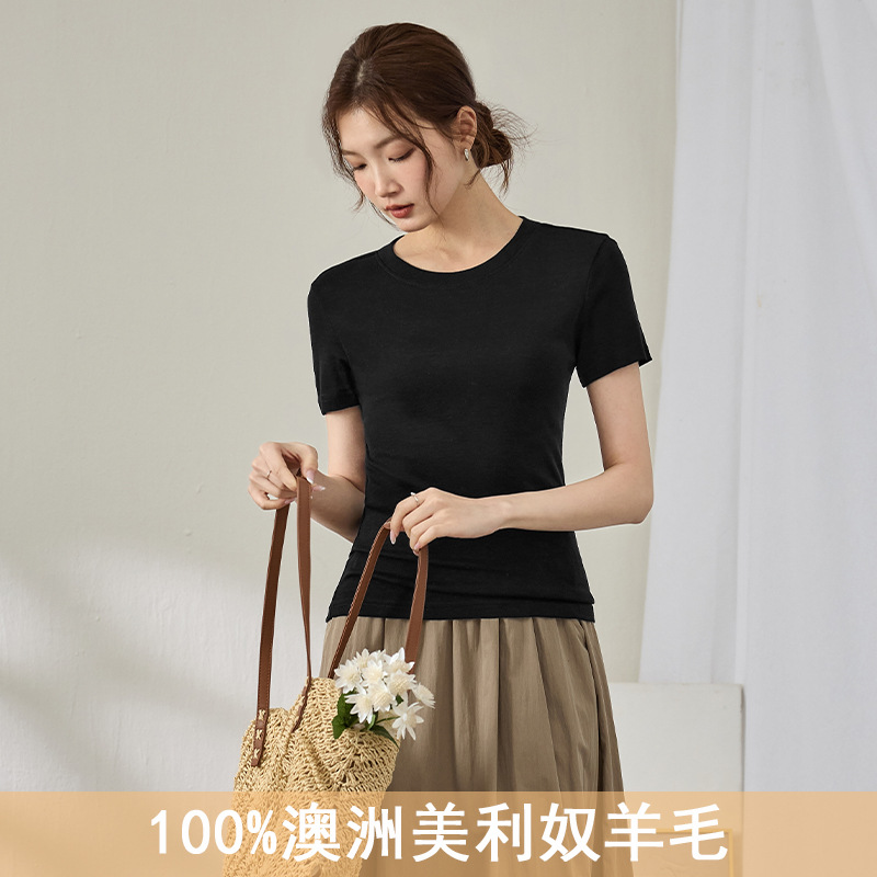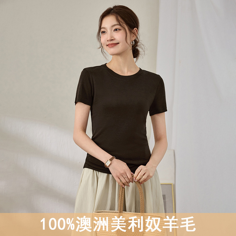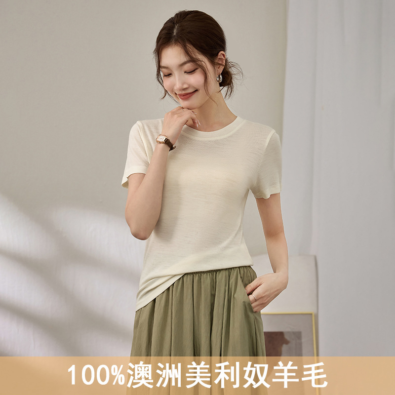 100 퓨어 울 라이트 럭셔리 라운드 넥 짧은 소매 여성용 티셔츠 2025 여름 새로운 하이 엔드 솔리드 컬러 의류 탑스토어 가기