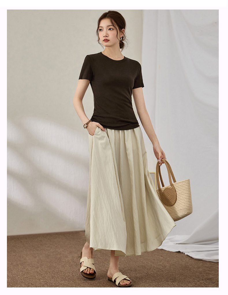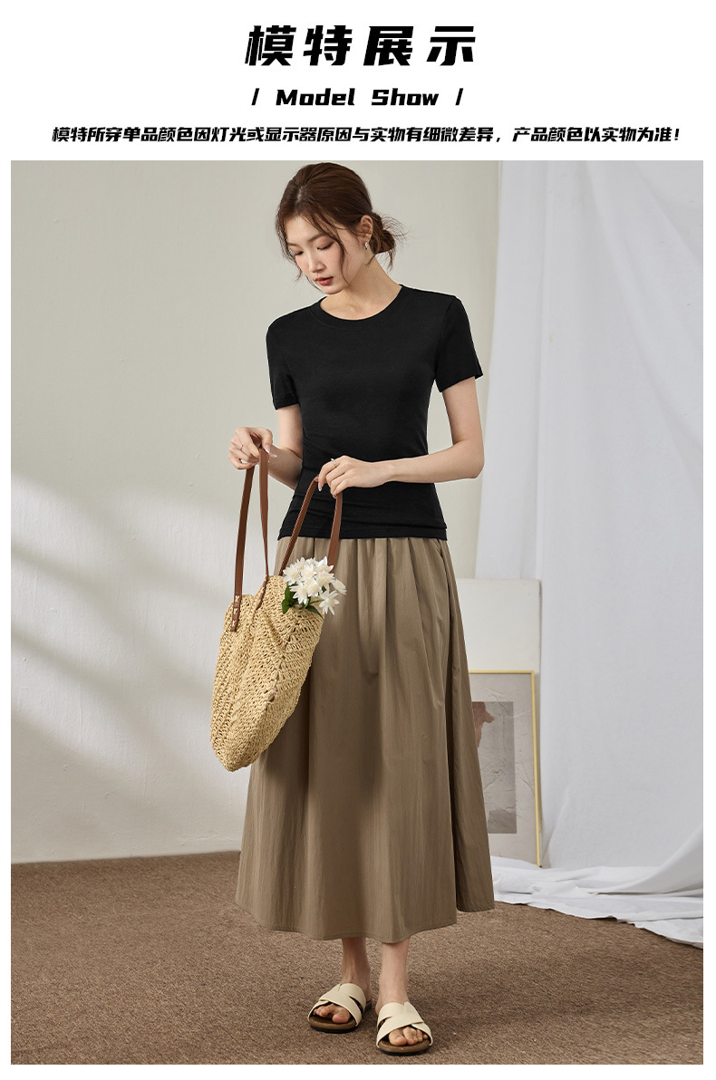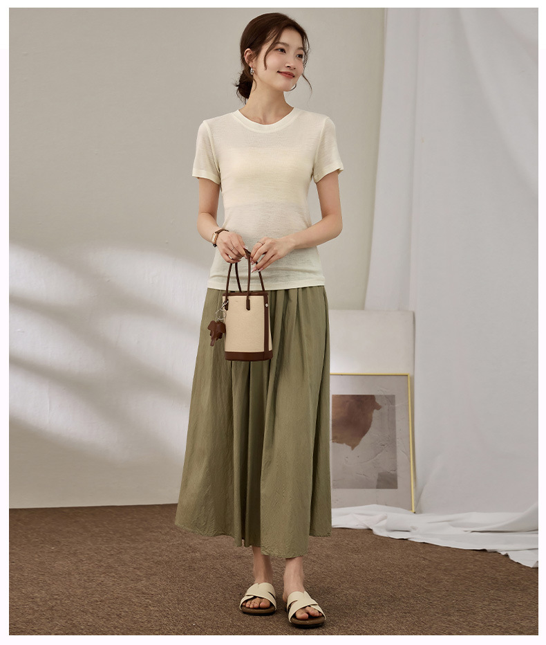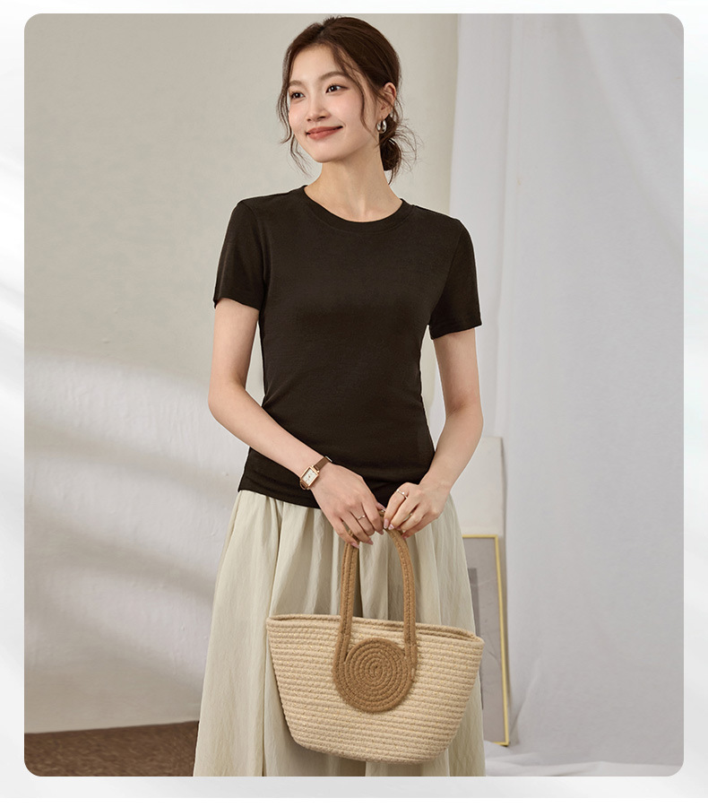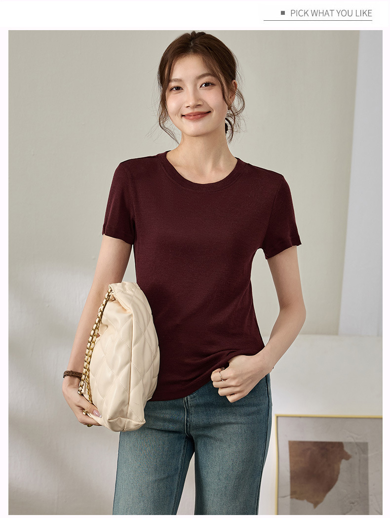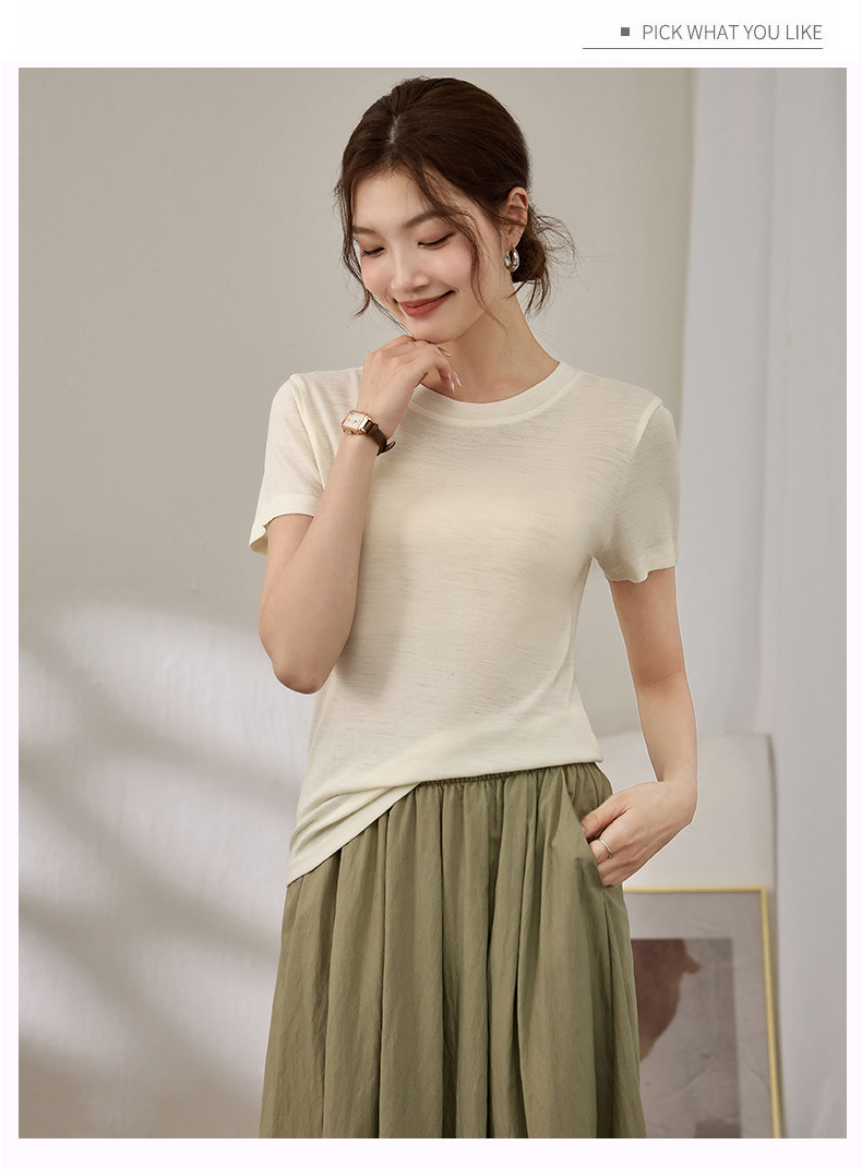 100 퓨어 울 라이트 럭셔리 라운드 넥 짧은 소매 여성용 티셔츠 2025 여름 새로운 하이 엔드 솔리드 컬러 의류 탑스토어 가기