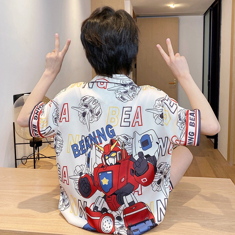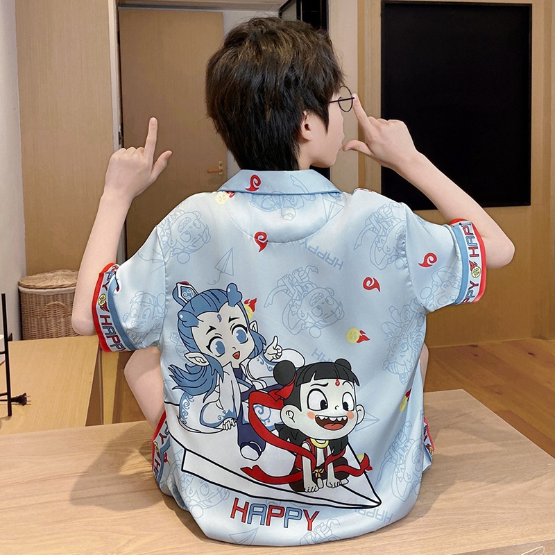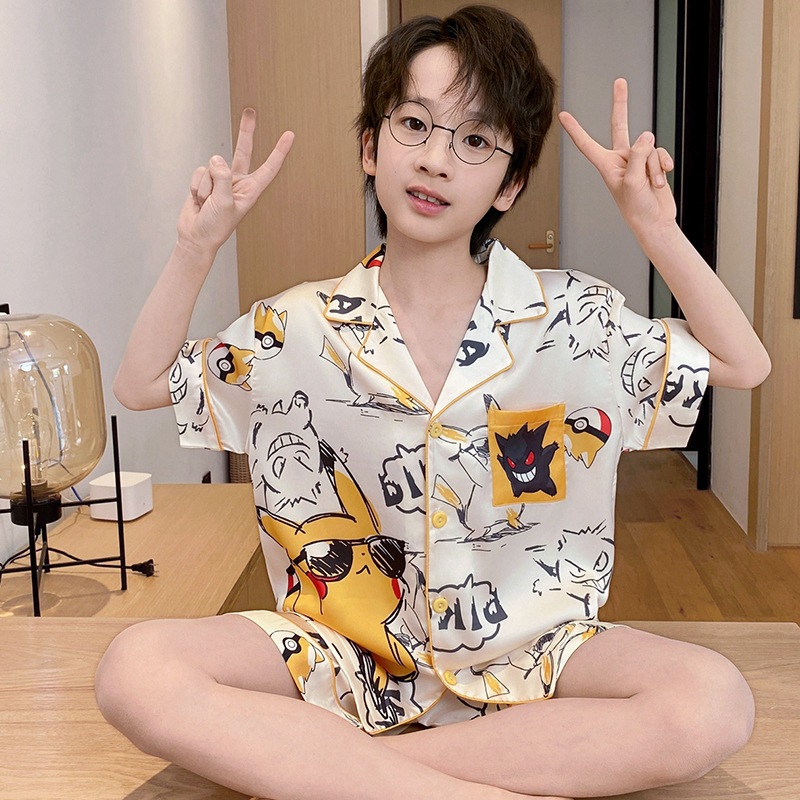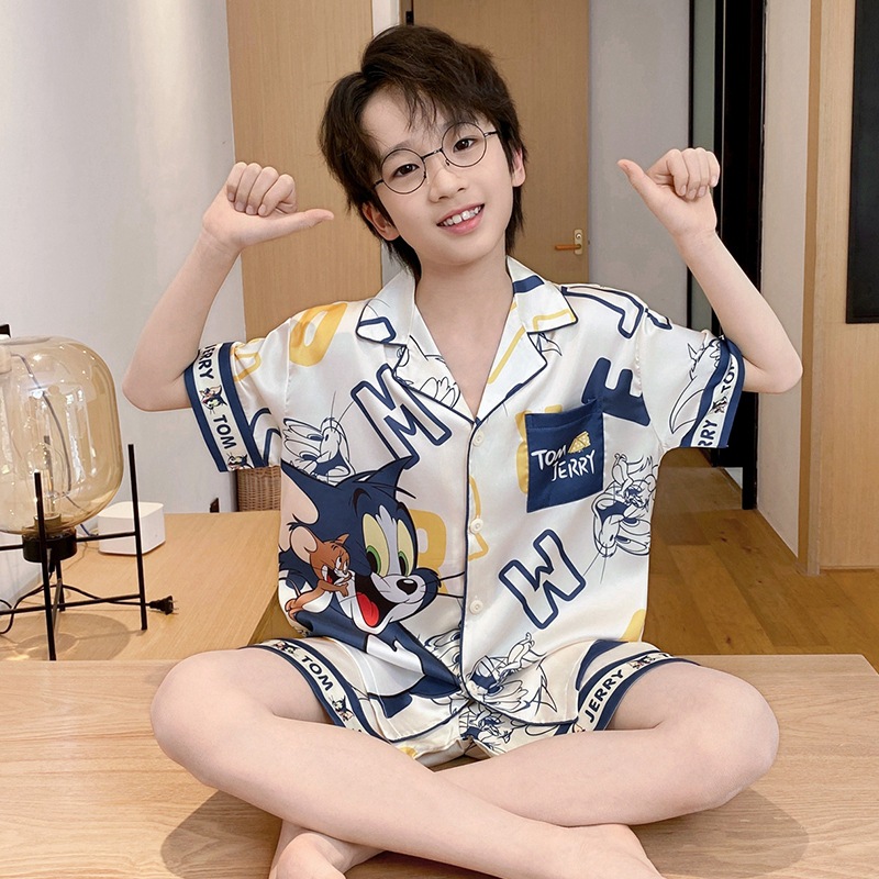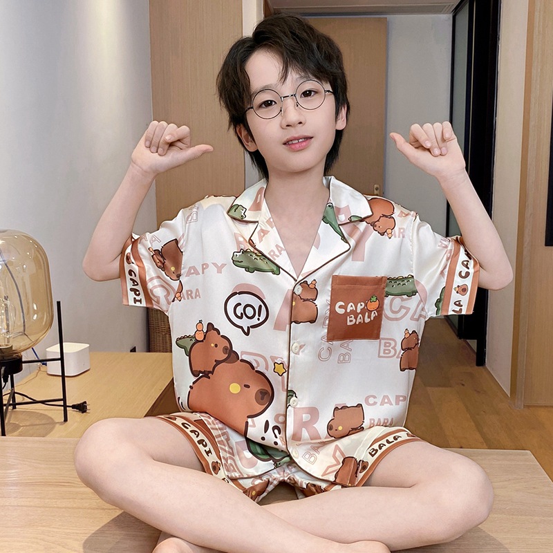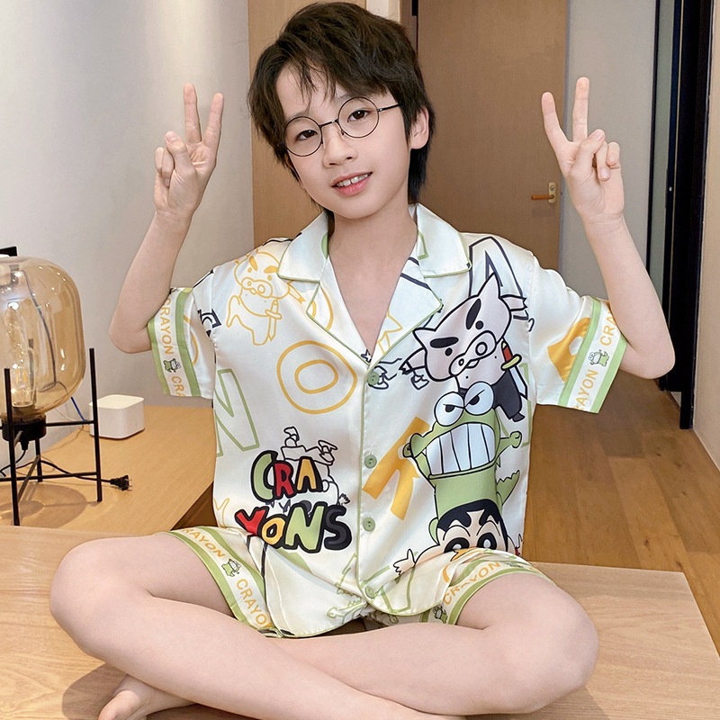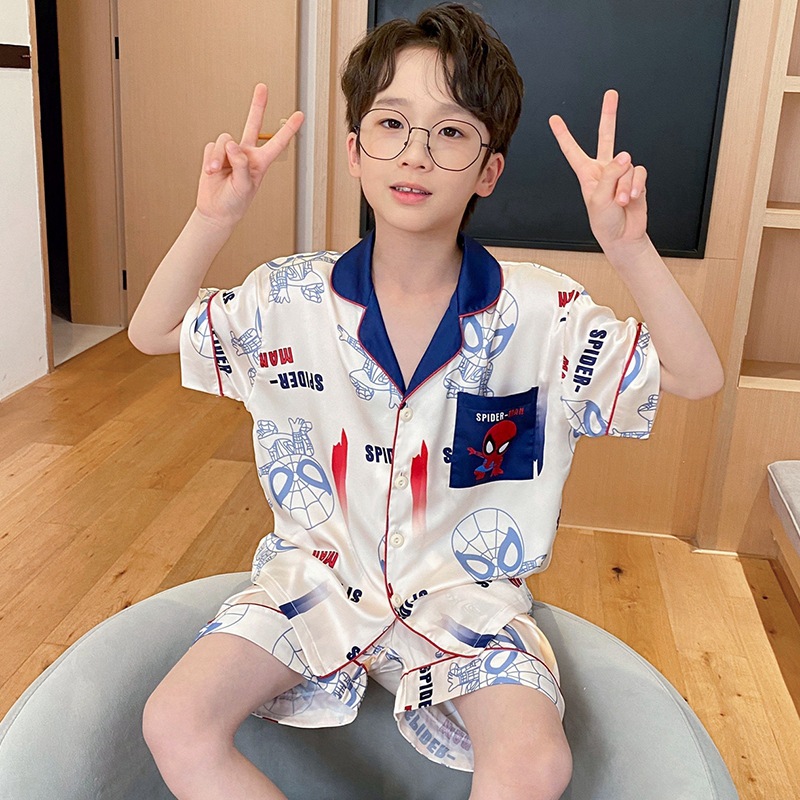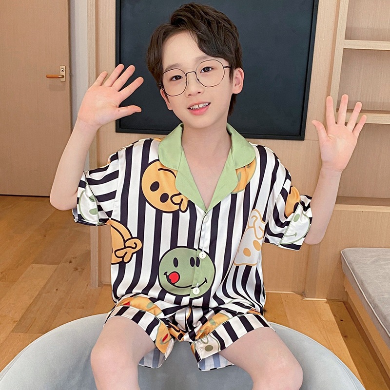 아동용 잠옷, 남아용 여름 얇은 얼음 실크 반팔 여름 스타일, 중대형 아동용 12세 및 13세 남아용 인터넷 연예인 잘 생긴 양복