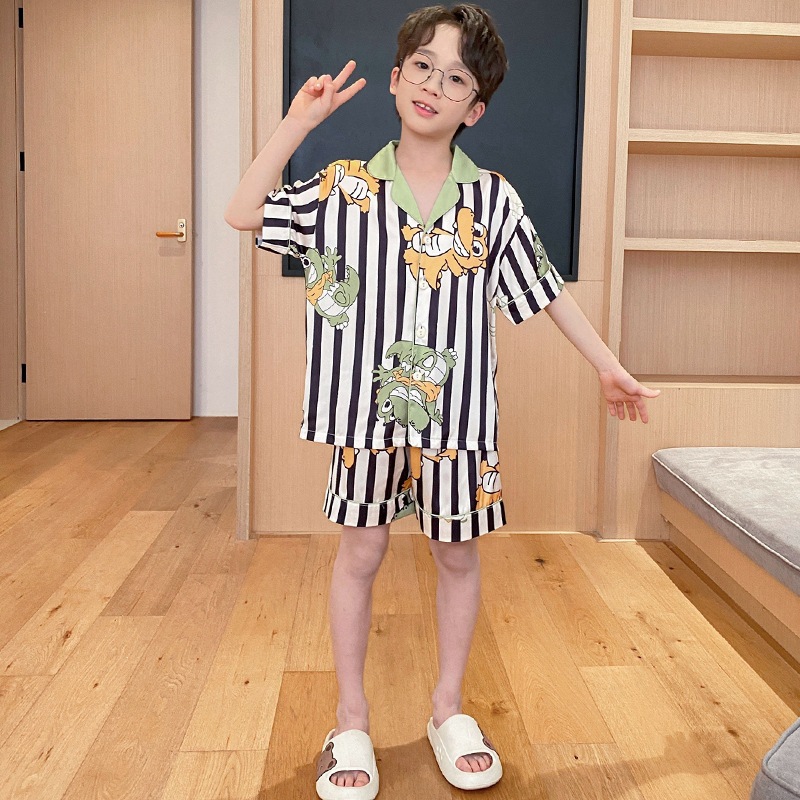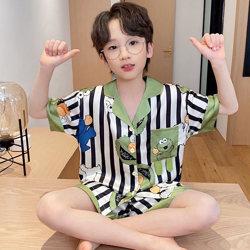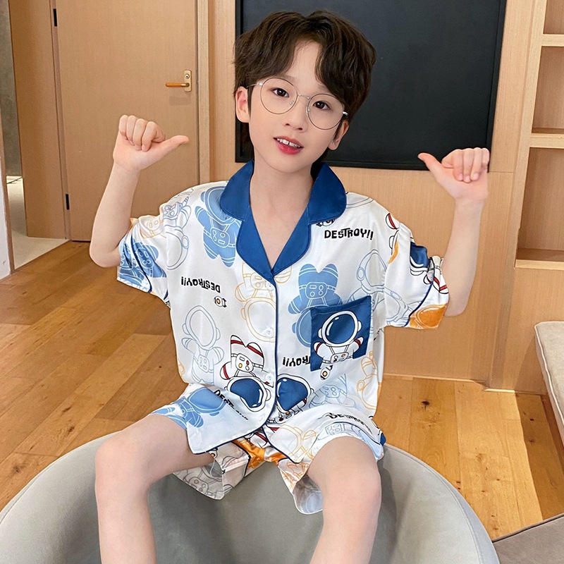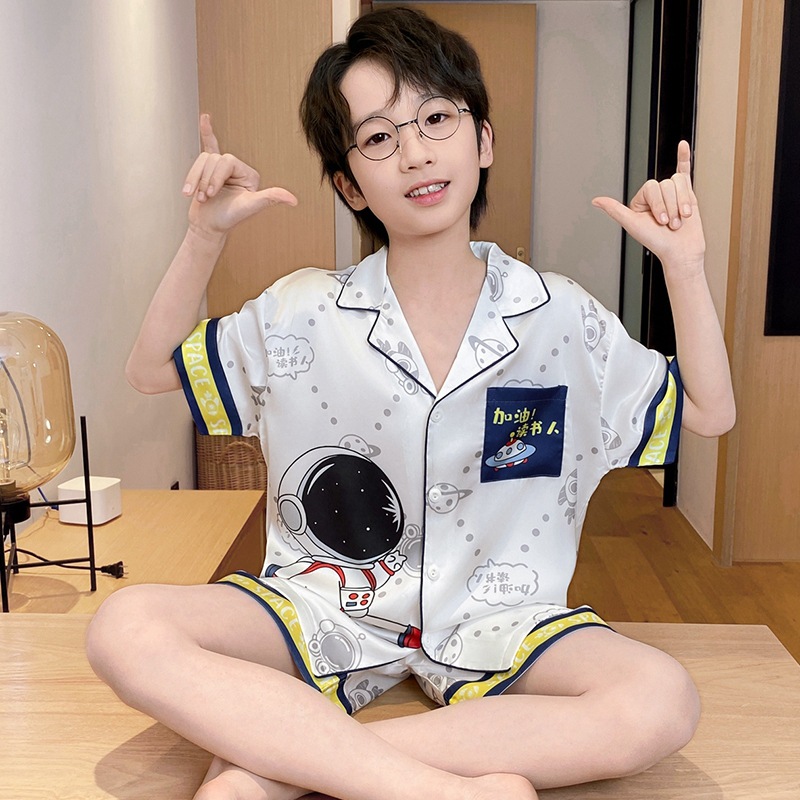 아동용 잠옷, 남아용 여름 얇은 얼음 실크 반팔 여름 스타일, 중대형 아동용 12세 및 13세 남아용 인터넷 연예인 잘 생긴 양복스토어 가기