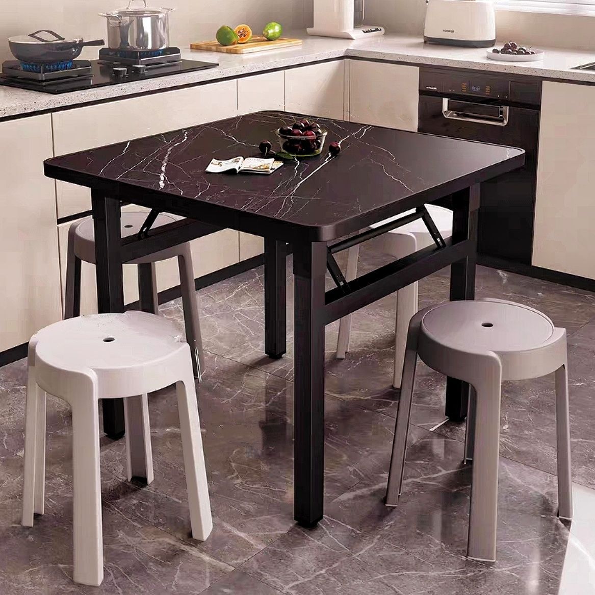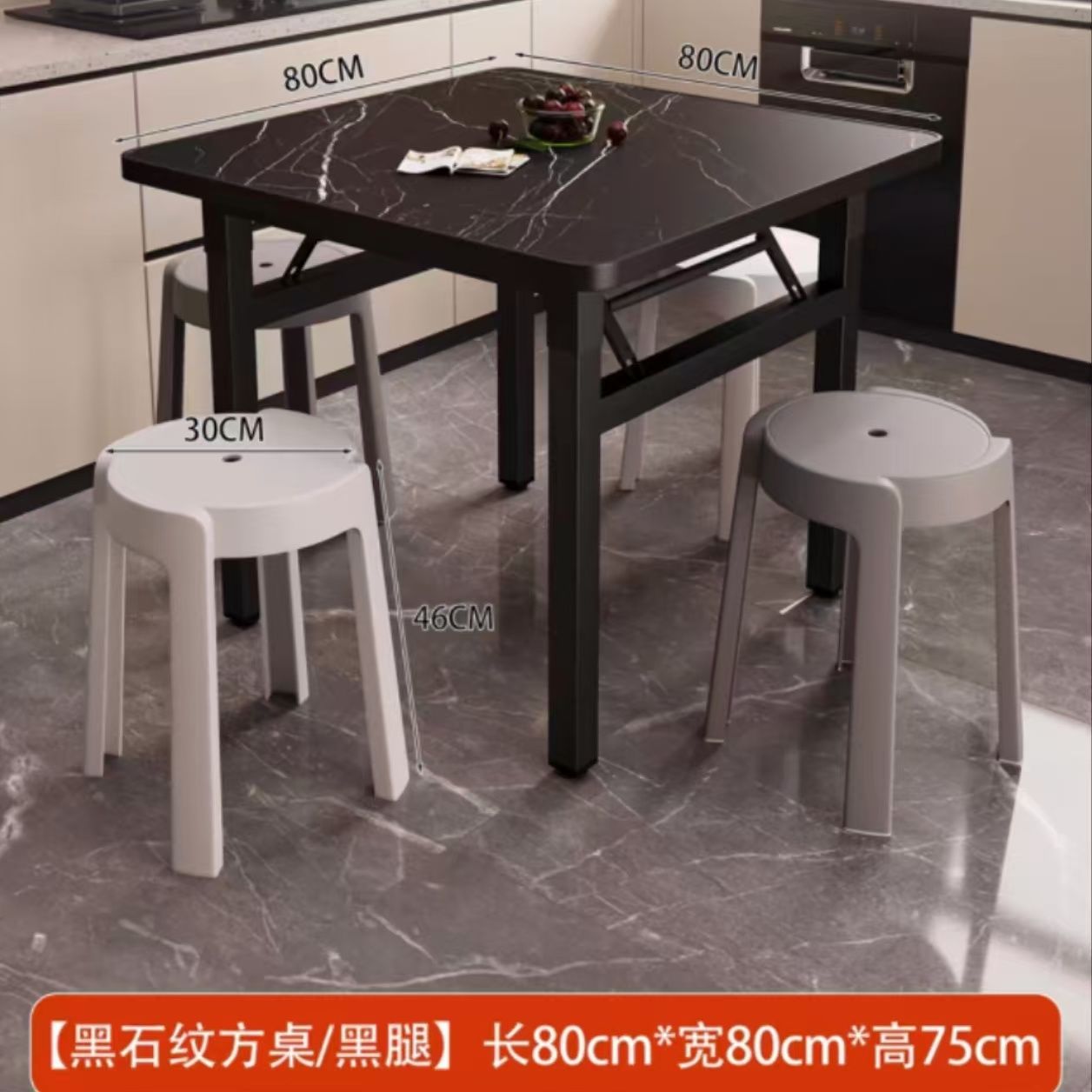 • 테이블 1개와 스툴 4개 조합/검은색 대리석 색상 80*80*75 검정색 프레임