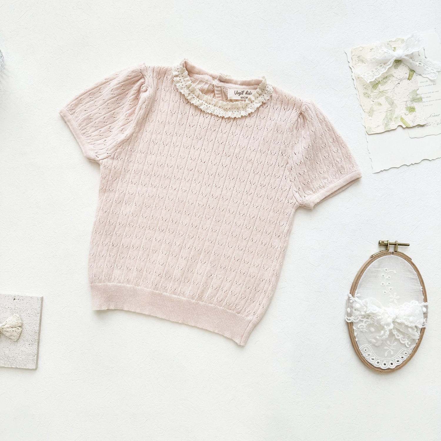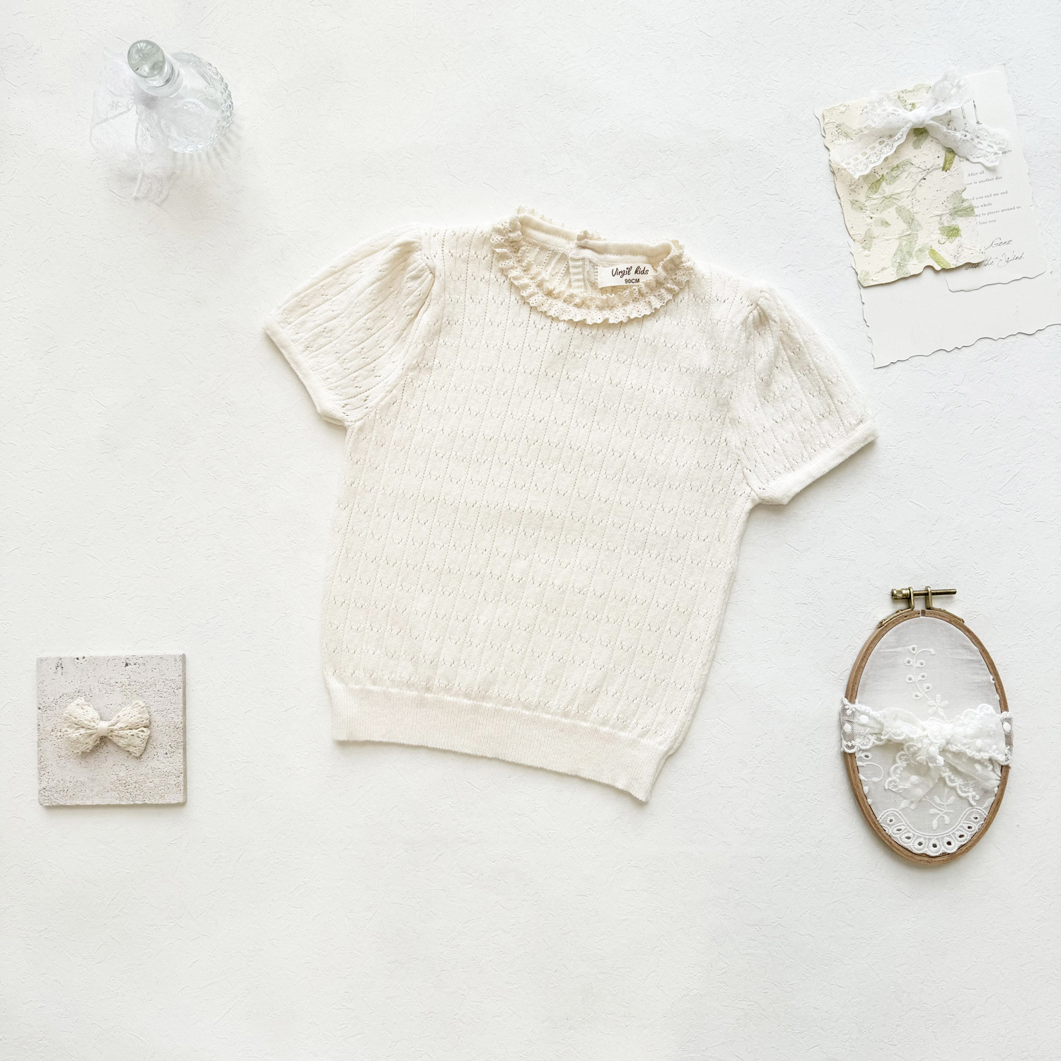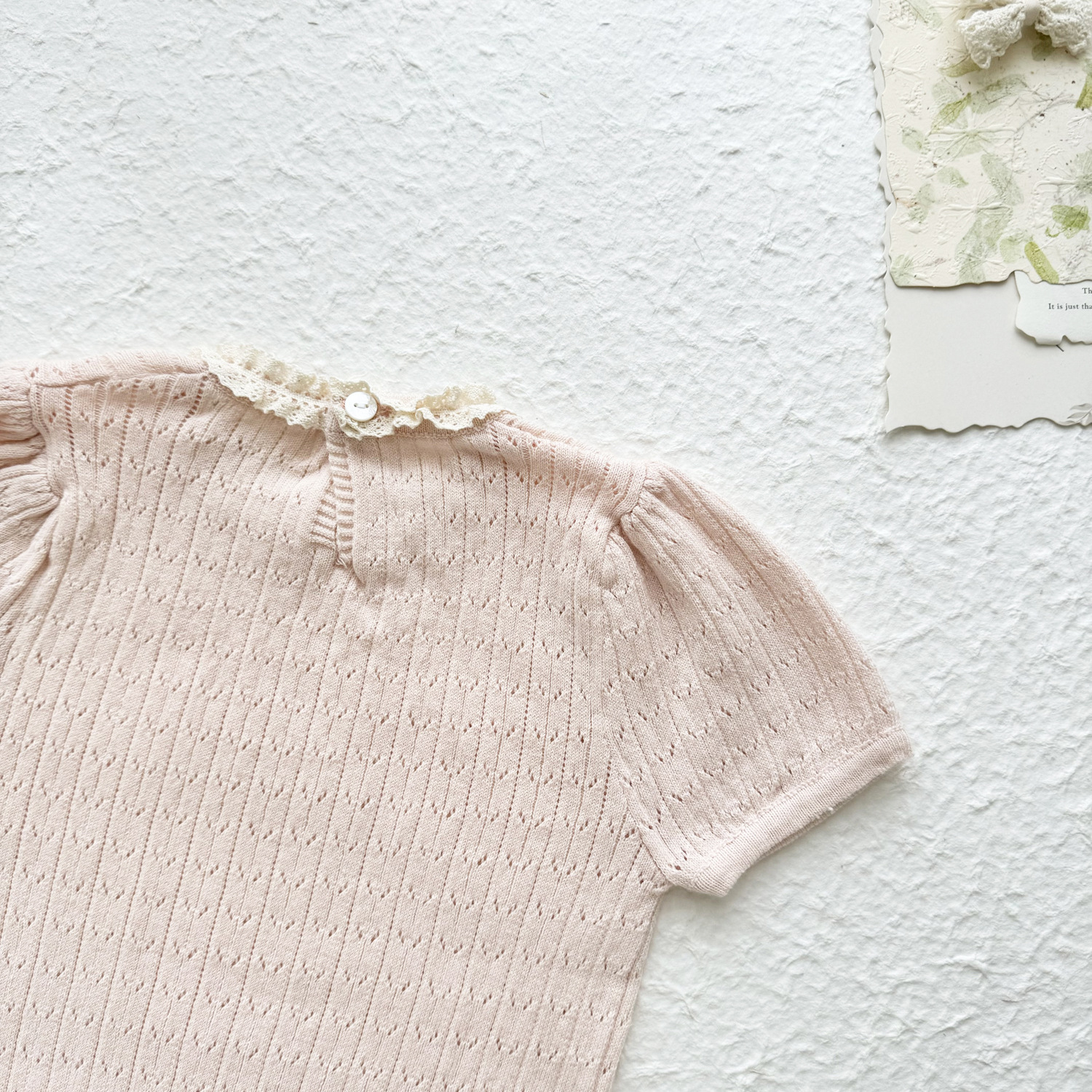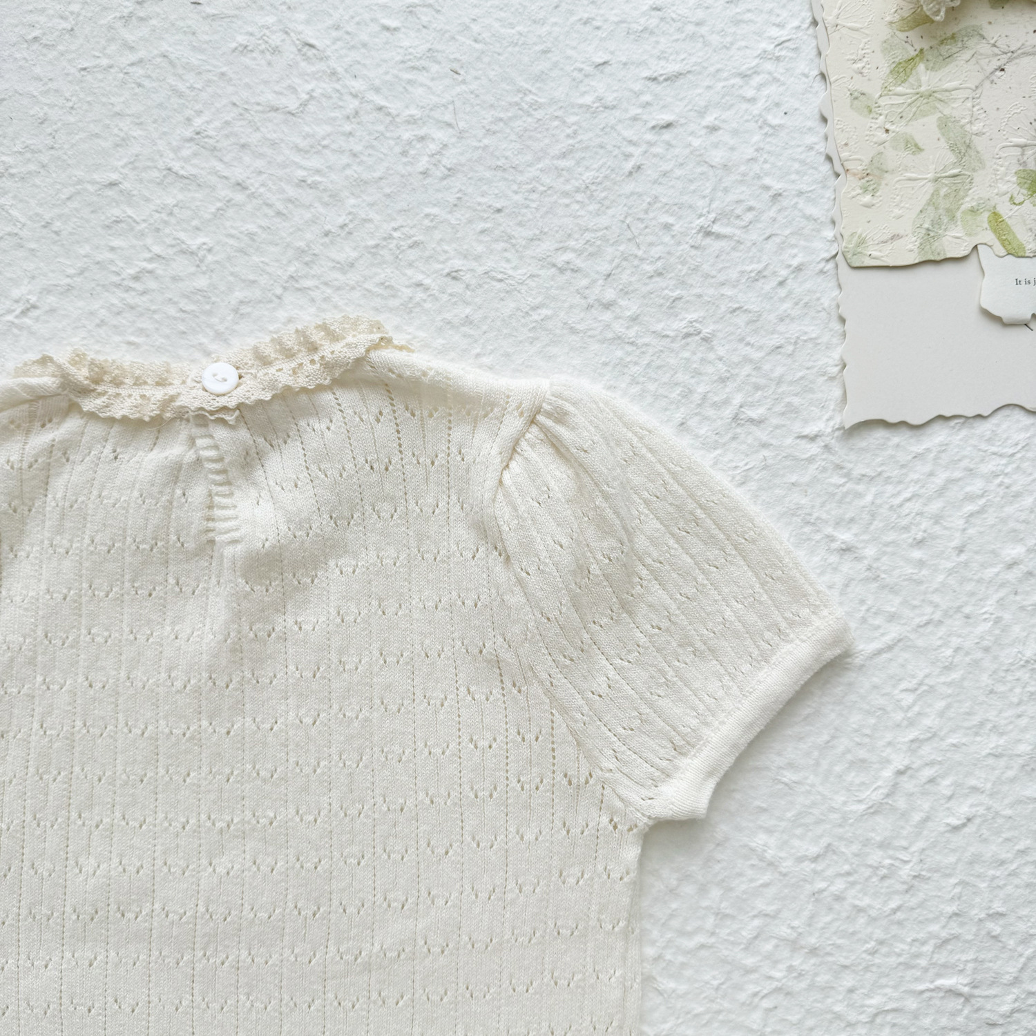 2025 여름 국경 여성 아기 반팔 니트 셔츠 한국식 퍼프 슬리브 할로우 아웃 니트 티셔츠 레이스 칼라 반팔스토어 가기