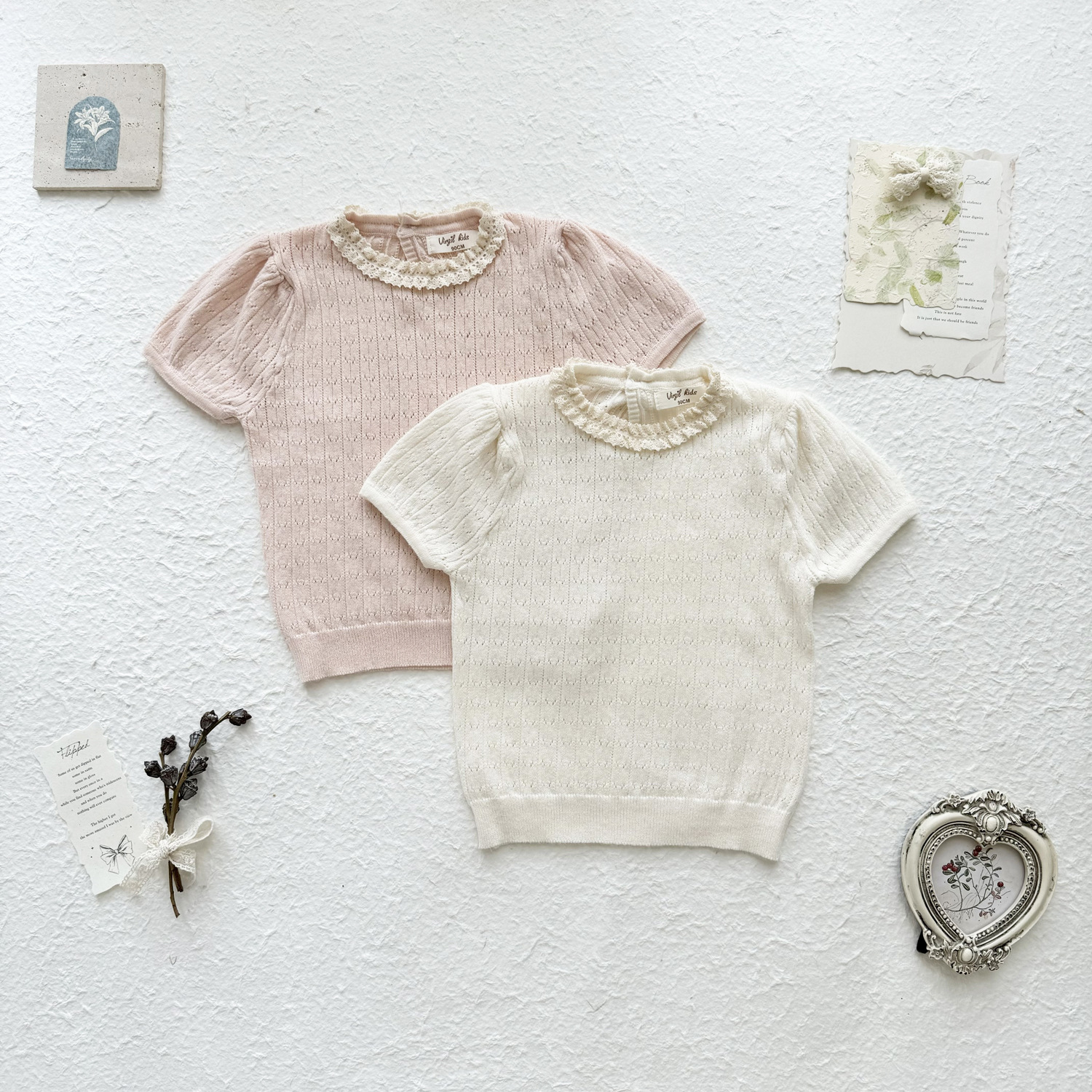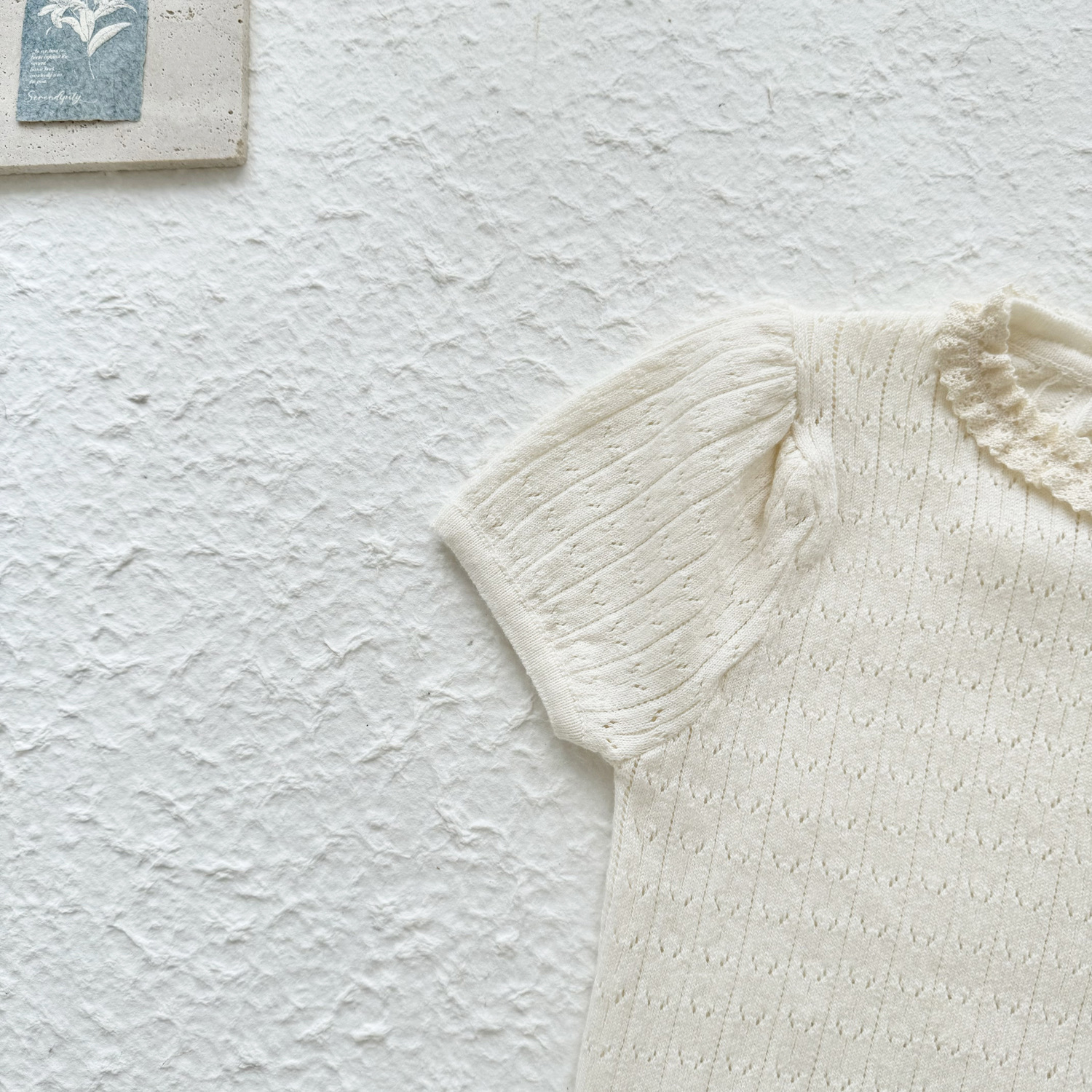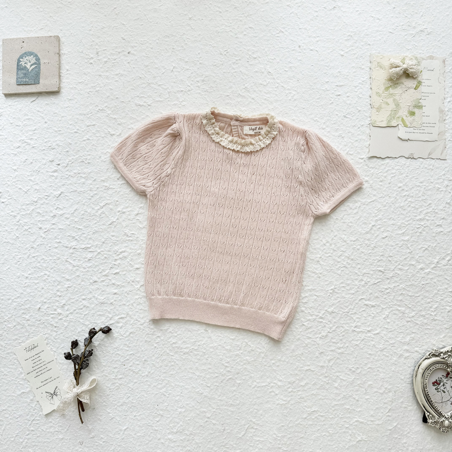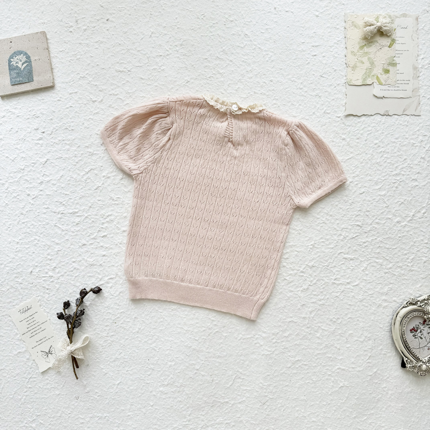2025 여름 국경 여성 아기 반팔 니트 셔츠 한국식 퍼프 슬리브 할로우 아웃 니트 티셔츠 레이스 칼라 반팔스토어 가기