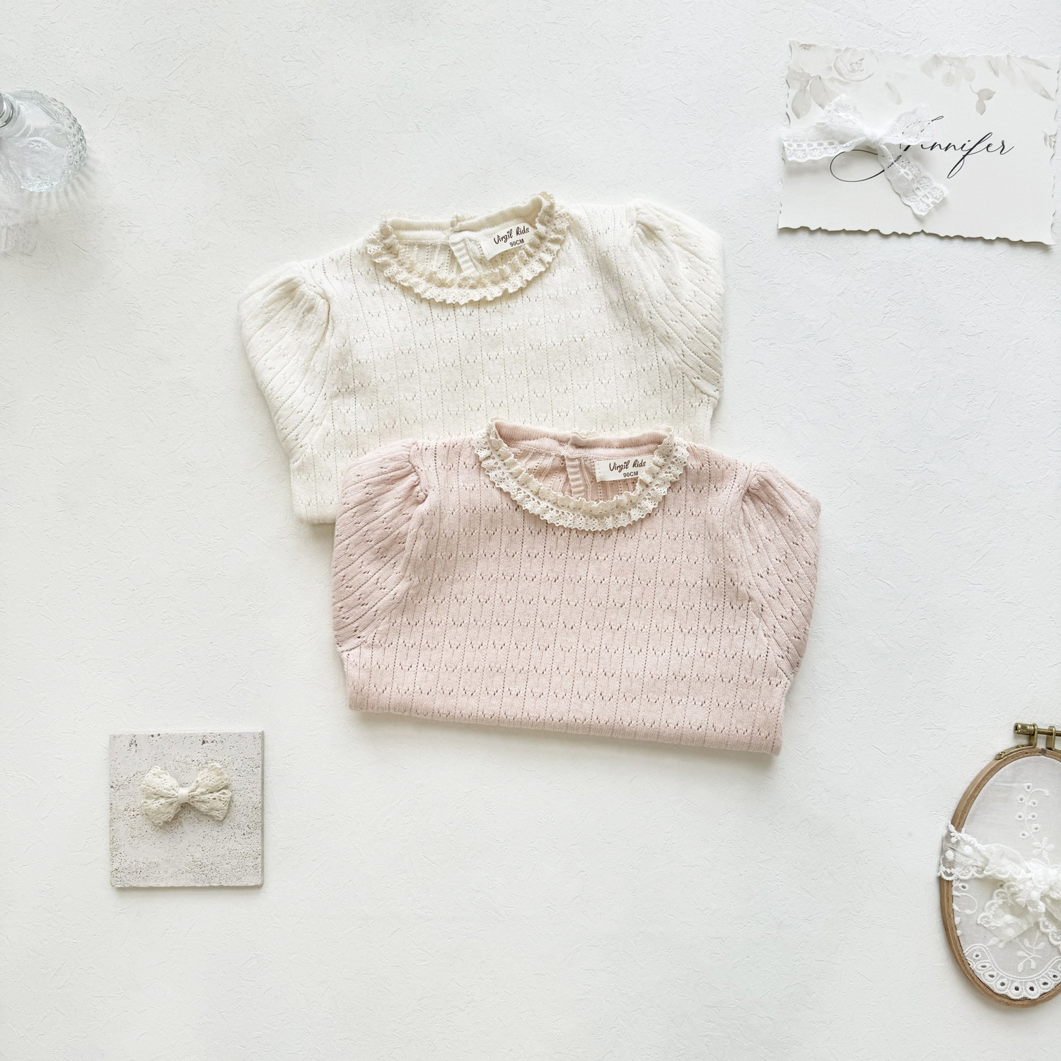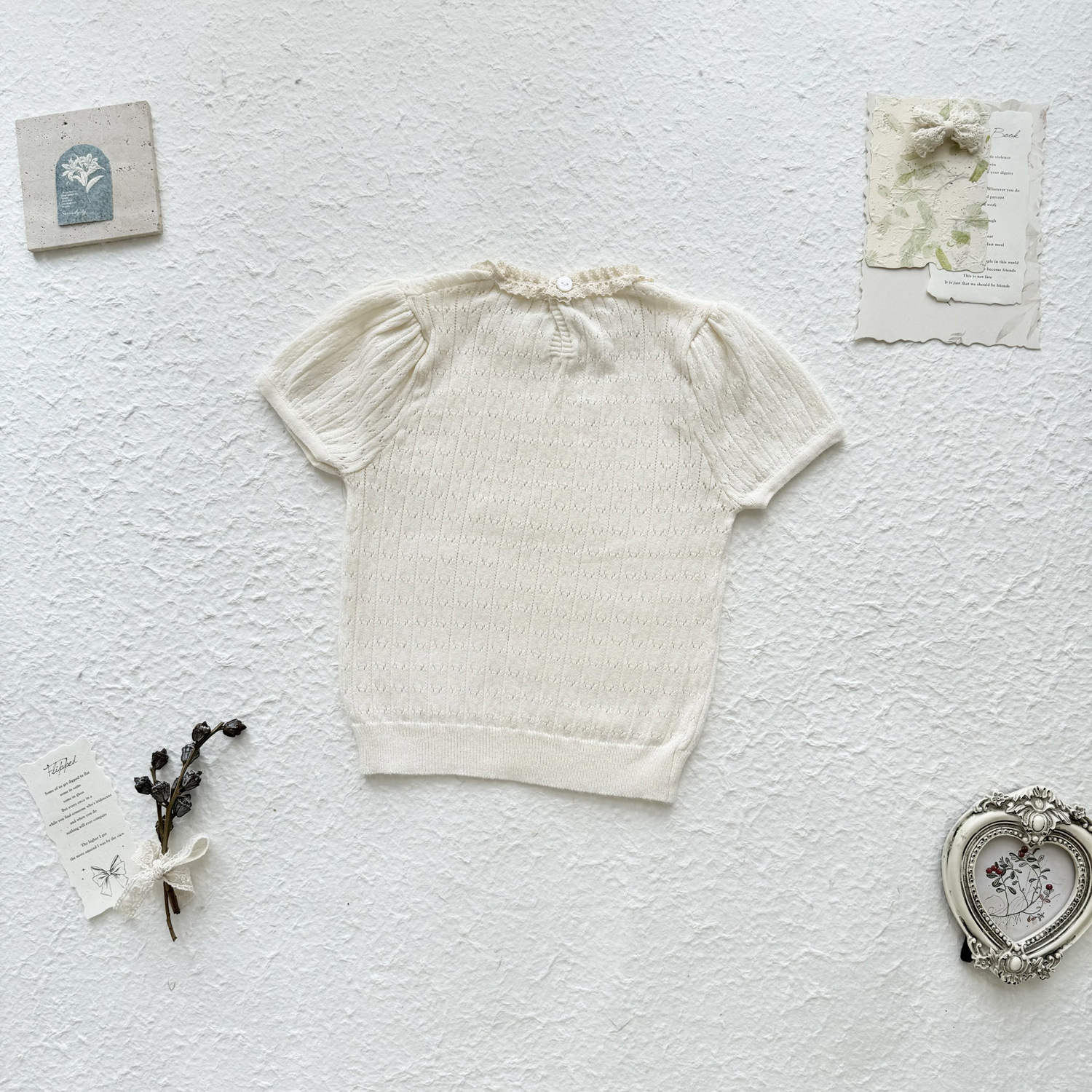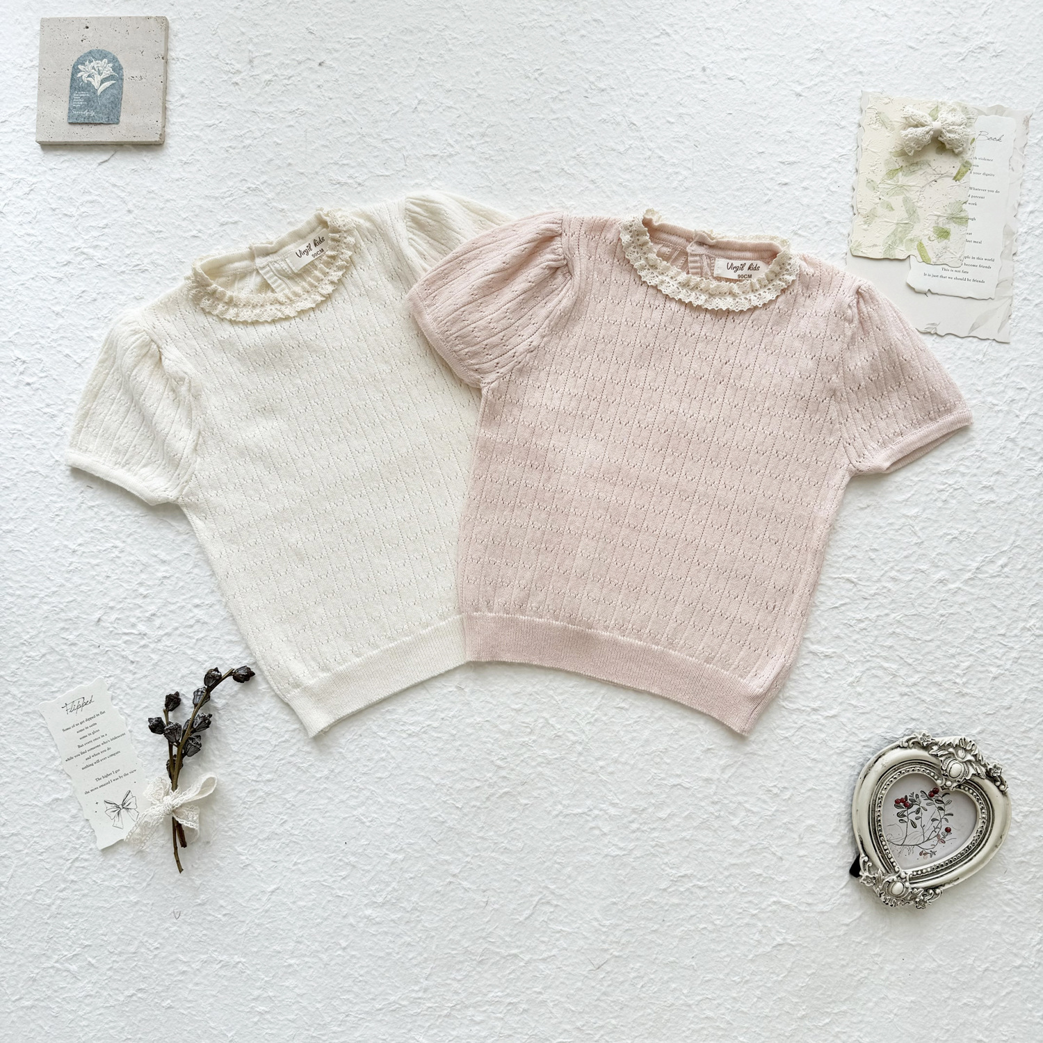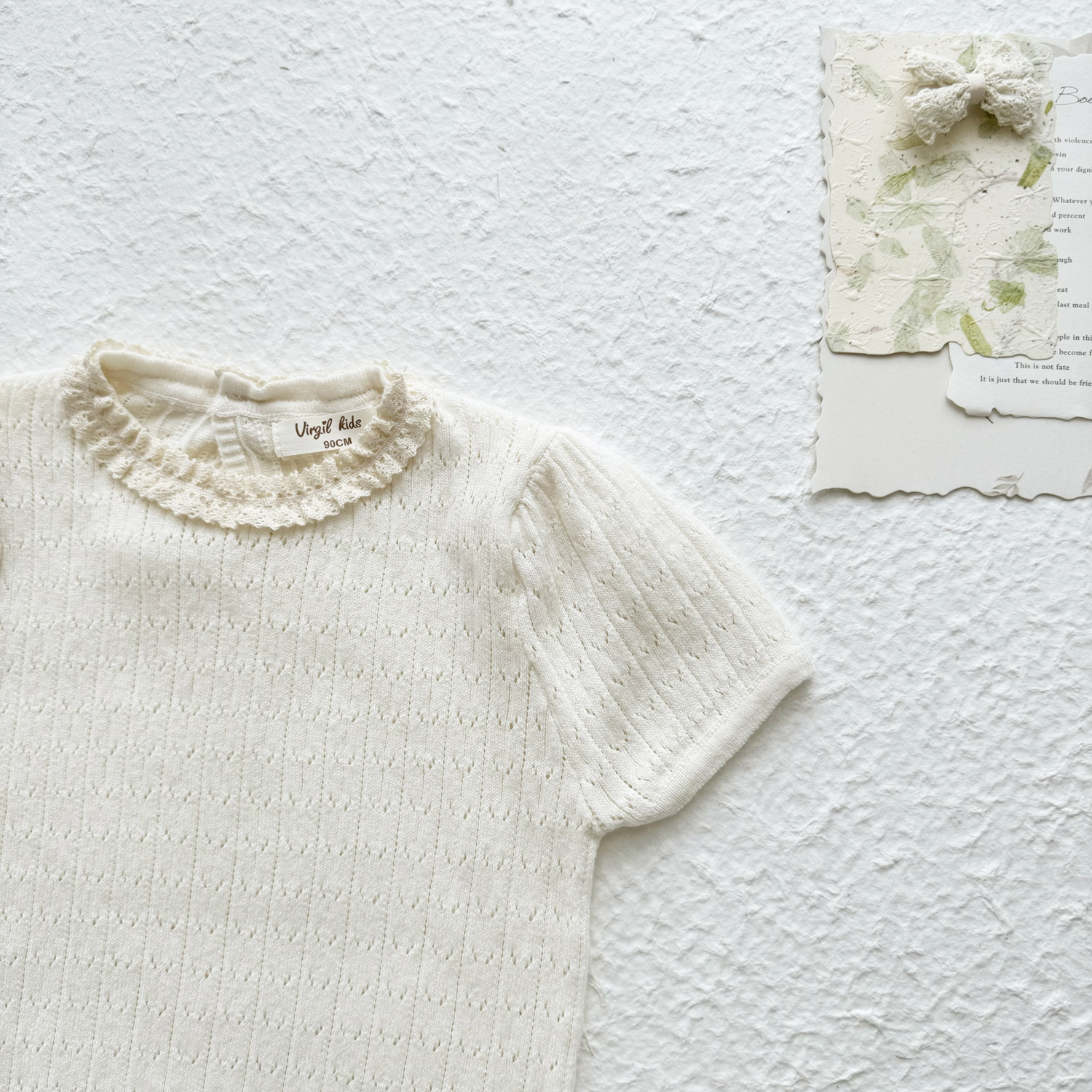 2025 여름 국경 여성 아기 반팔 니트 셔츠 한국식 퍼프 슬리브 할로우 아웃 니트 티셔츠 레이스 칼라 반팔스토어 가기