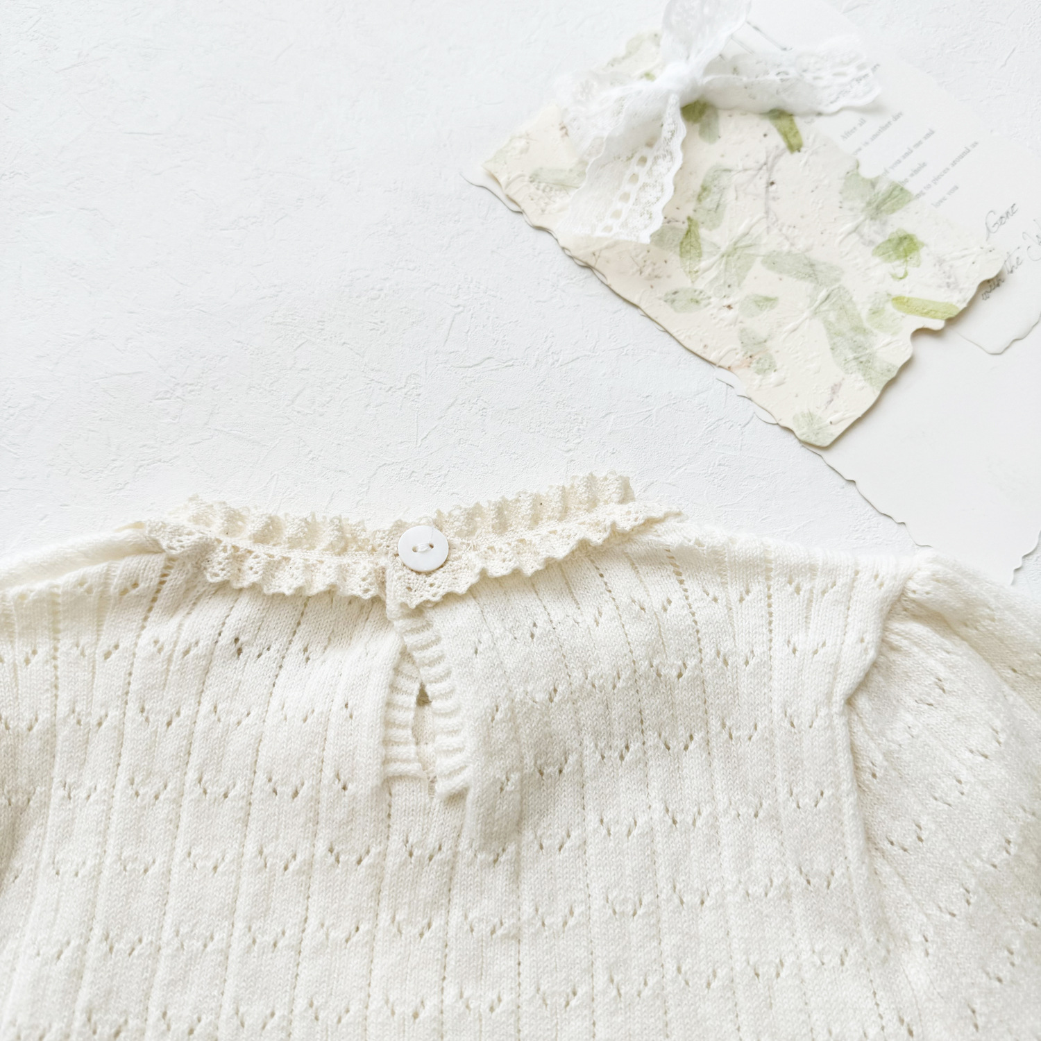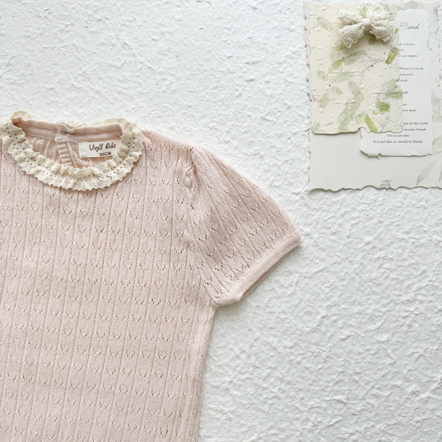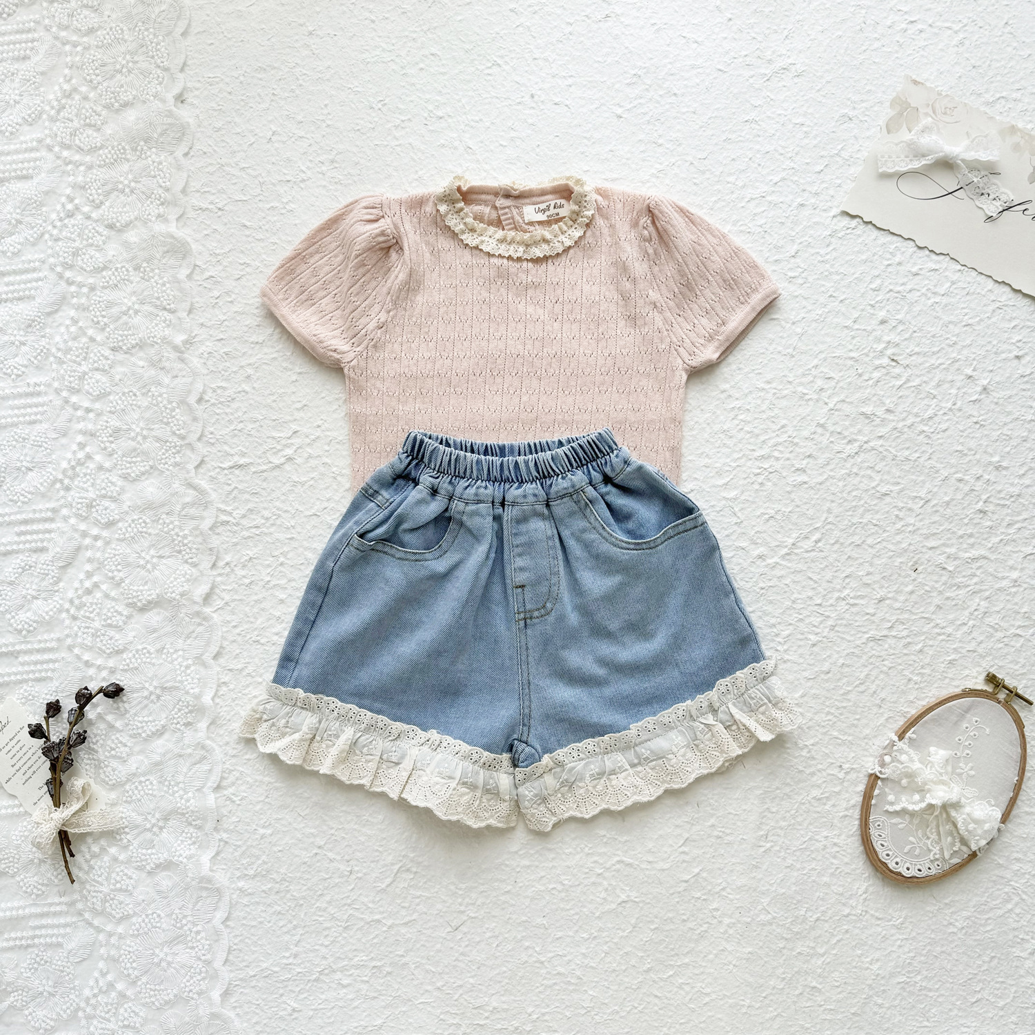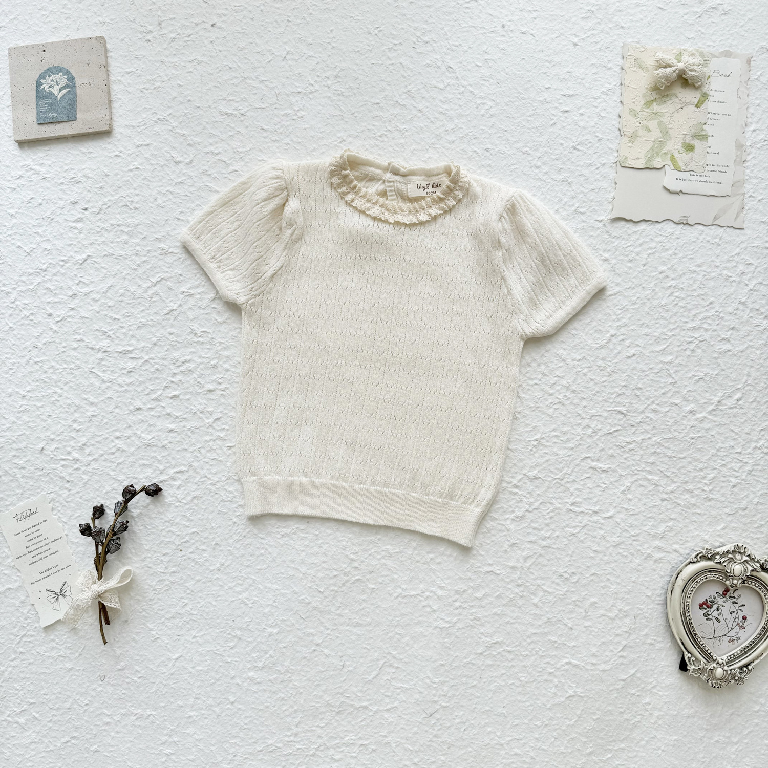 2025 여름 국경 여성 아기 반팔 니트 셔츠 한국식 퍼프 슬리브 할로우 아웃 니트 티셔츠 레이스 칼라 반팔스토어 가기
