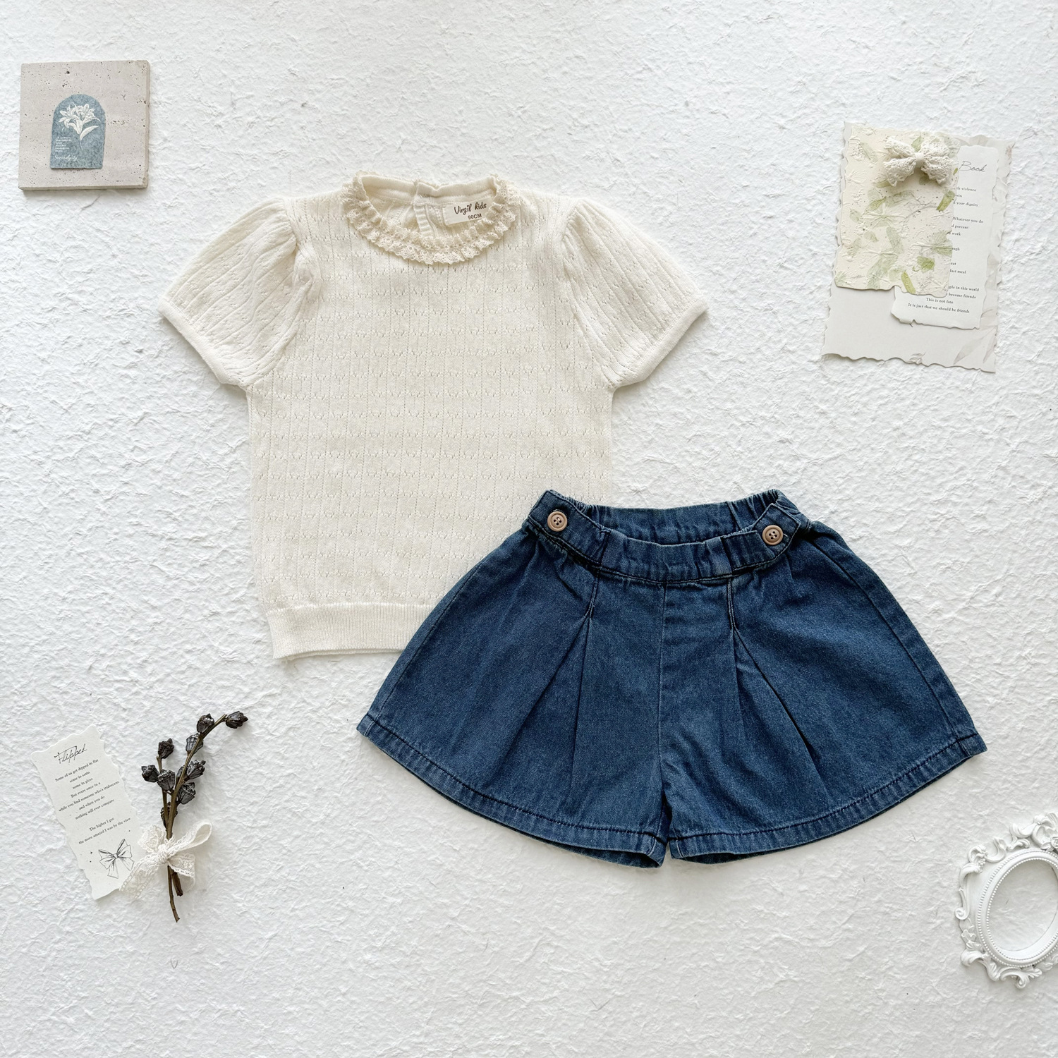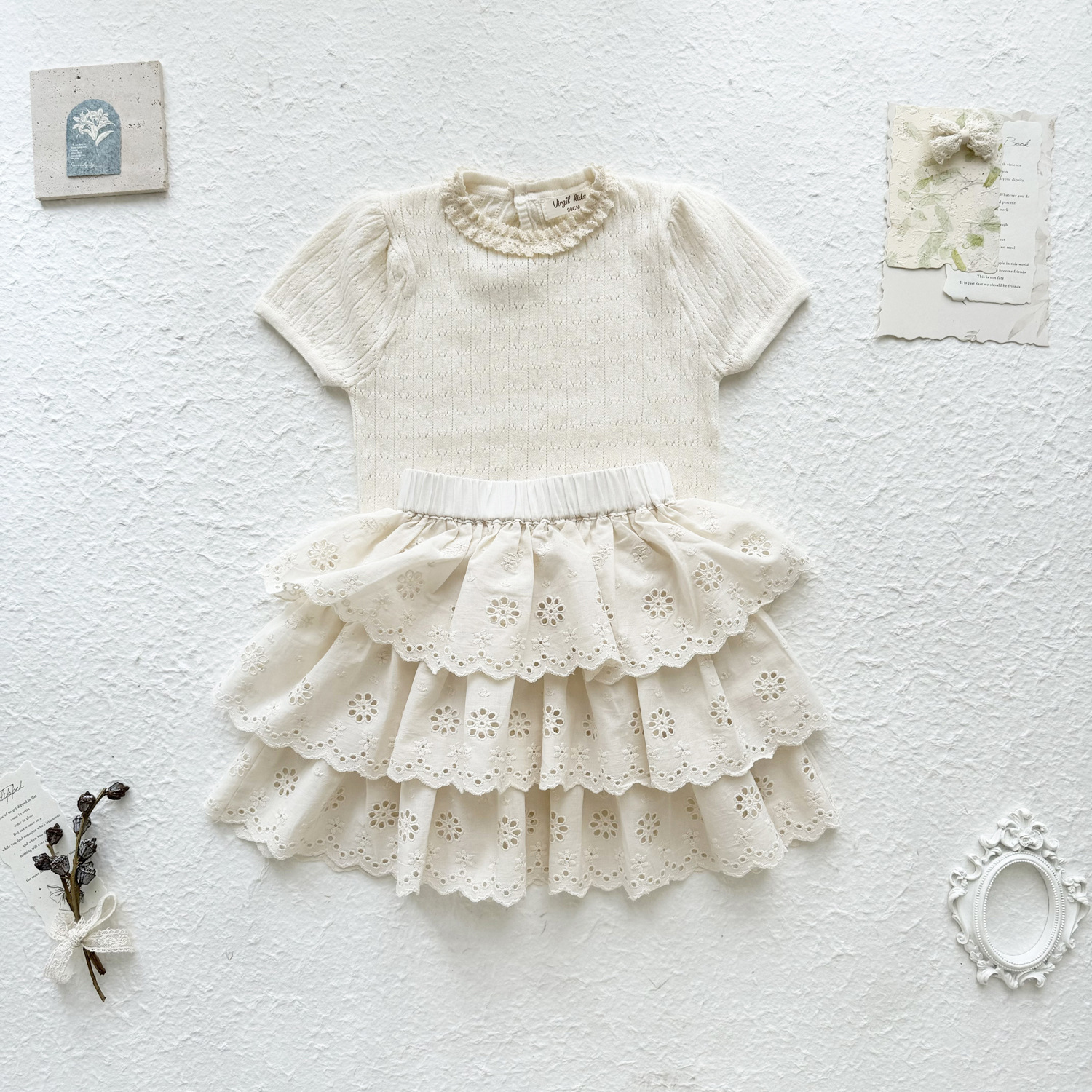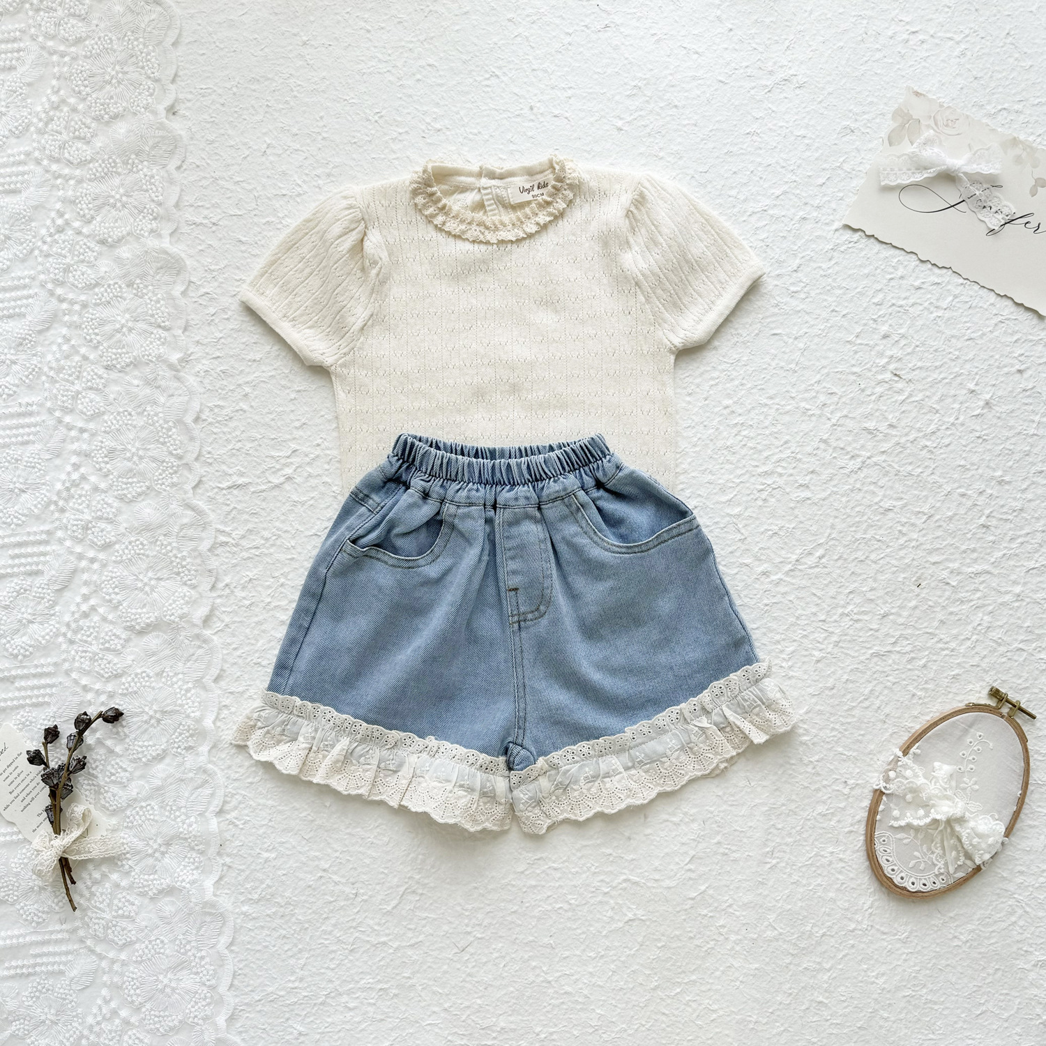 2025 여름 국경 여성 아기 반팔 니트 셔츠 한국식 퍼프 슬리브 할로우 아웃 니트 티셔츠 레이스 칼라 반팔