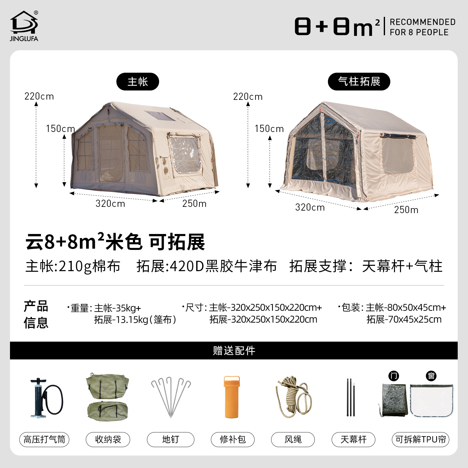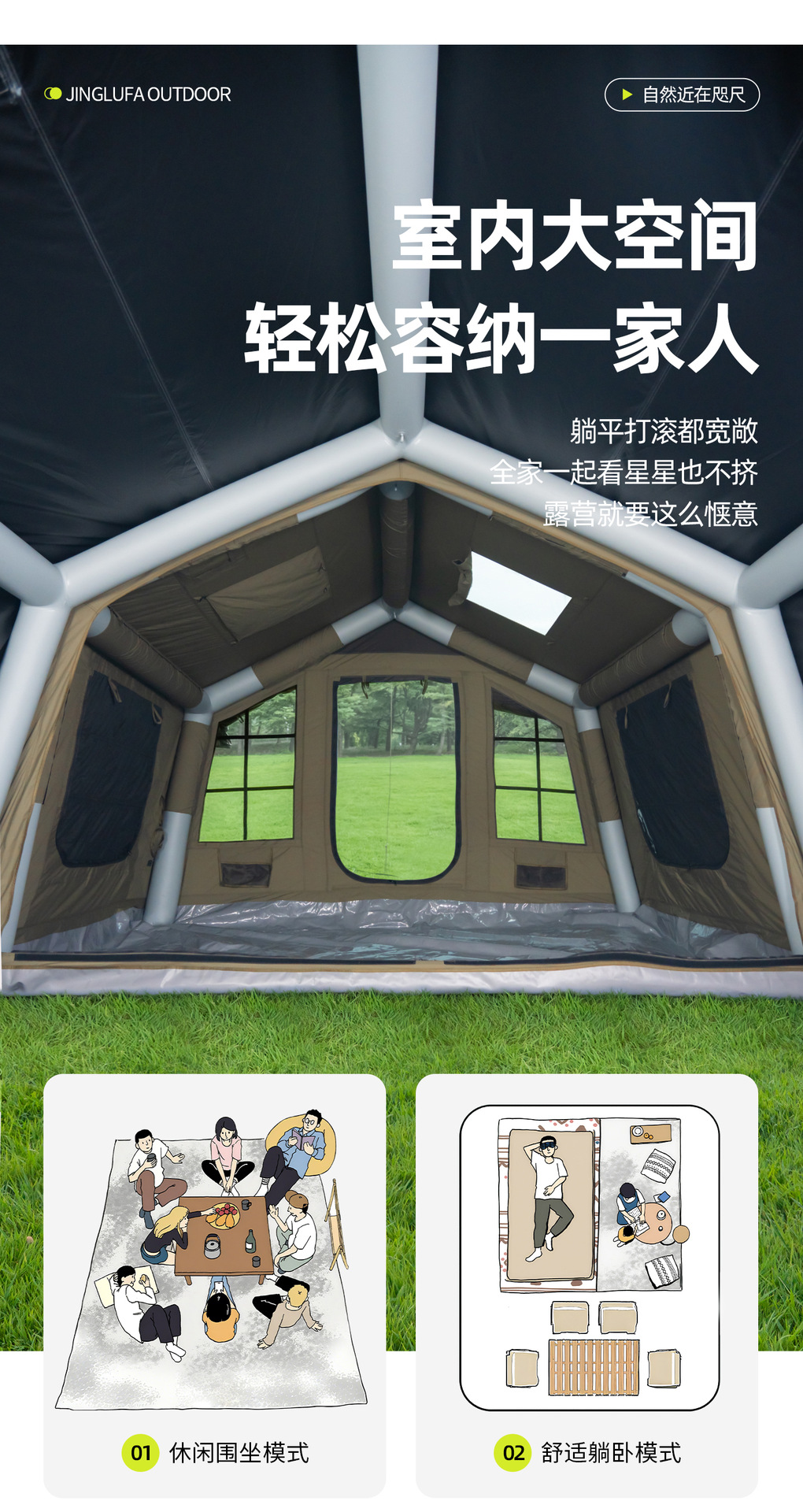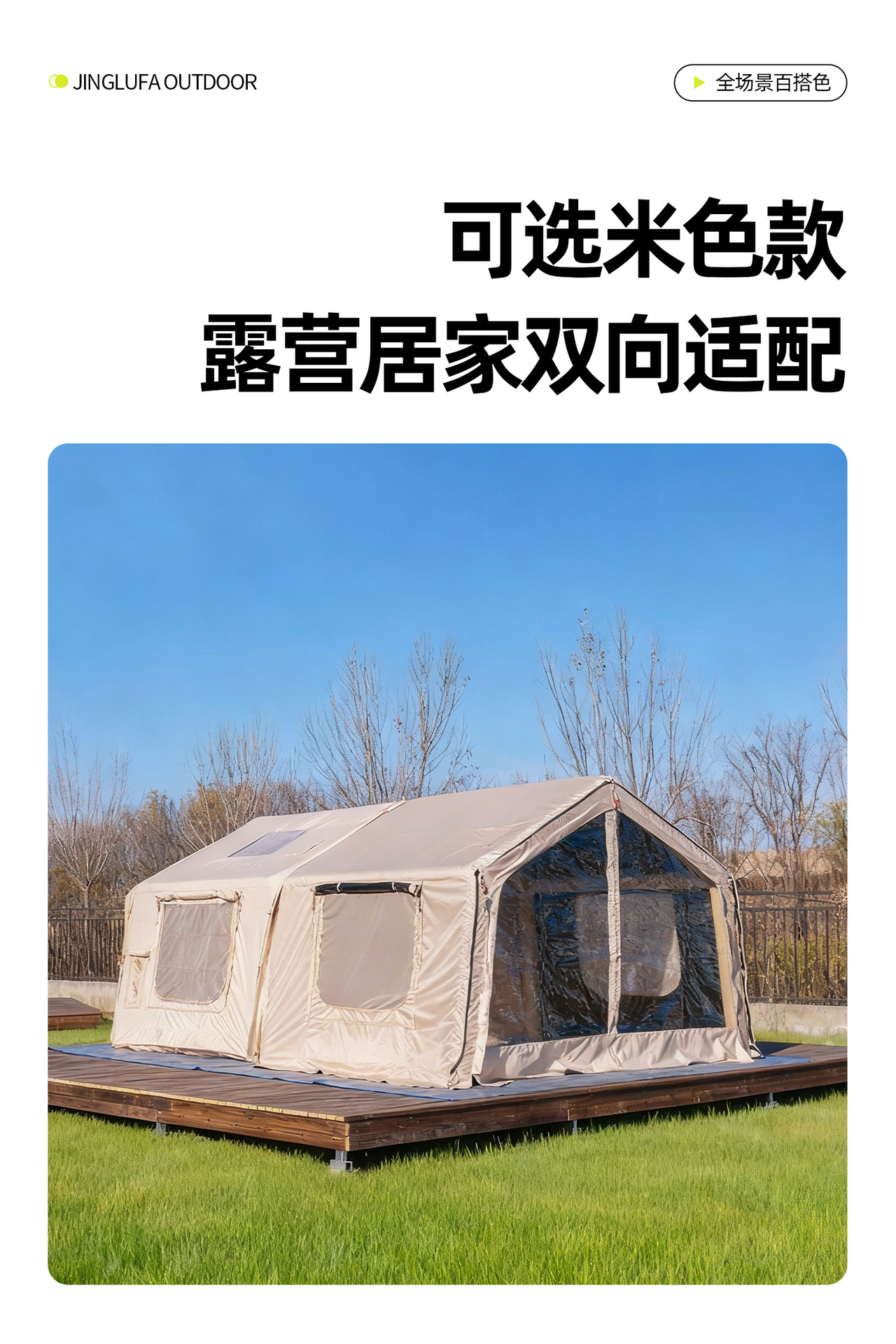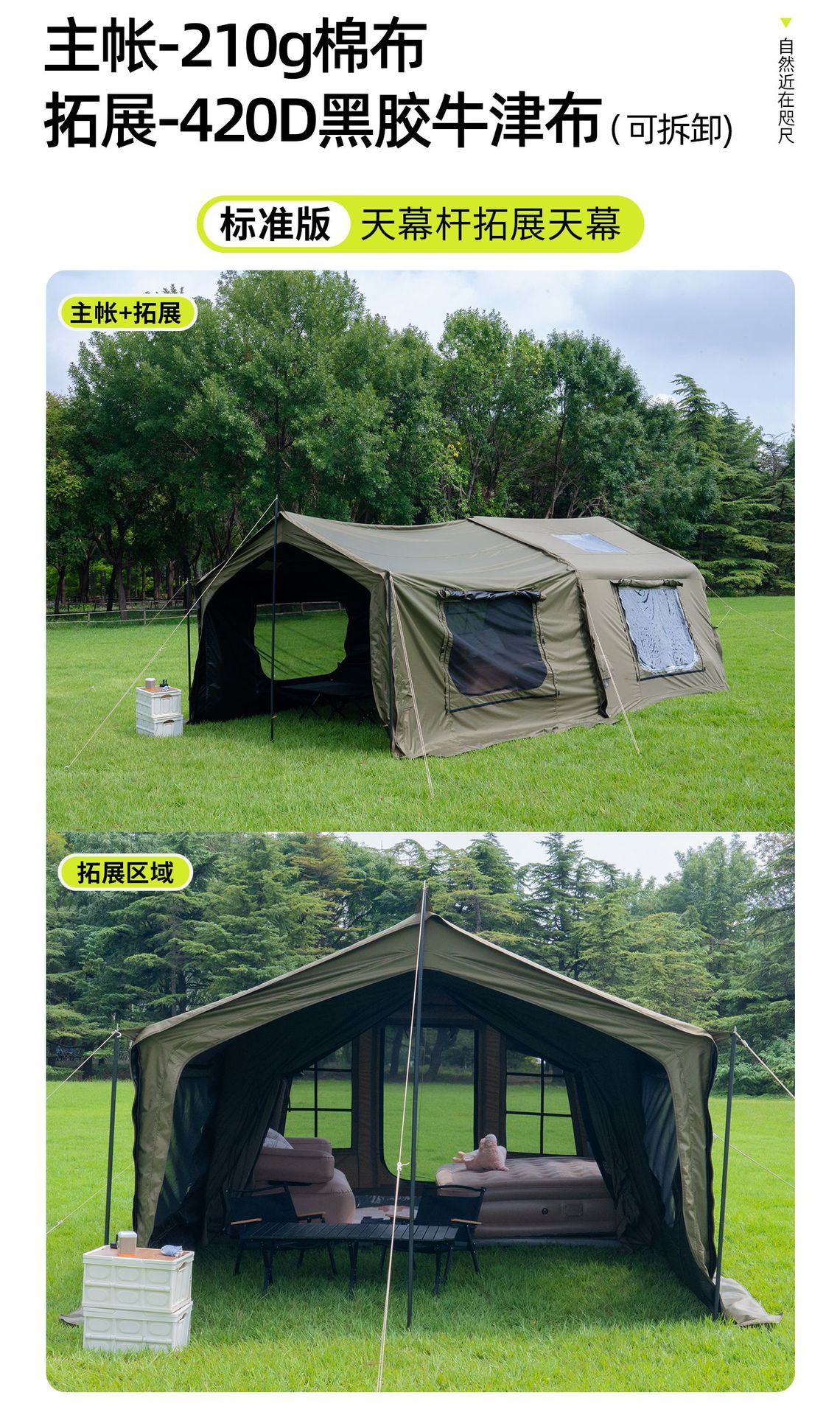 징루파 8+8 면 소재 자동 팽창 텐트, 루프탑 캠프, 원룸+거실, 야외 숙박용