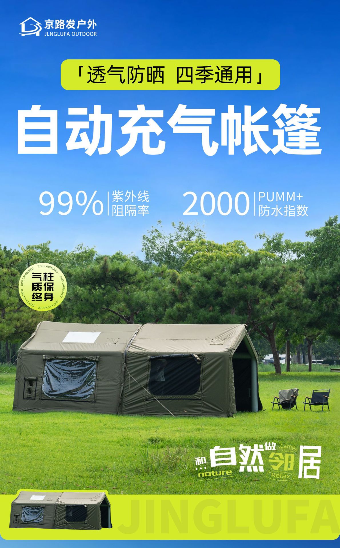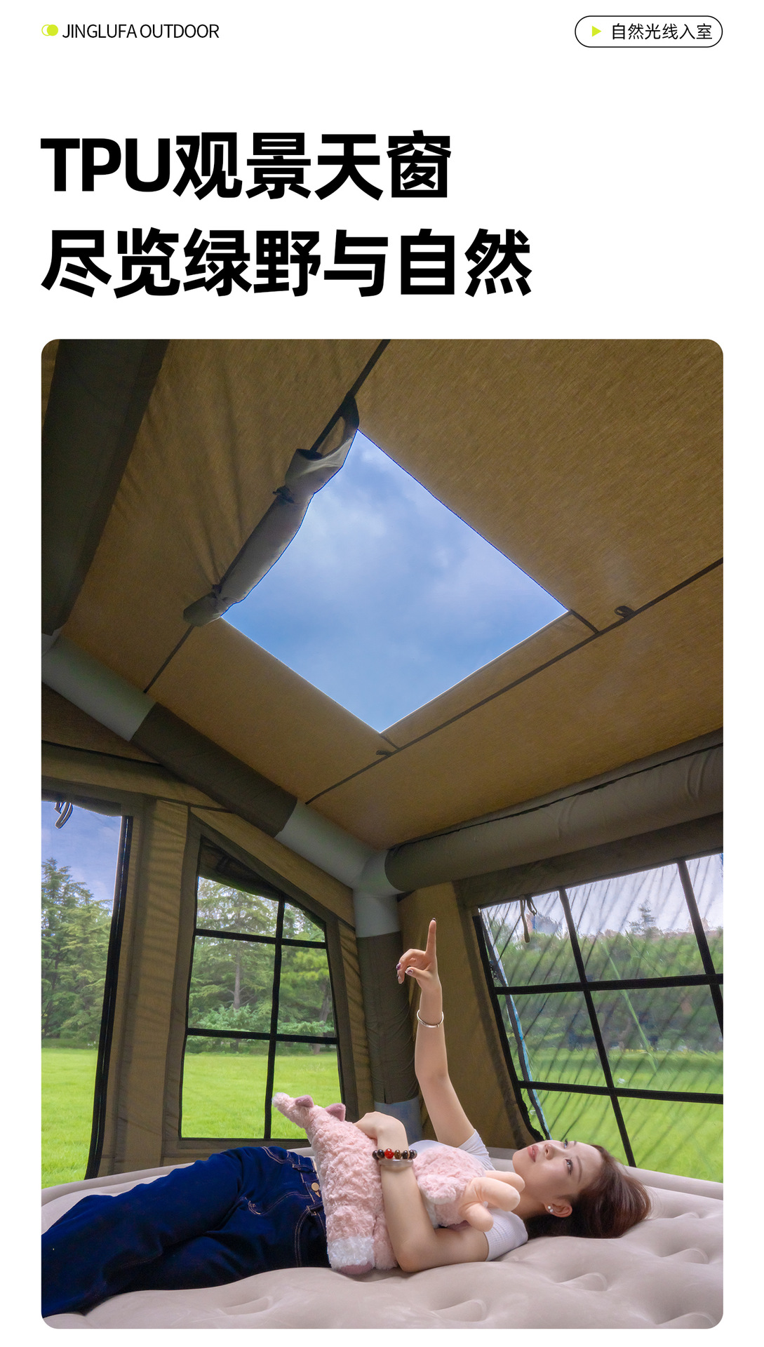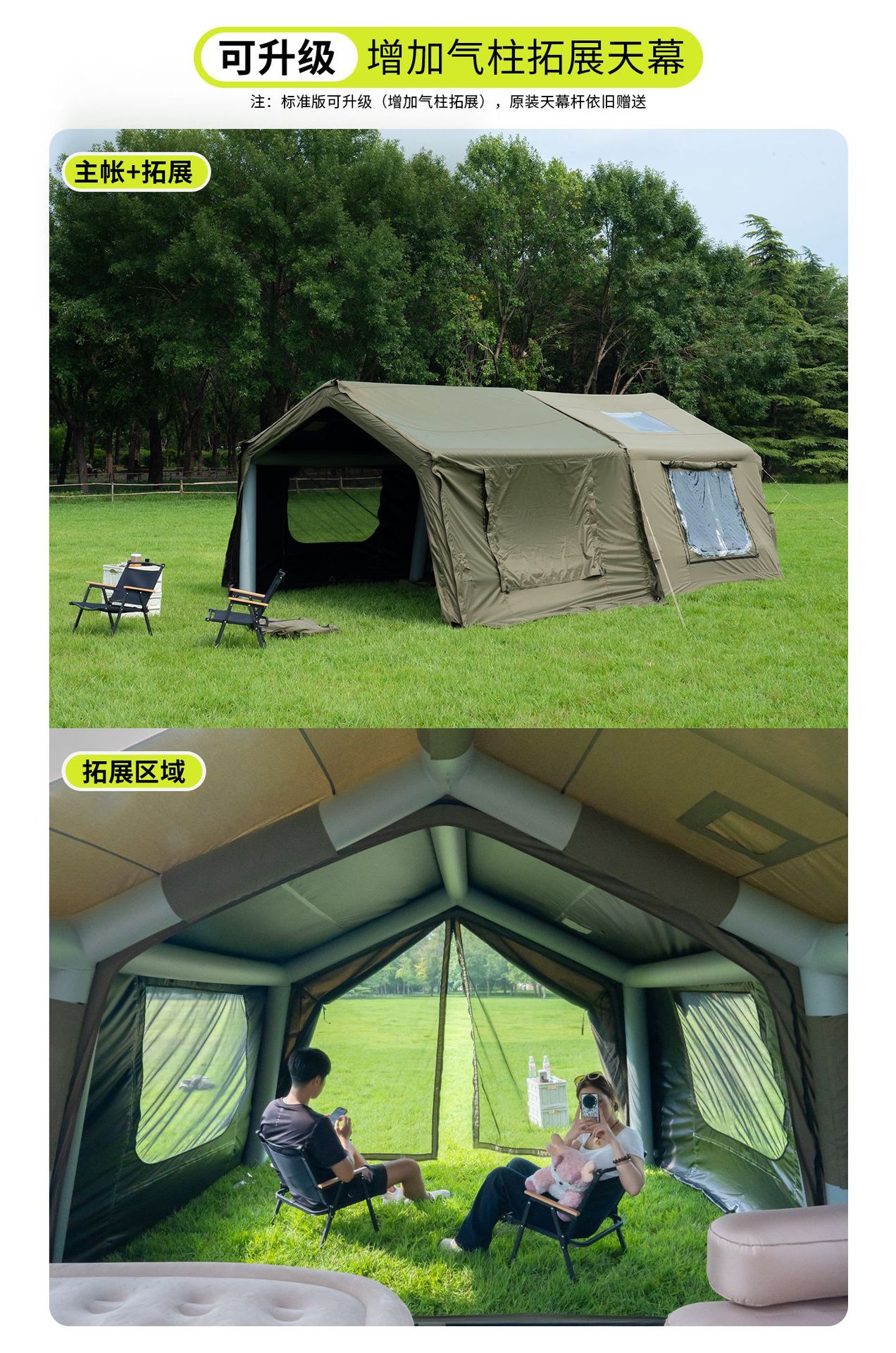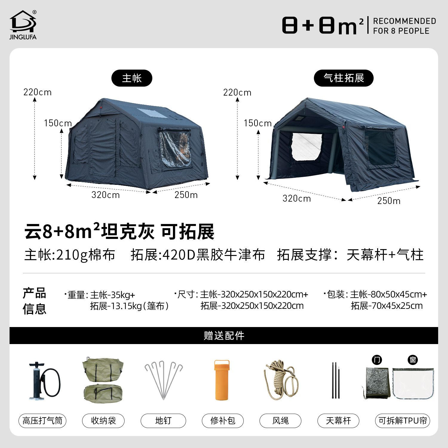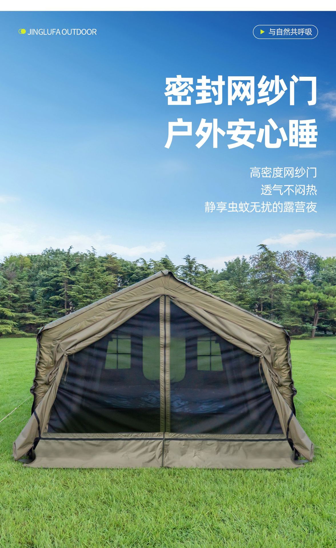 징루파 8+8 면 소재 자동 팽창 텐트, 루프탑 캠프, 원룸+거실, 야외 숙박용