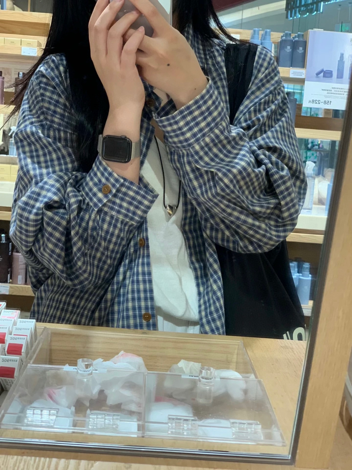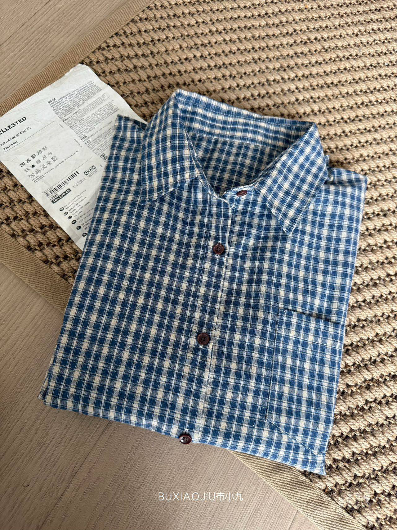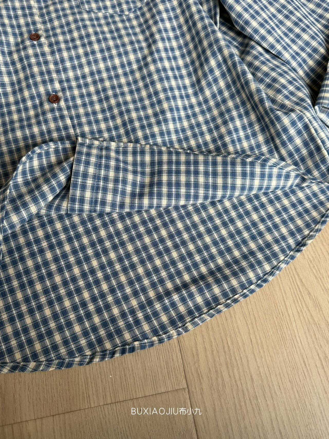 • Bu Xiaojiu/파란색과 흰색 작은 격자 무늬 셔츠
