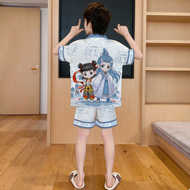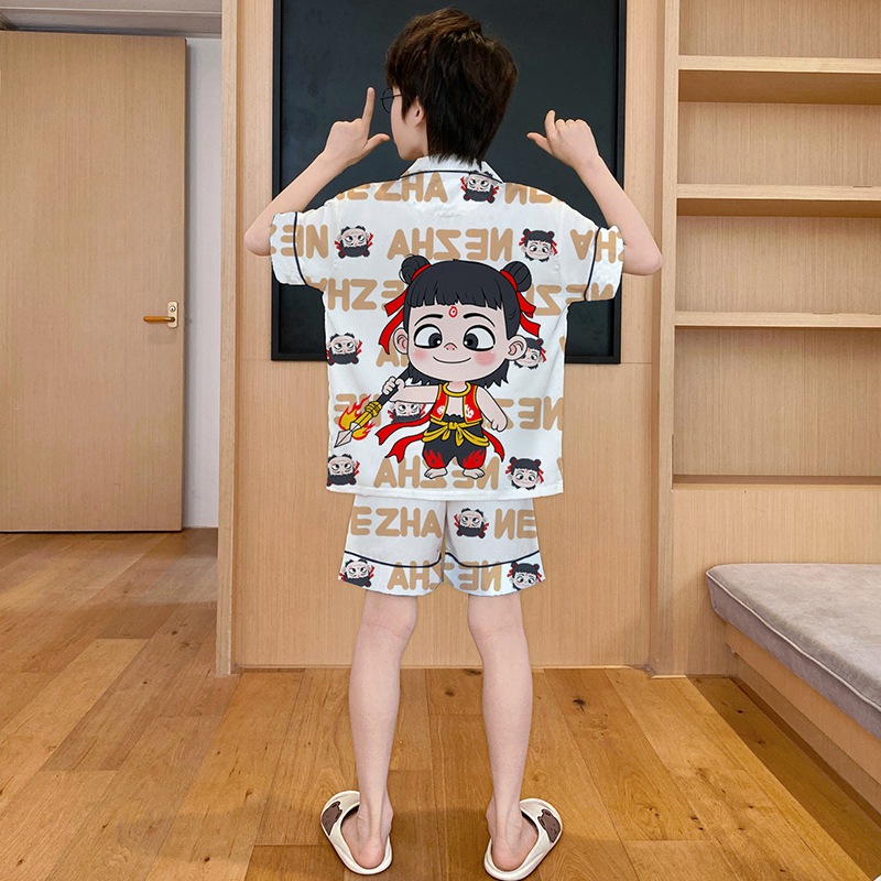 어린이 얼음 실크 잠옷 소년 여름 얇은 반팔 반바지 소년 여름 실크 중대형 어린이 가정 의류 세트