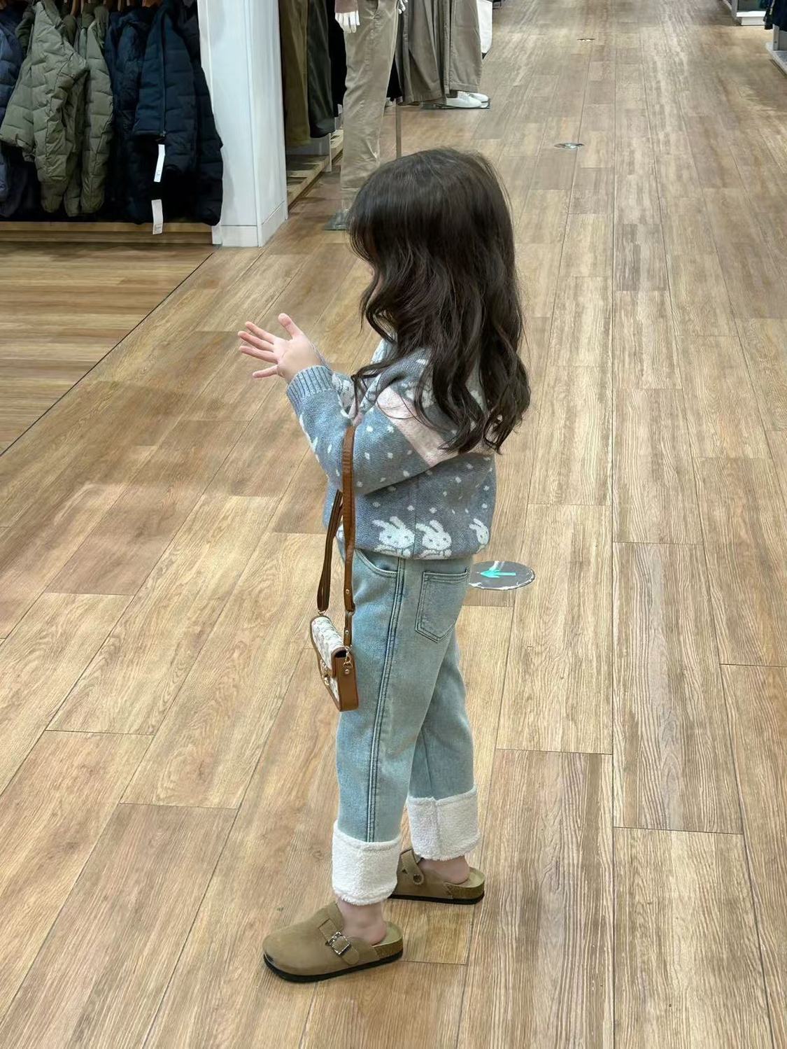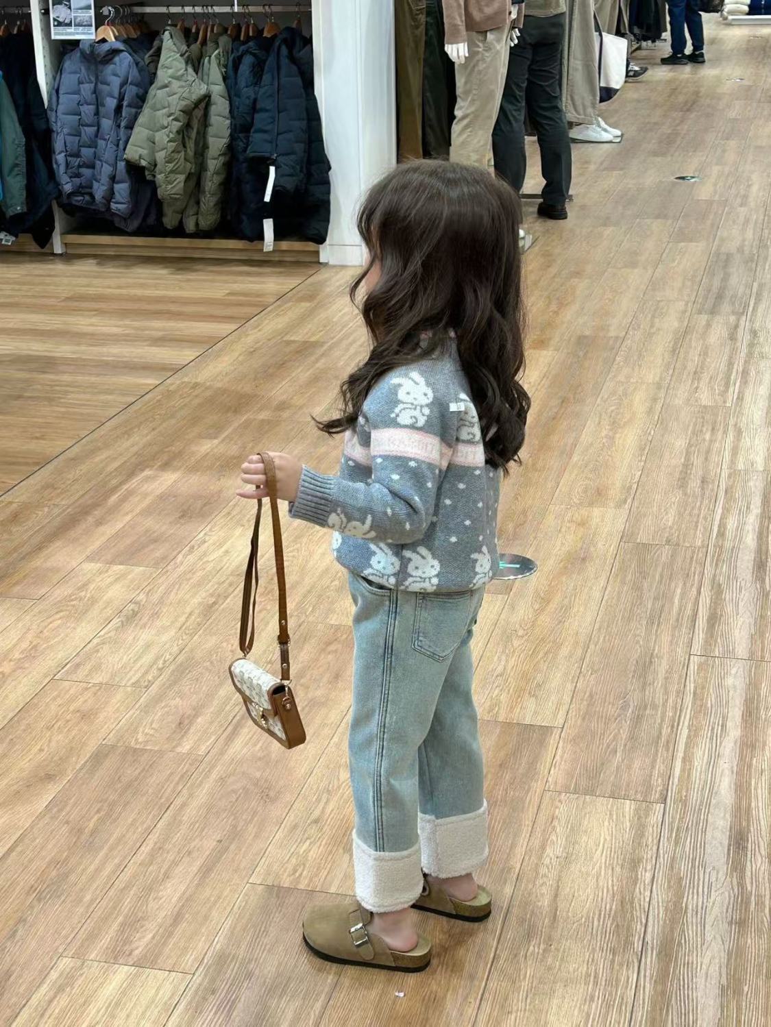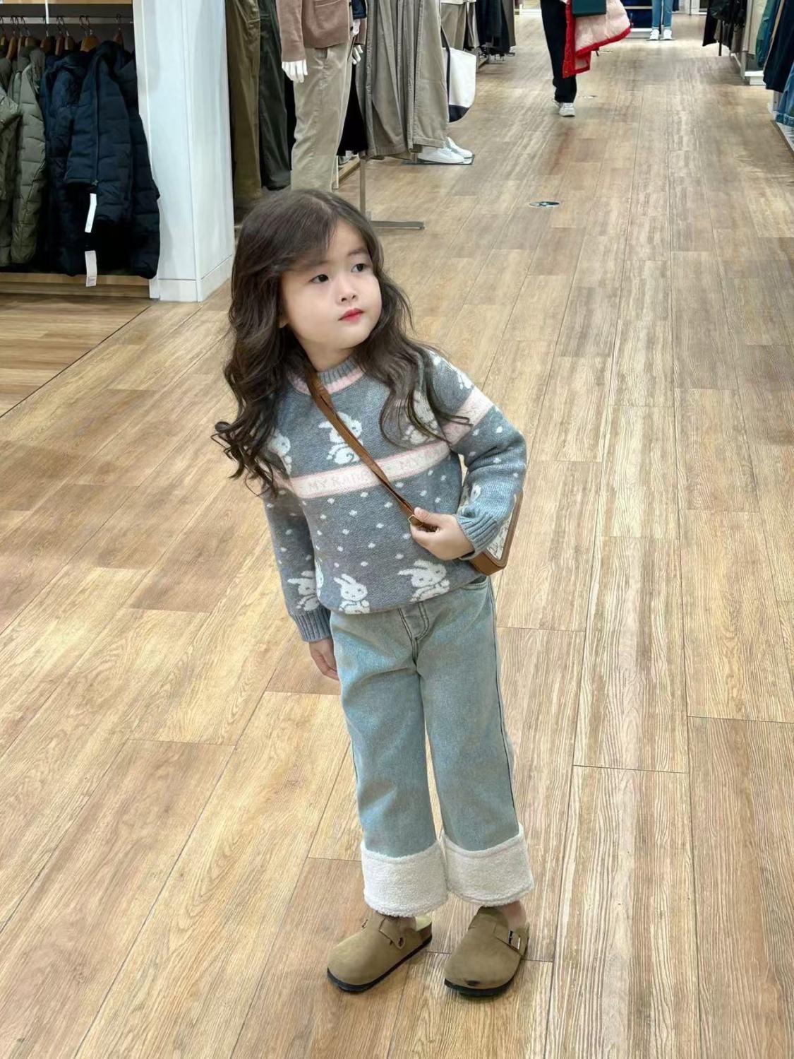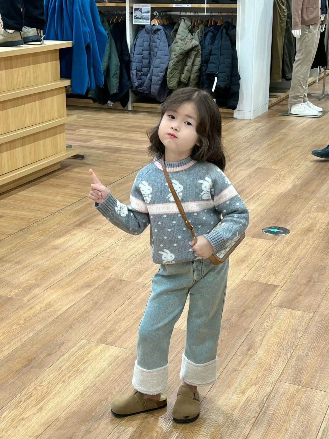 여아 바지 플러스 벨벳 청바지 2024 새로운 스타일 가을 겨울 스타일 스트레이트 커프 스플라이스 모피 발목 캐주얼 바지스토어 가기