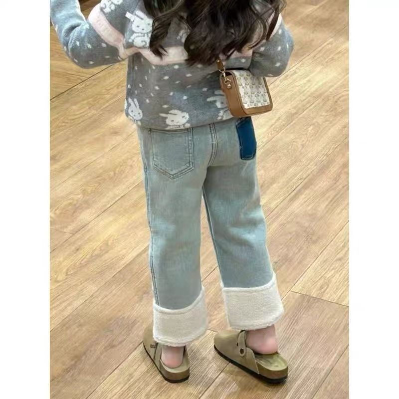 여아 바지 플러스 벨벳 청바지 2024 새로운 스타일 가을 겨울 스타일 스트레이트 커프 스플라이스 모피 발목 캐주얼 바지