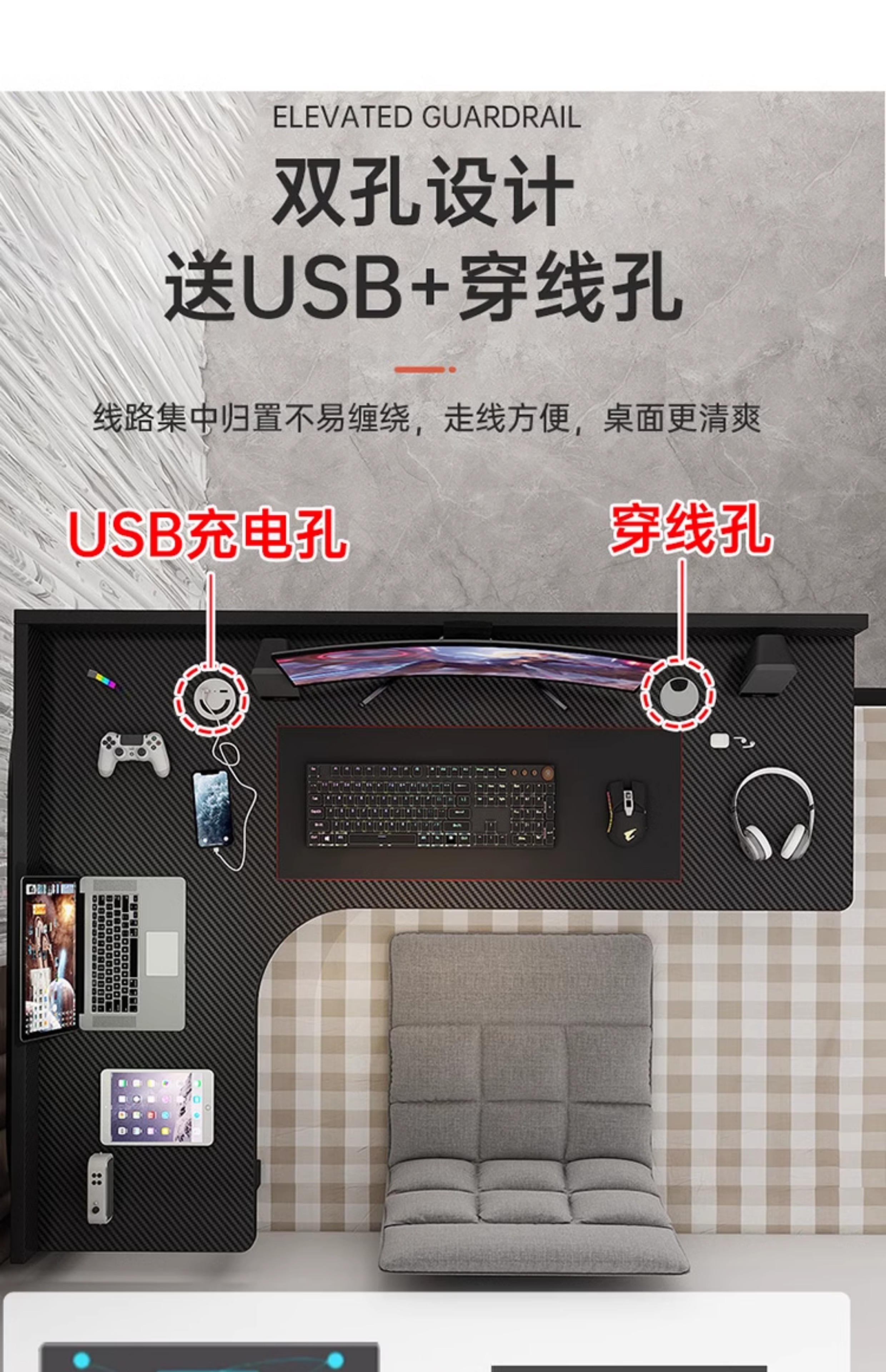 • ♚탄소섬유 데스크탑 + 화이트 선반(베이스 모델의 오른쪽 모서리)