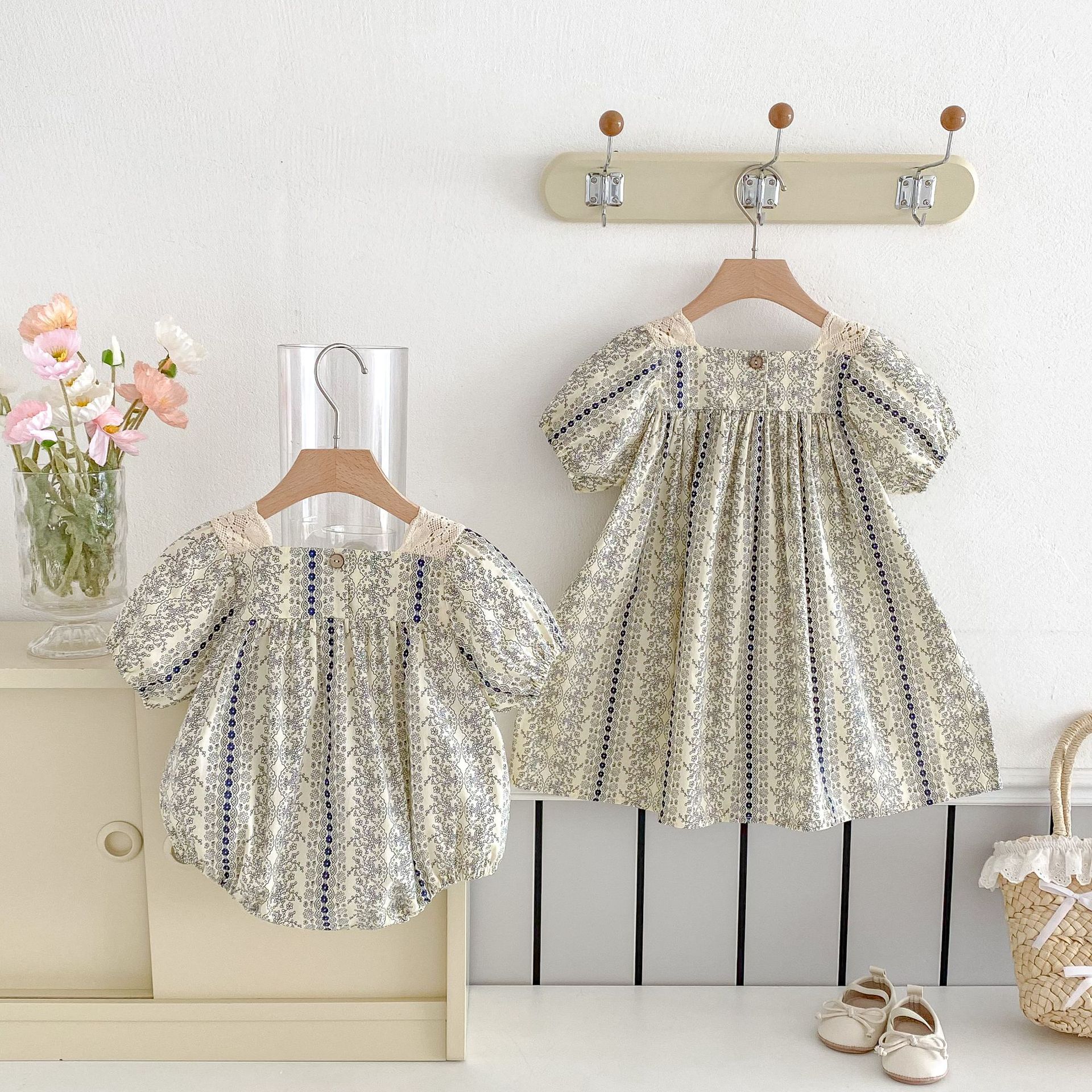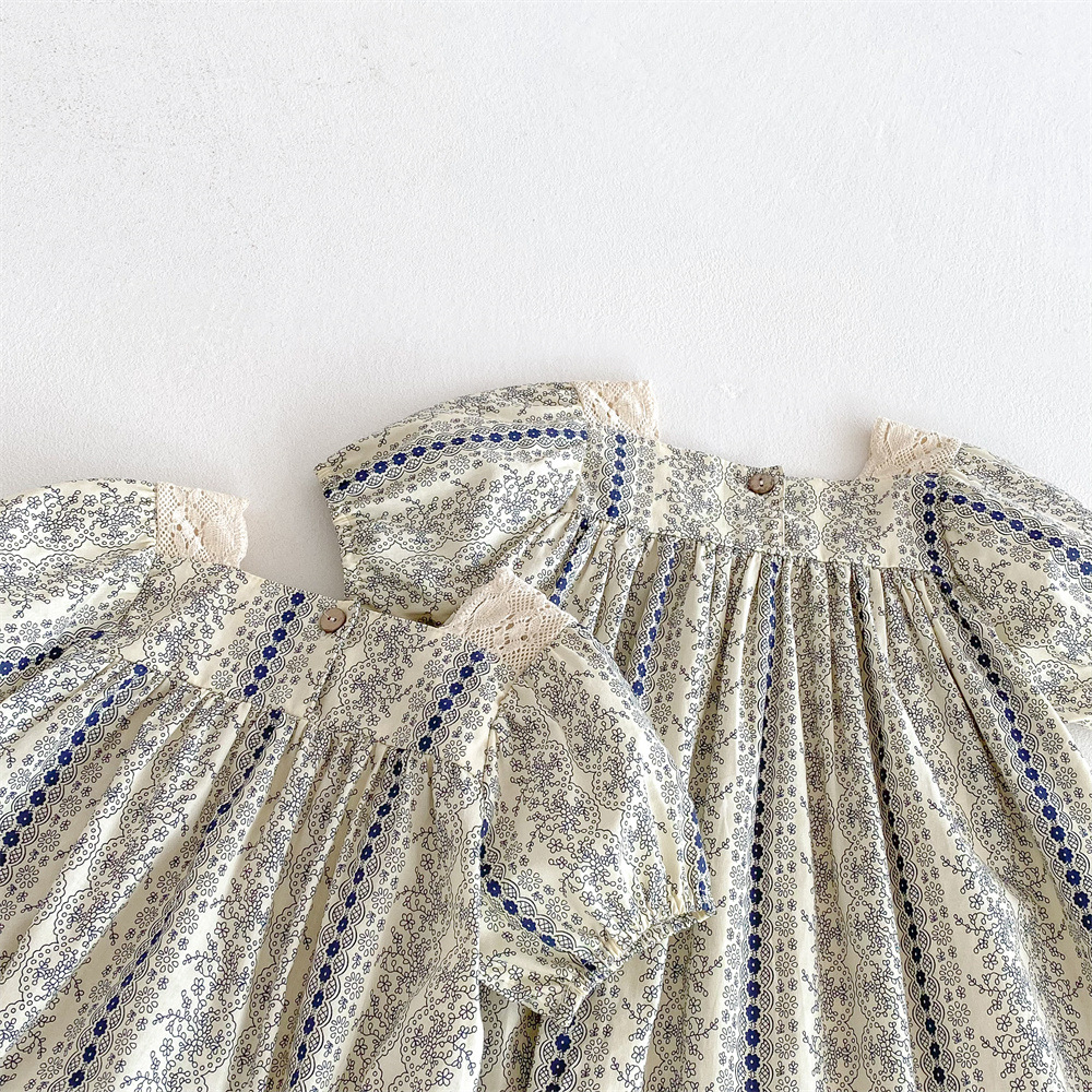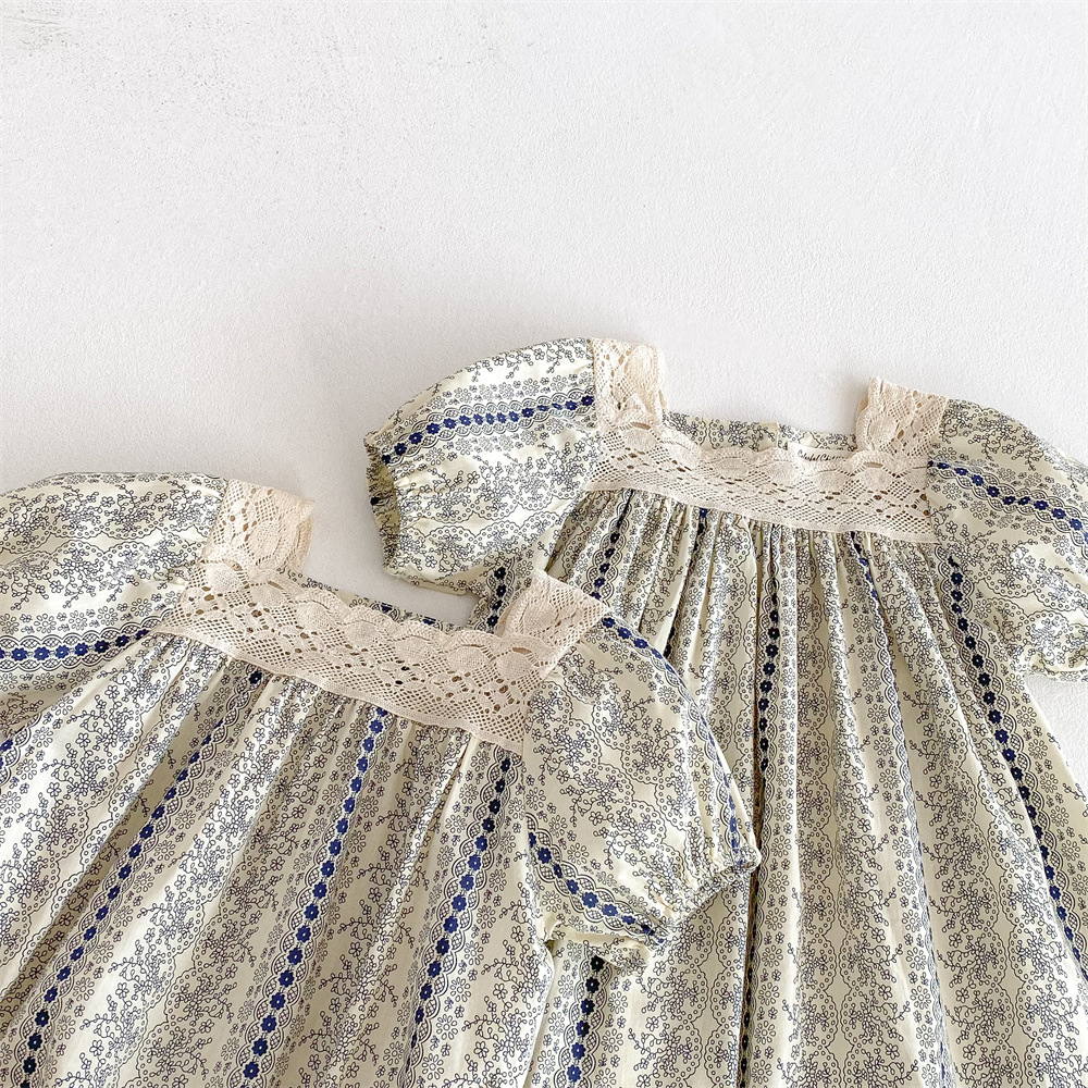 25 봄과 여름 아기 소녀 반팔 점프 수트 유아 등반 원피스 공주 꽃 레이스 원피스 자매