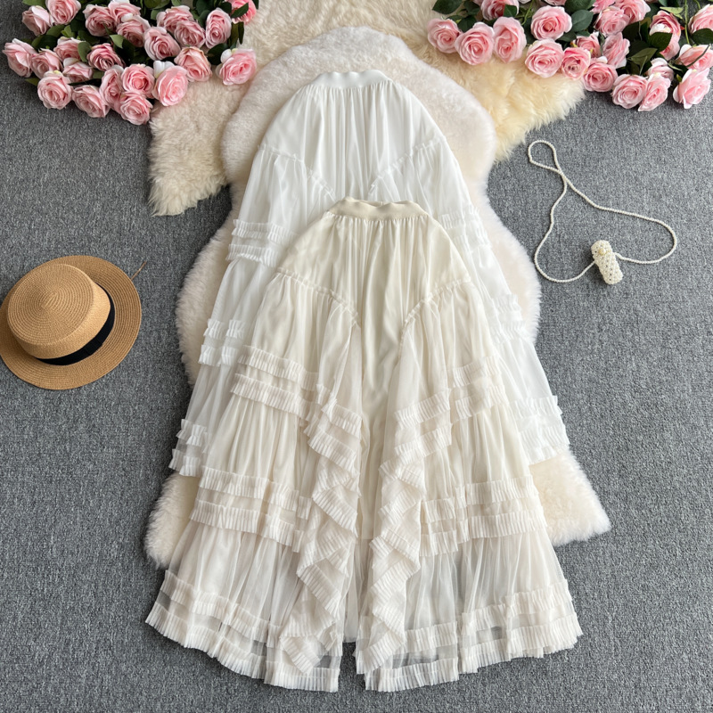 요정 불규칙한 치마 2025 여름 프랑스 디자인 스티칭 메쉬 푹신한 A 라인 대형 스윙 중간 길이 치마스토어 가기