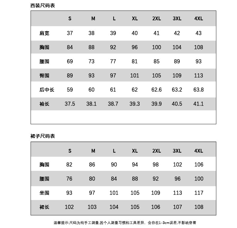 尺码均为平铺手工测量,有1-3厘米误差是正常现象。