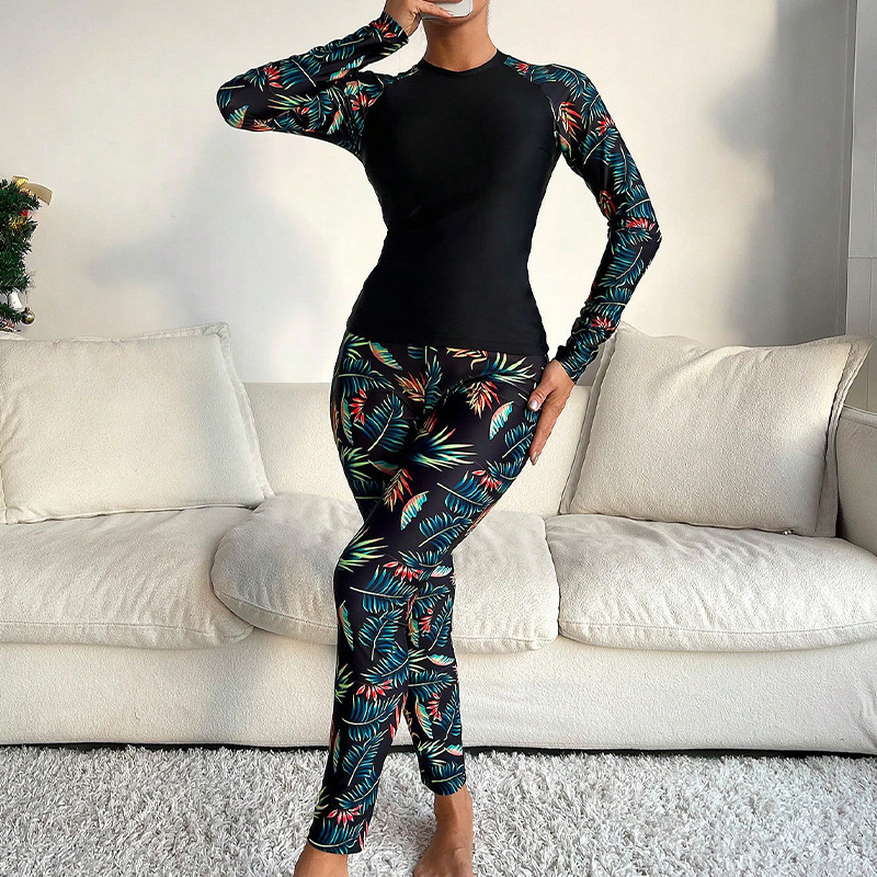 2025 새로운 유럽과 미국의 인쇄 긴팔 보수적 인 원피스 수영복 여성 아마존 비치 비키니 온천 수영복